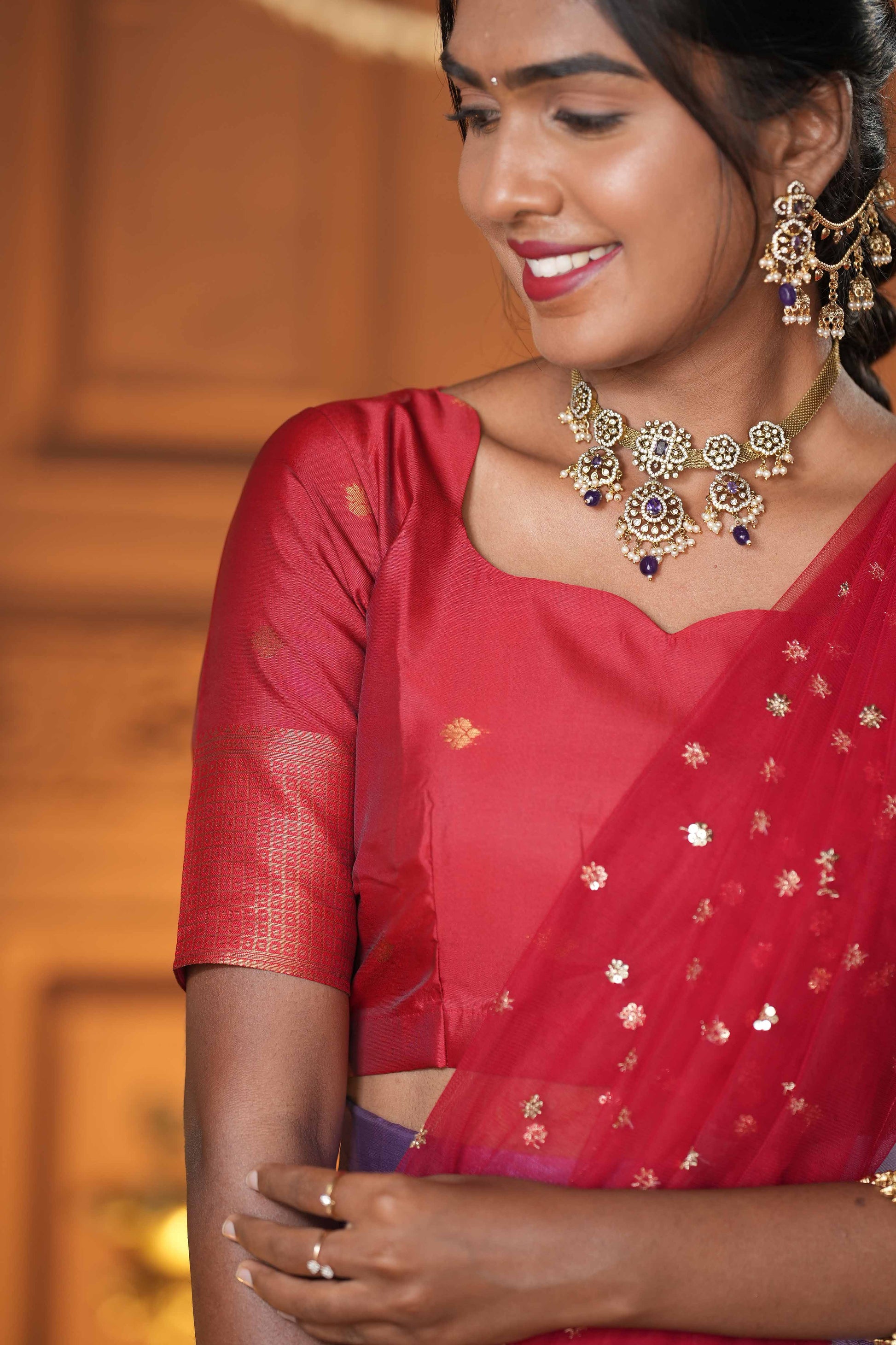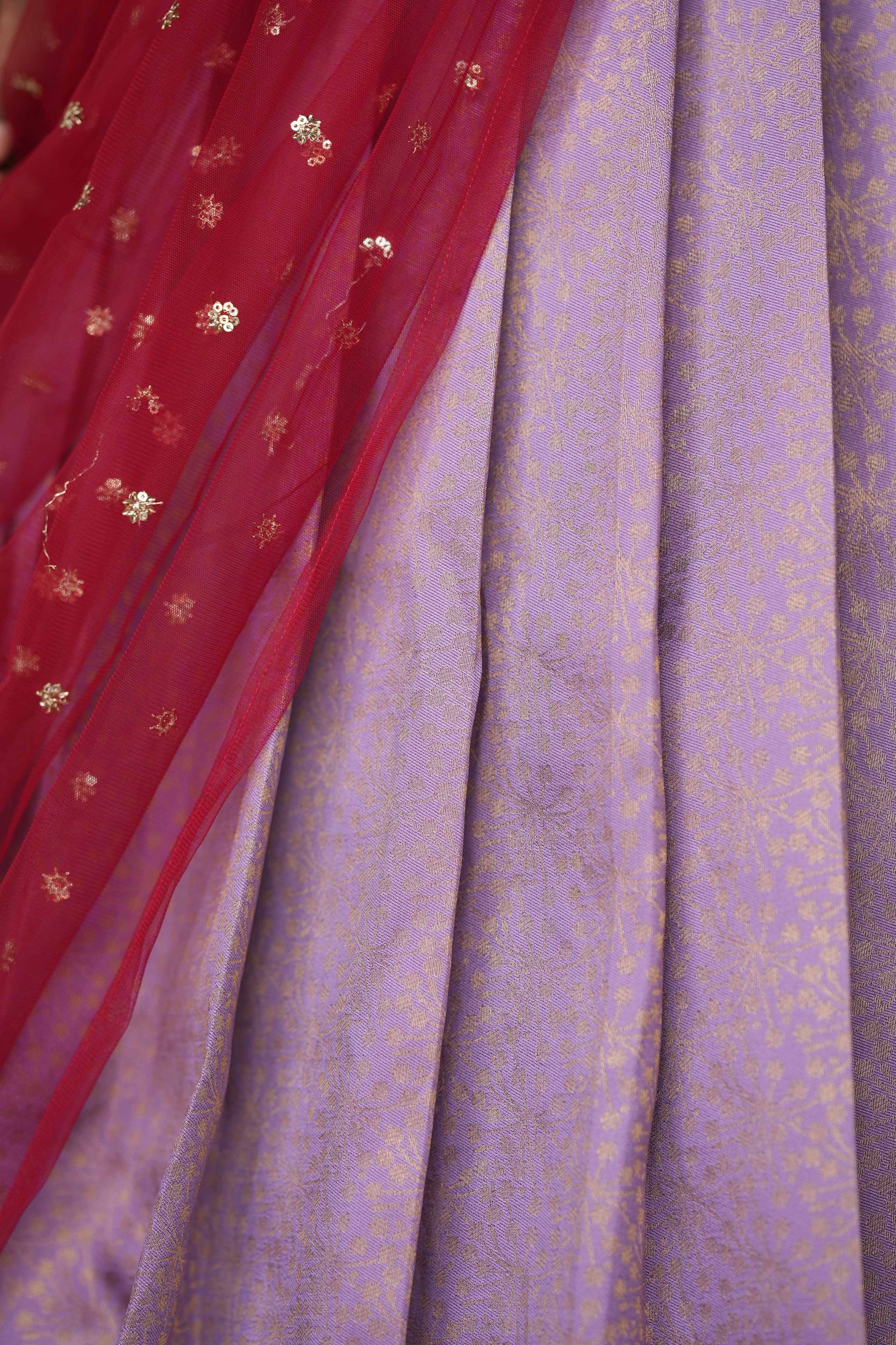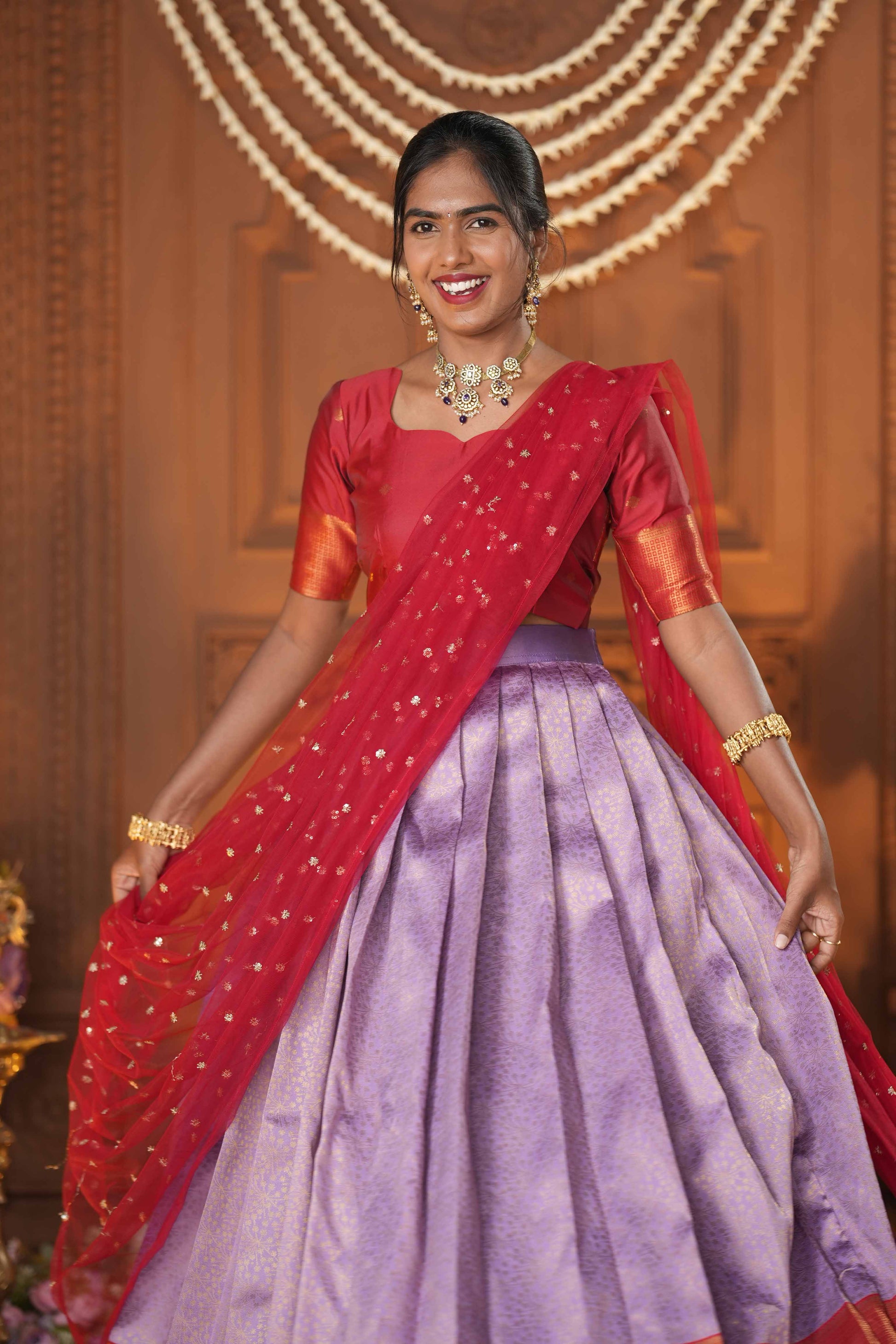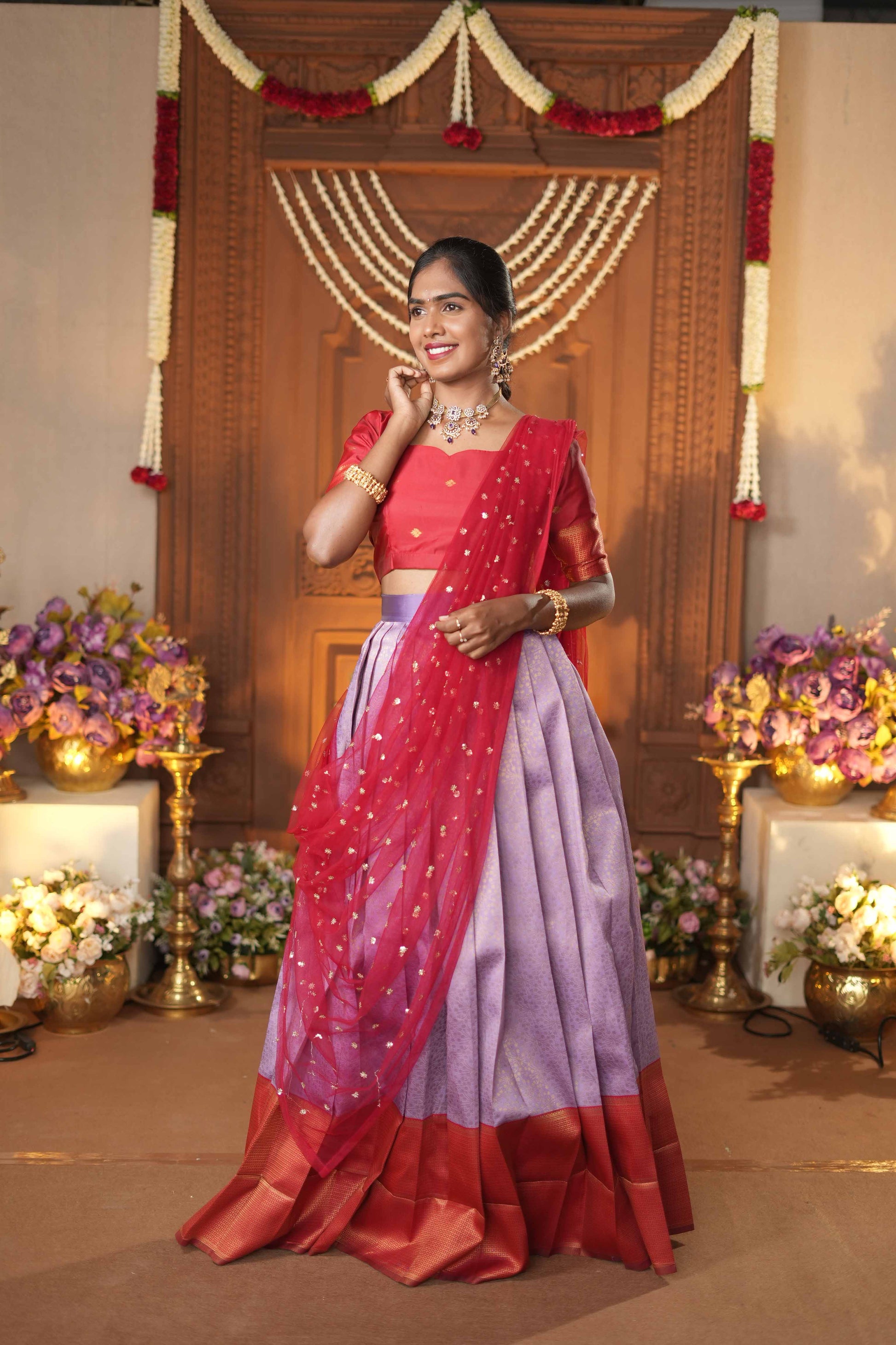 Celebrate every festive moment in the Aaral half saree set, featuring a vibrant red top paired with a delicate lavender skirt. The ensemble is completed by a shimmering red dupatta that adds a touch of sparkle and charm. This playful combination effortlessly blends tradition with a dash of fun, perfect for dancing and festivities.