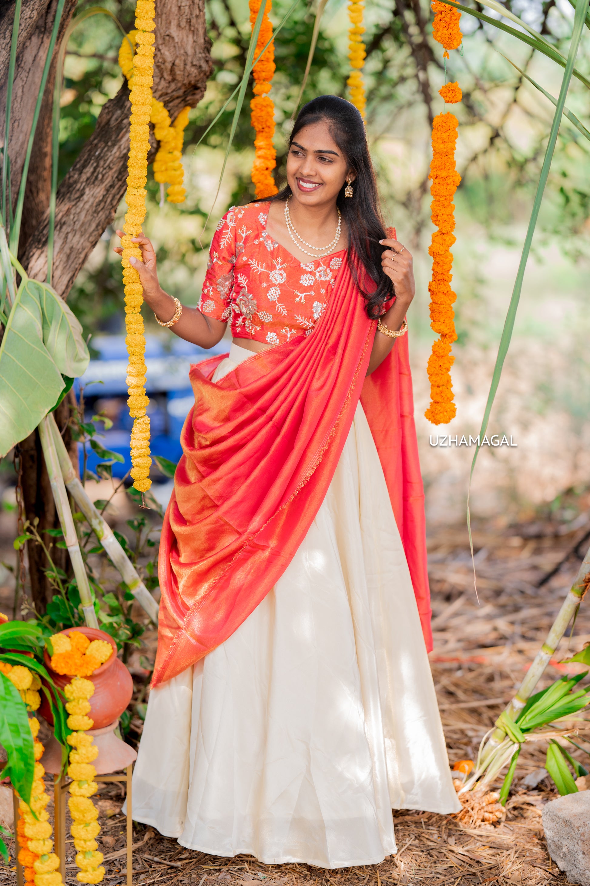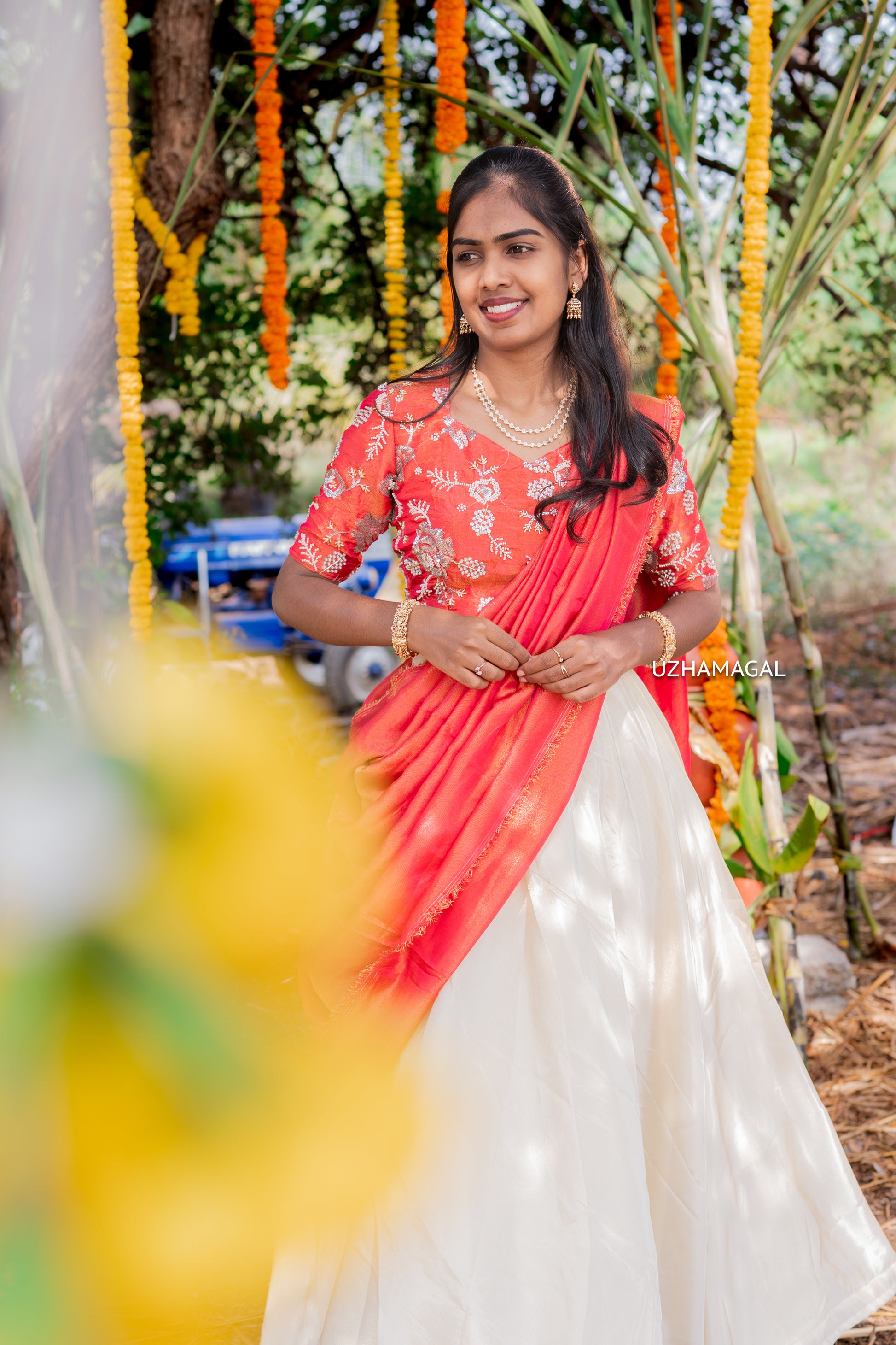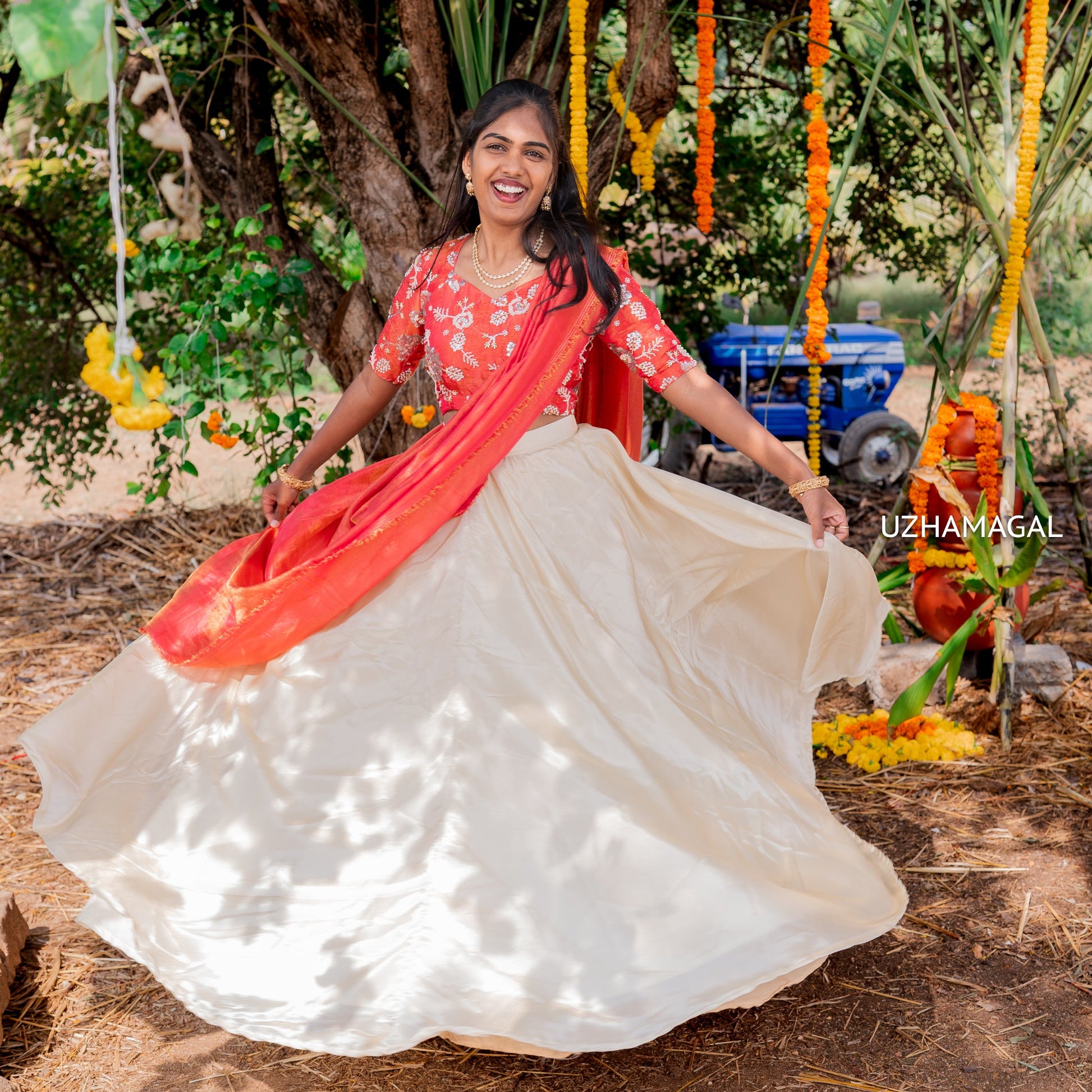 Step into celebration with the Venbha half saree, a festival favourite in an enchanting white and red colour blend. Perfect for weddings, temple visits, and cultural festivities, this half saree combines traditional craftsmanship with a design that makes you feel confident and cherished!! Fully Flared skirt and Aari work with Traditional Finish!!