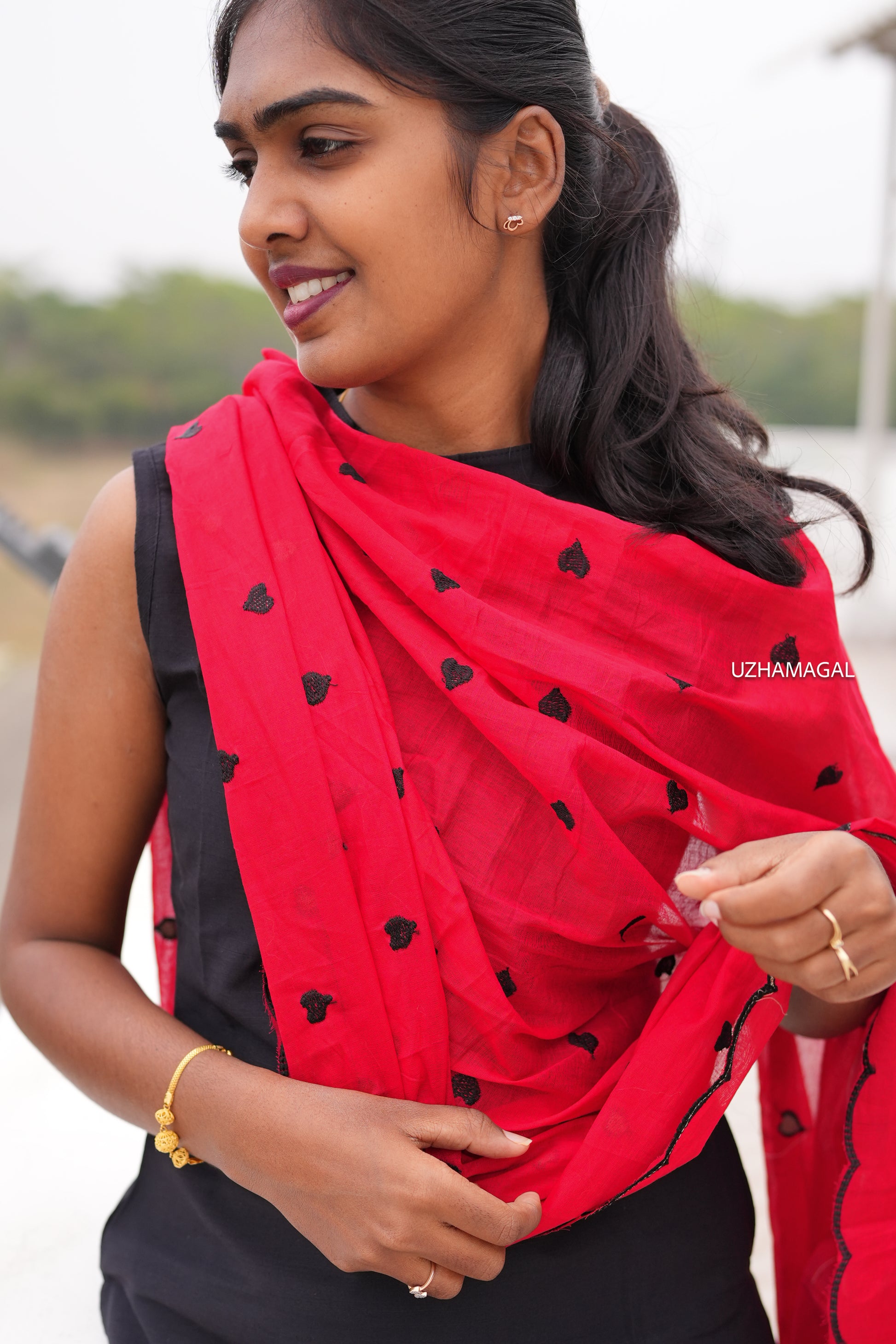 Damini brings effortless elegance to your everyday wardrobe with this three-piece ensemble. Crafted from soft cotton fabric with matching lining, this kurti, pant, and dupatta set delivers comfort without compromising on style. The striking black kurti paired with a vibrant red dupatta creates a distinctive look perfect for casual outing.