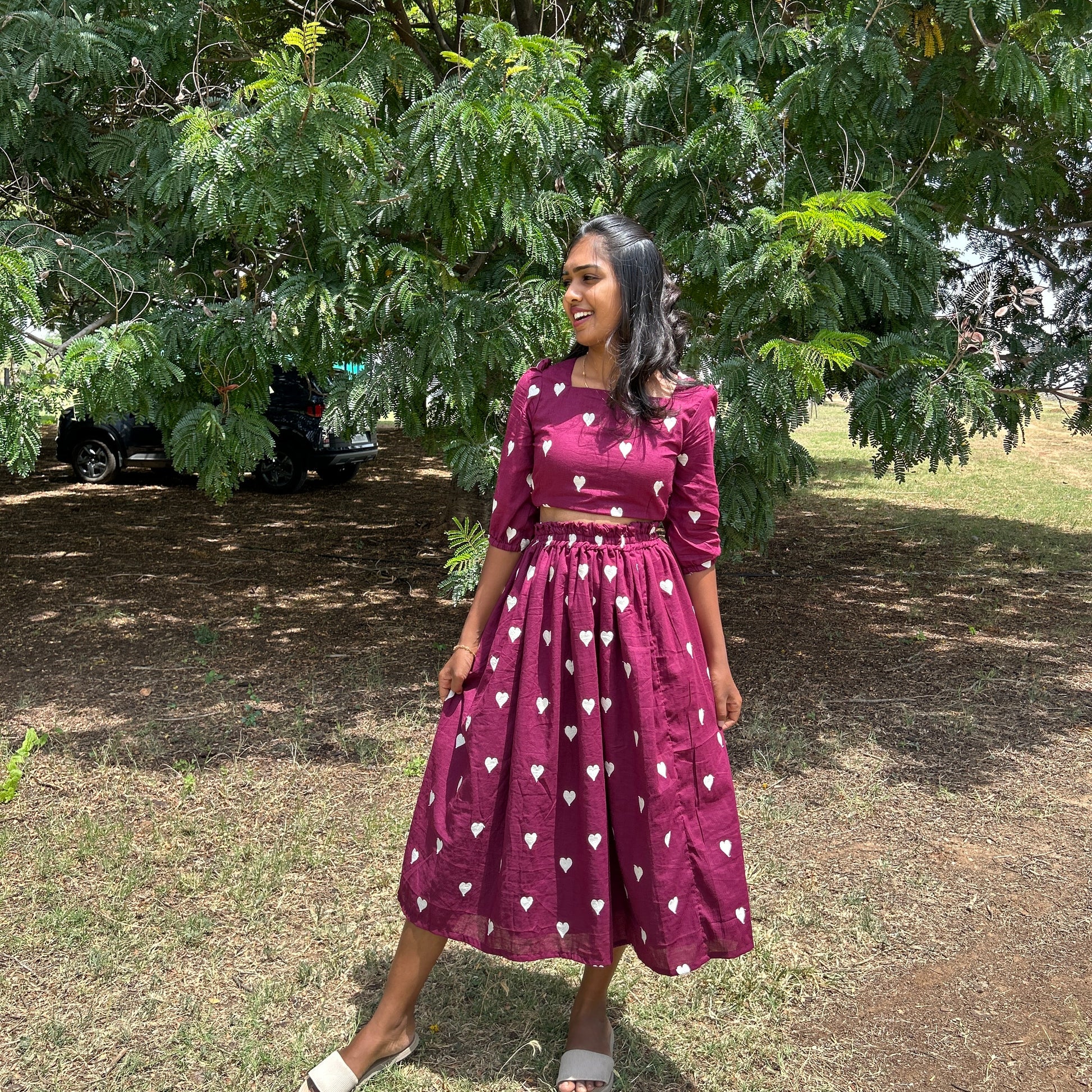 Get ready to wine and dine in style with our Dipped in Wine Skirt Set. This unique and stylish set features a heart embroidered detail, making it a pretty addition to any wardrobe. Perfect for a fun night out or a playful day look. Cheers to fashion!
