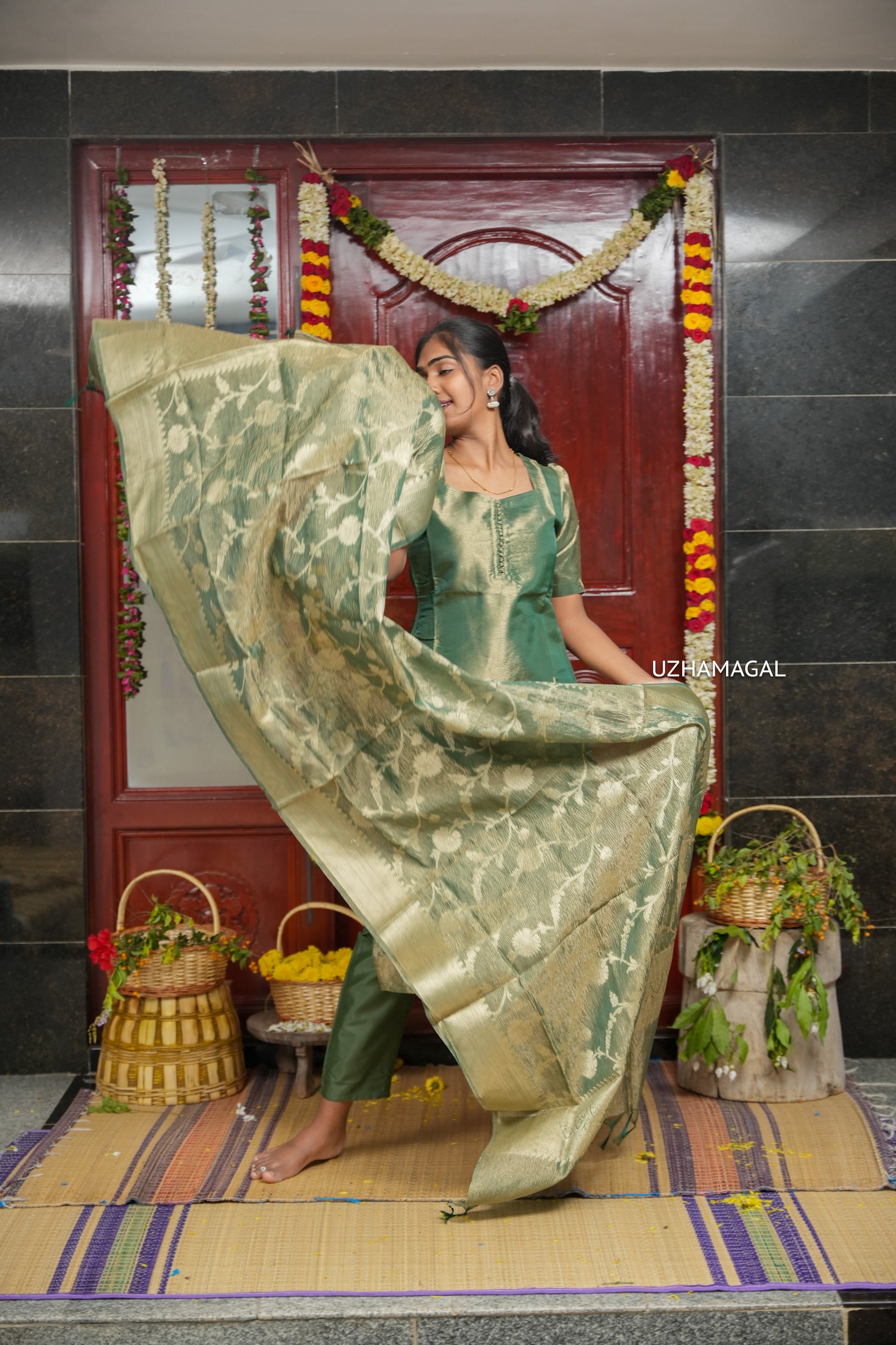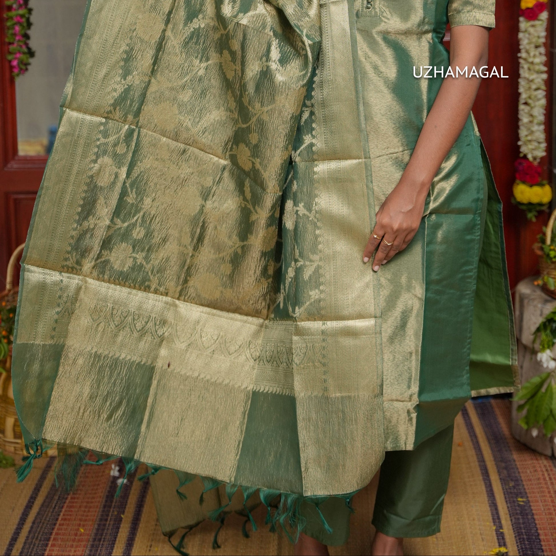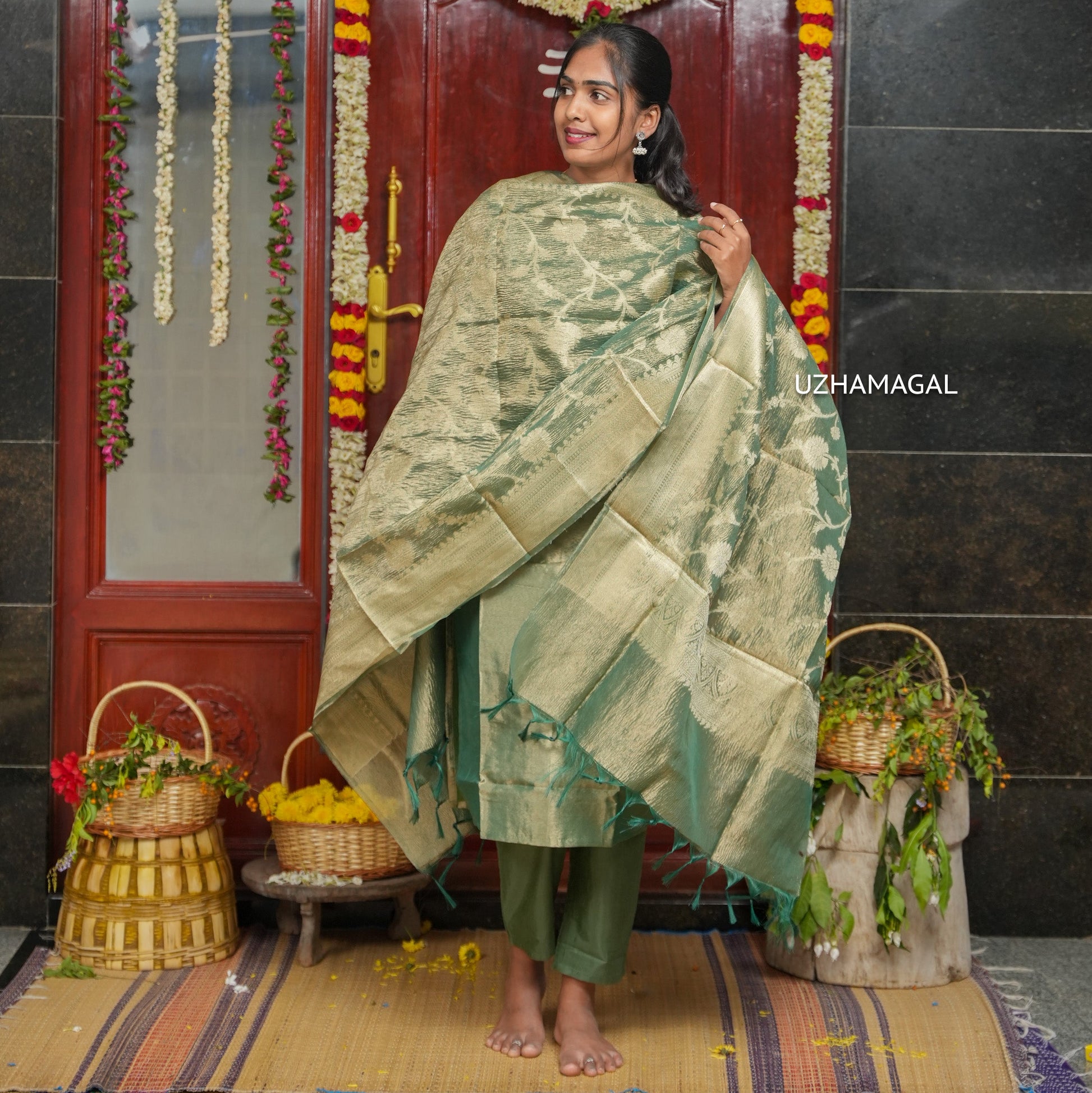 Embrace timeless elegance with this stunning ethnic tissue green kurti set, crafted for those special moments that call for grace and tradition. The rich emerald hue radiates sophistication, while the lightweight tissue fabric ensures comfort throughout your day. Paired with an exquisite zari-embellished tissue dupatta.