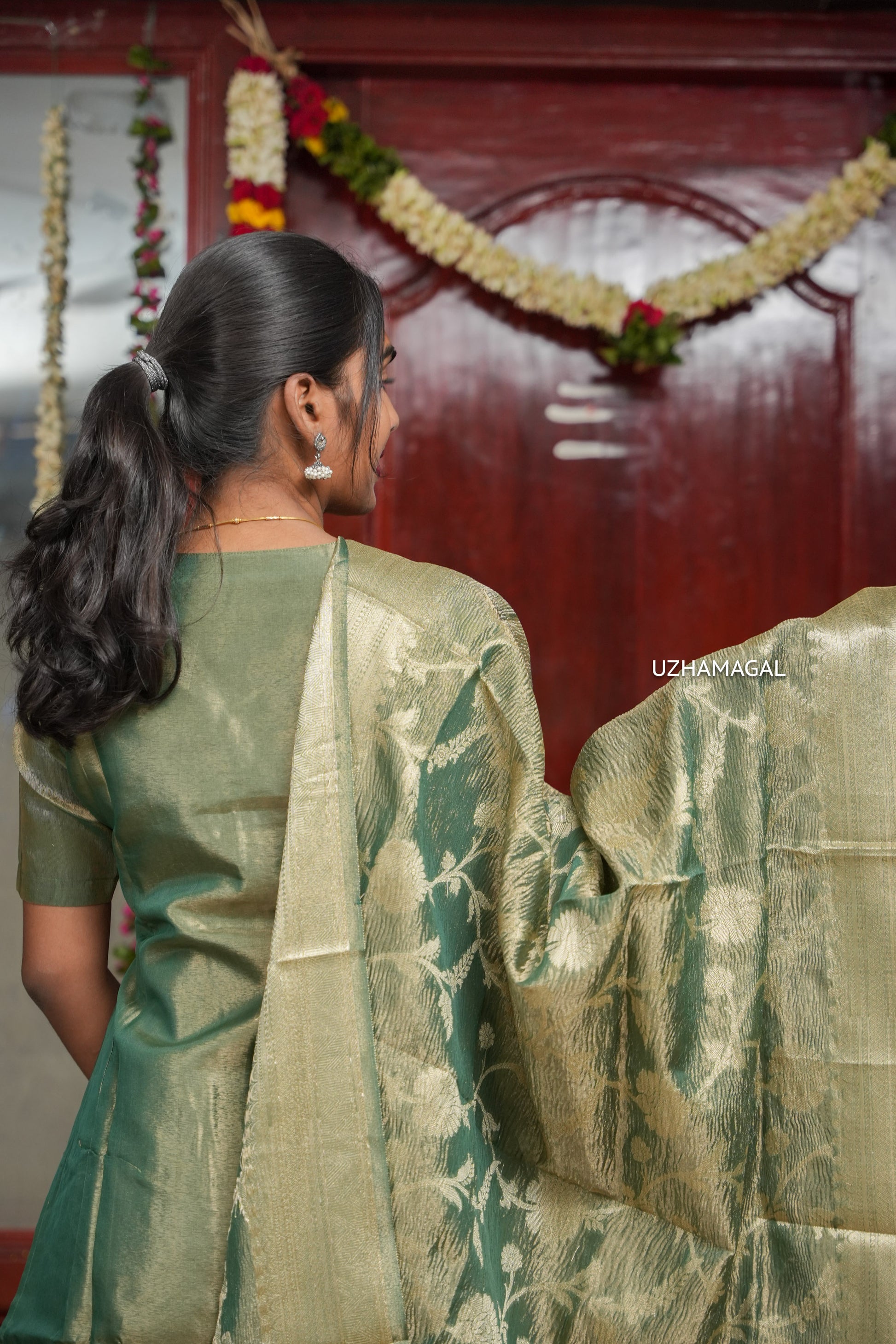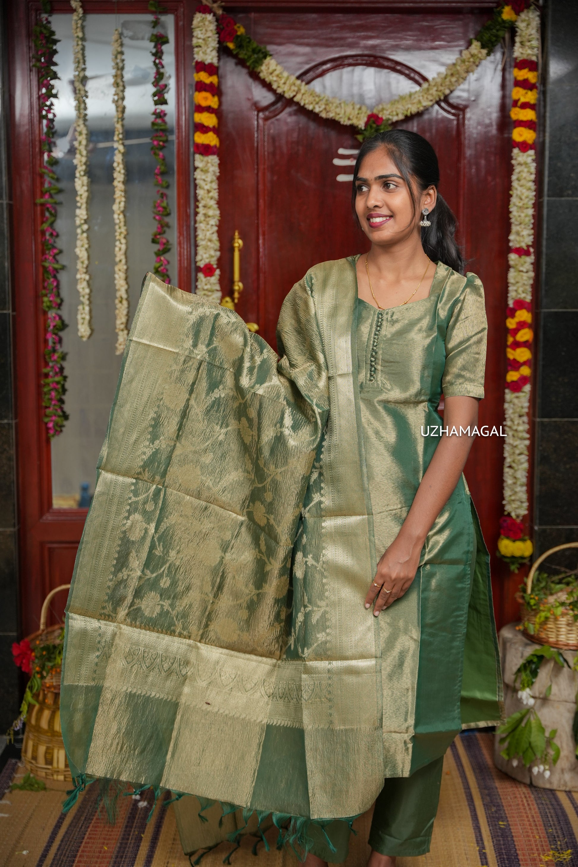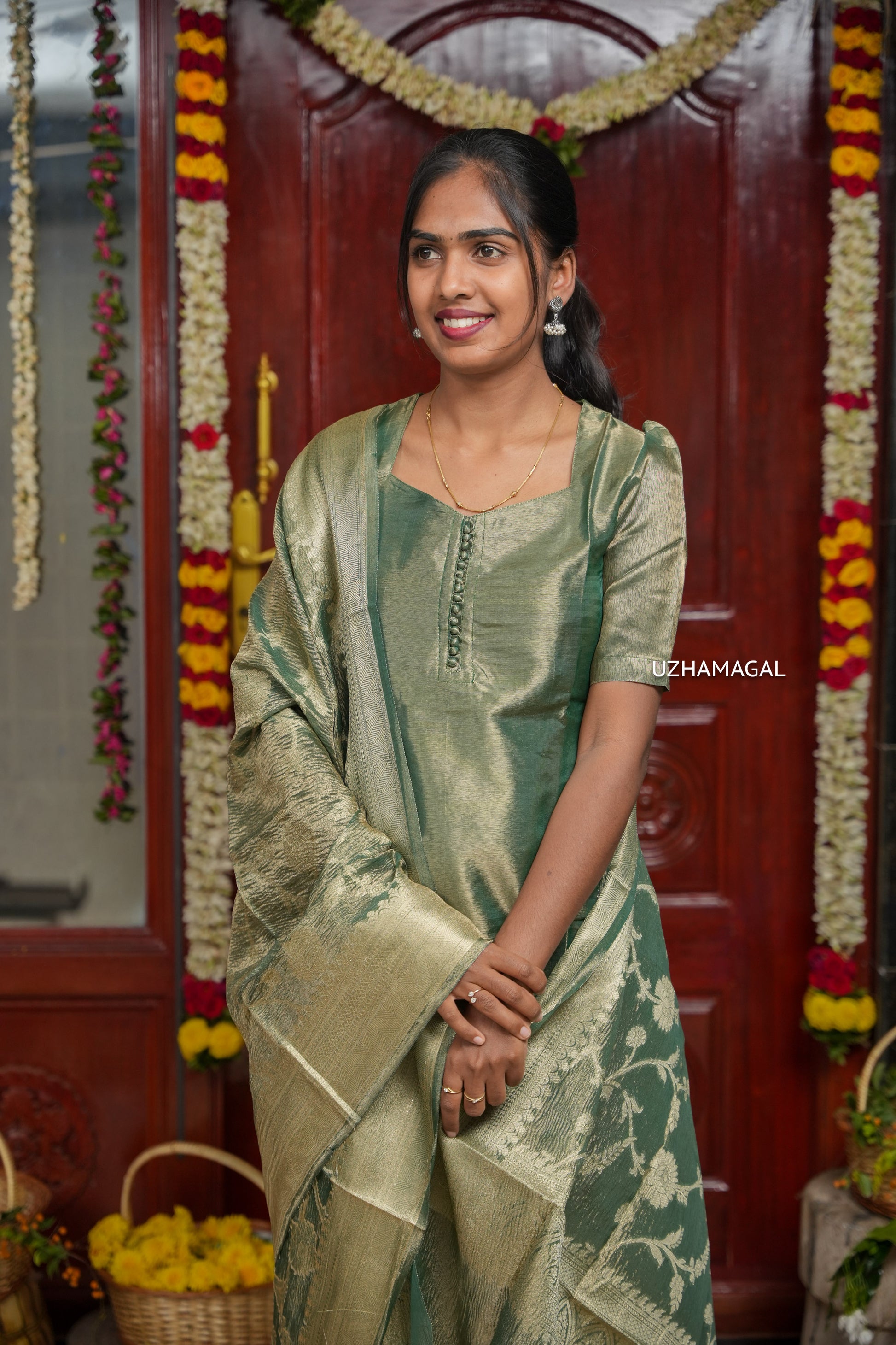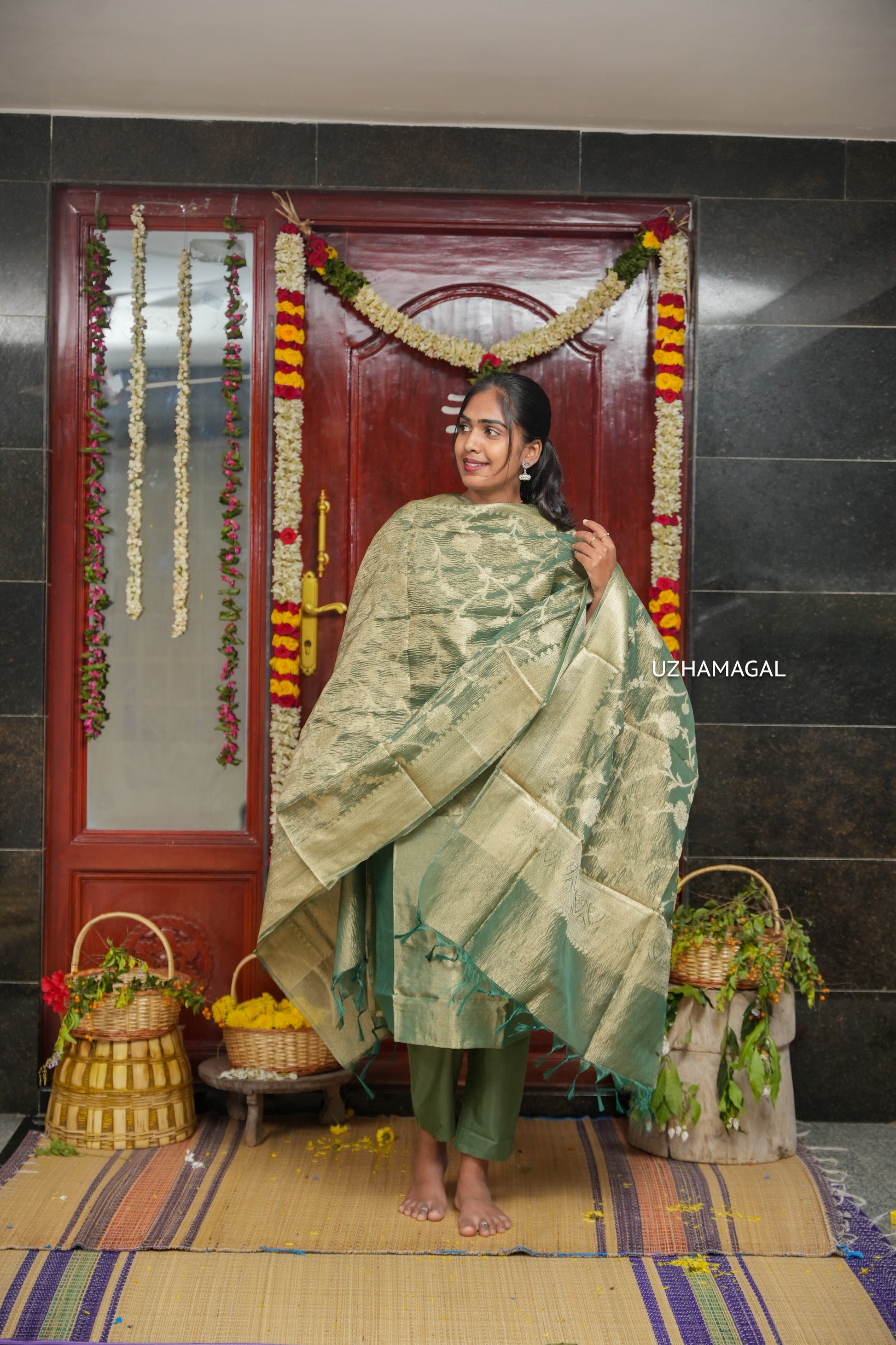 Embrace timeless elegance with this stunning ethnic tissue green kurti set, crafted for those special moments that call for grace and tradition. The rich emerald hue radiates sophistication, while the lightweight tissue fabric ensures comfort throughout your day. Paired with an exquisite zari-embellished tissue dupatta.