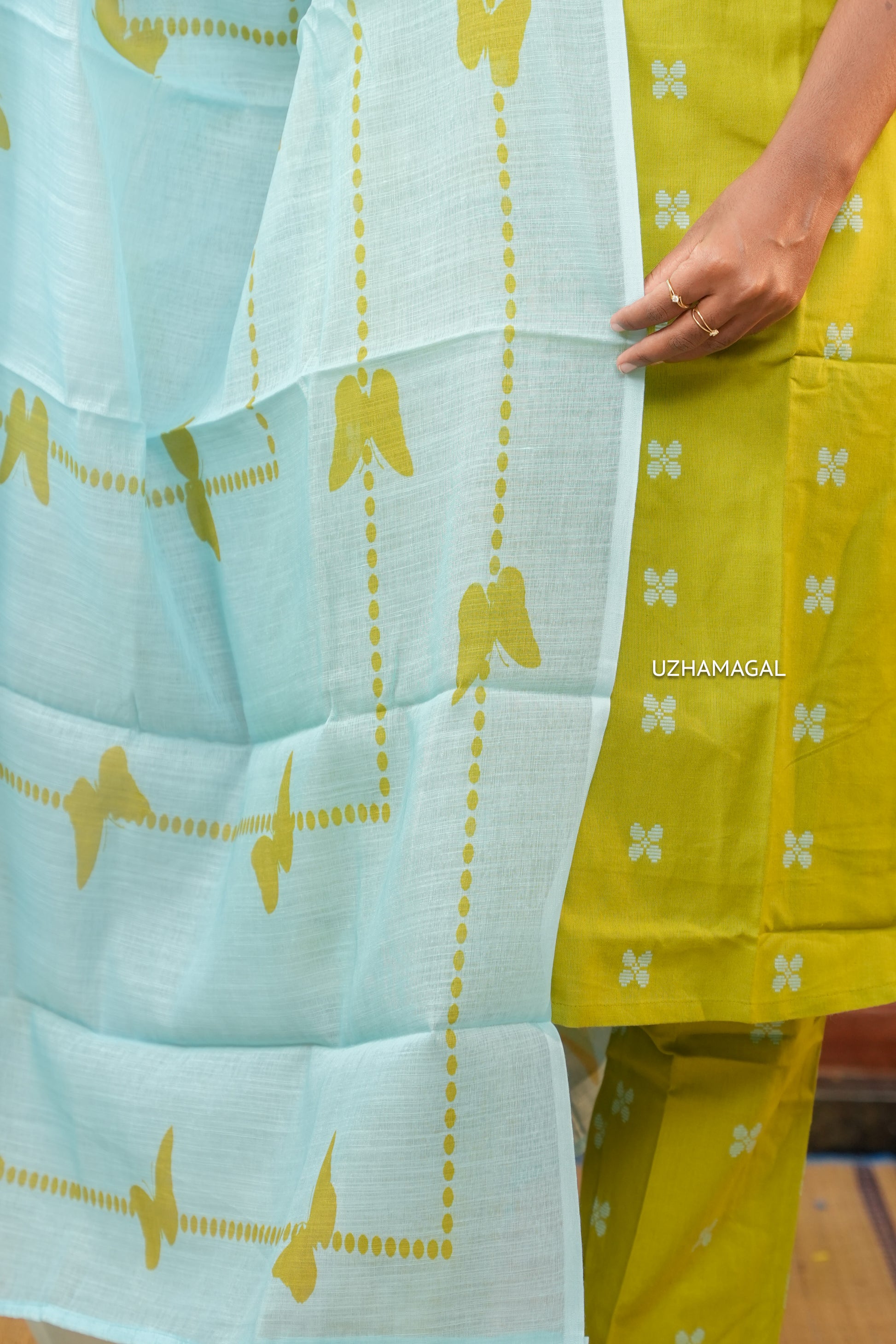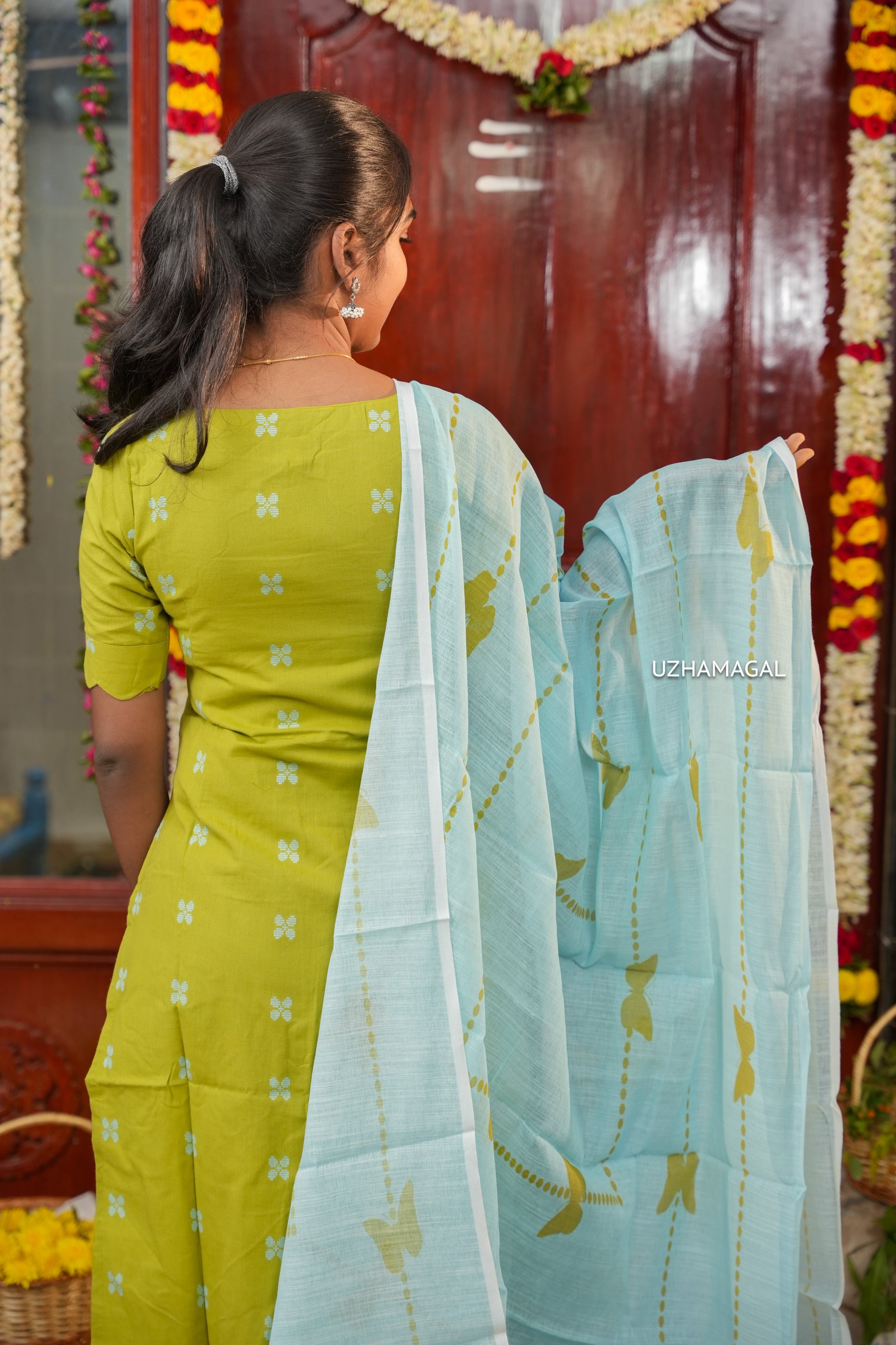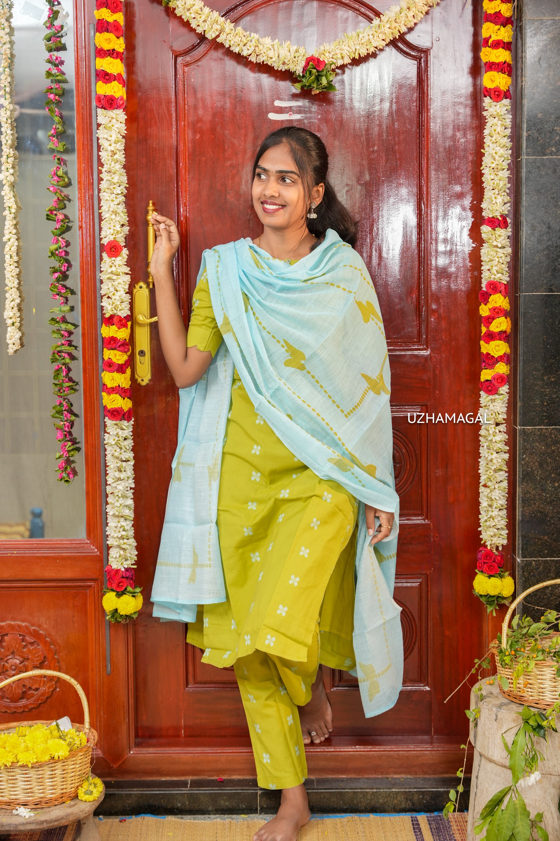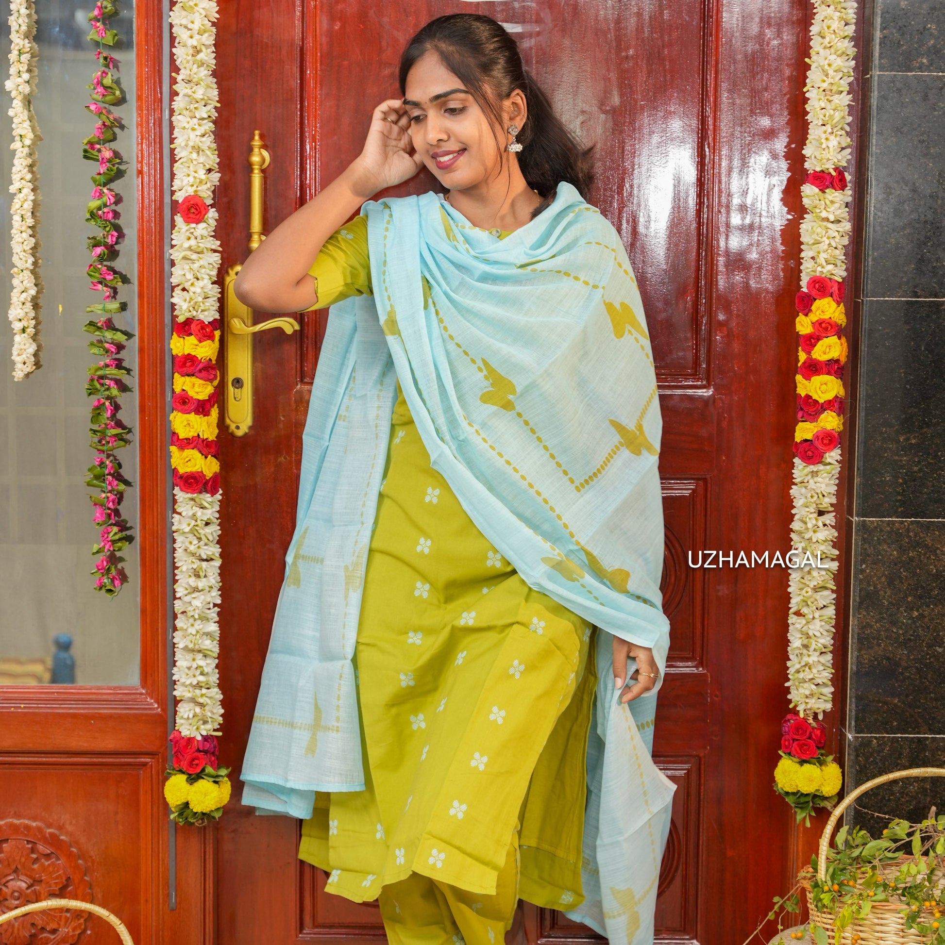 Embrace effortless elegance with this Garden Dew kurti set, featuring a graceful green kurti paired with a complementary light blue dupatta. Crafted from premium soft cotton, this ensemble offers the comfort you deserve for everyday wear and office settings. The breathable fabric keeps you cool and comfortable throughout the day.