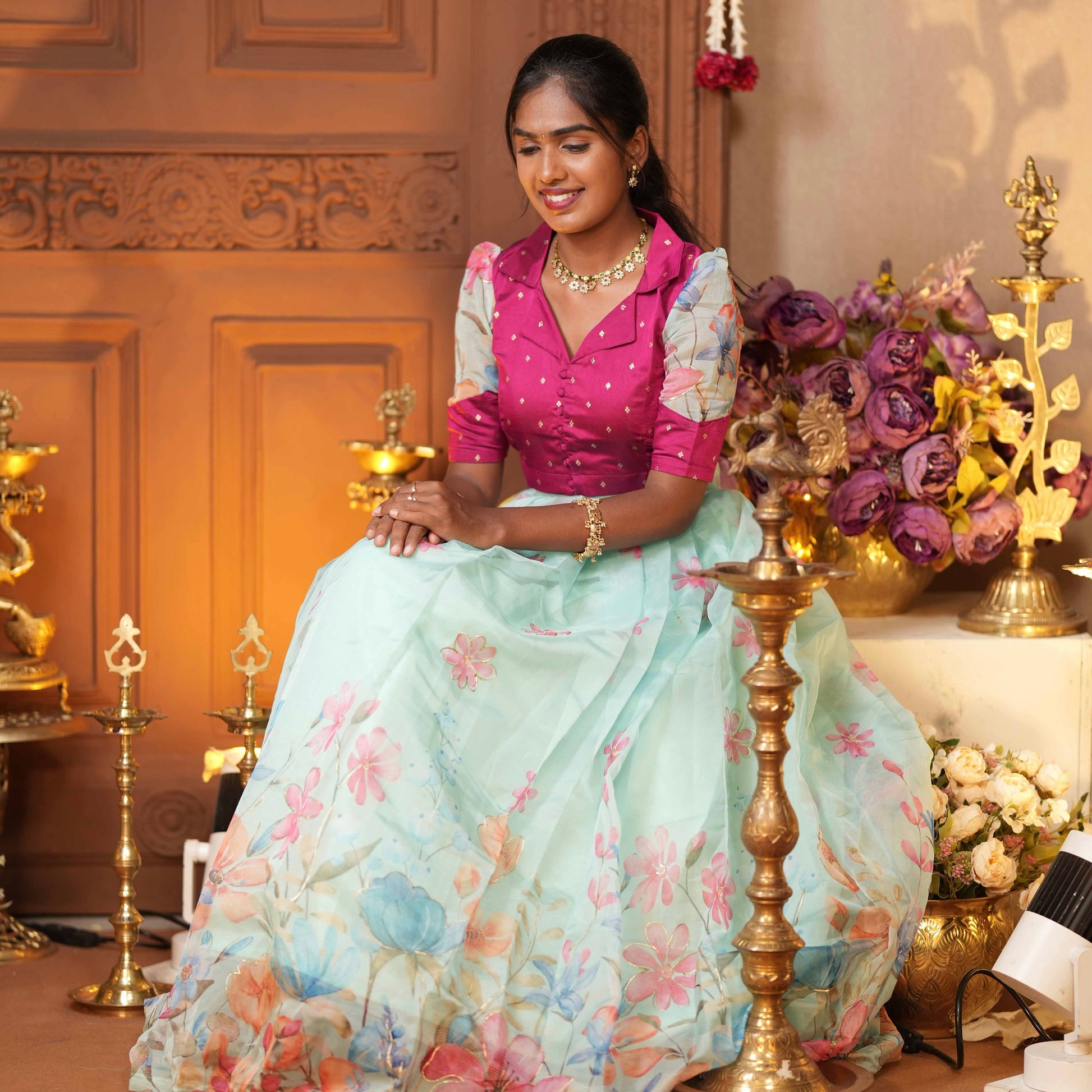 Introducing our versatile and stylish Inbha skirt set! Made with high quality tissue and organza fabric, and lined with soft cotton and crepe for ultimate comfort. The skirt and top combination comes in a beautiful dark pink and sky blue color scheme. Upgrade your wardrobe with this must-have set!