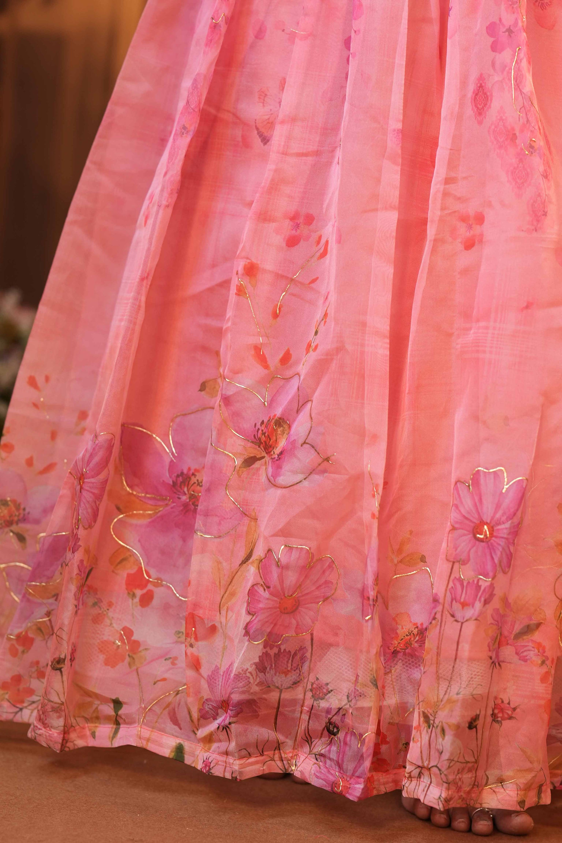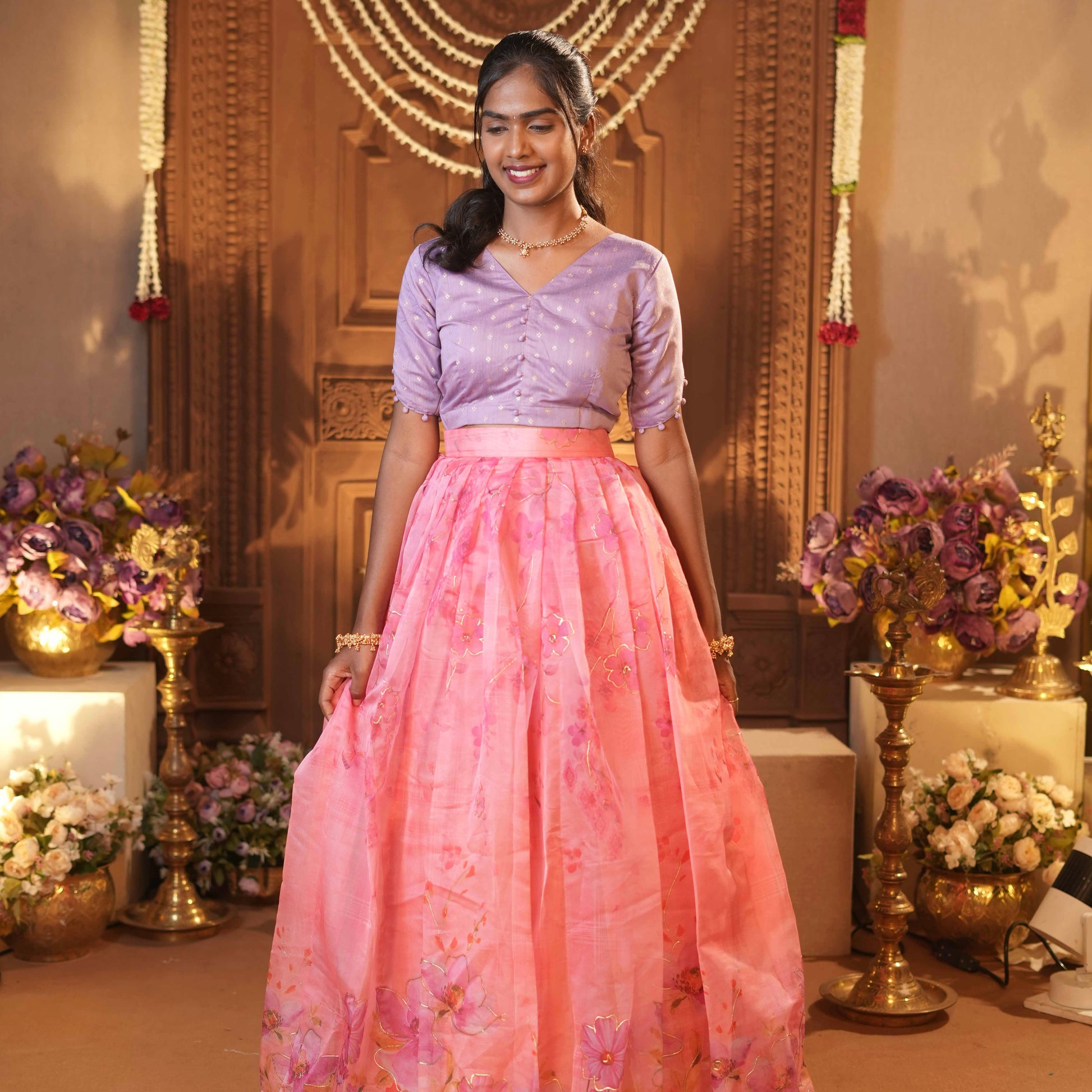 Introducing Iniya, a stunning outfit featuring a blend of tissue and organza fabric, lined with soft cotton and crepe for maximum comfort. The elegant skirt and top design combines shades of lavender and pink, creating a captivating look. Expertly crafted with a professional touch, perfect for any occasion.