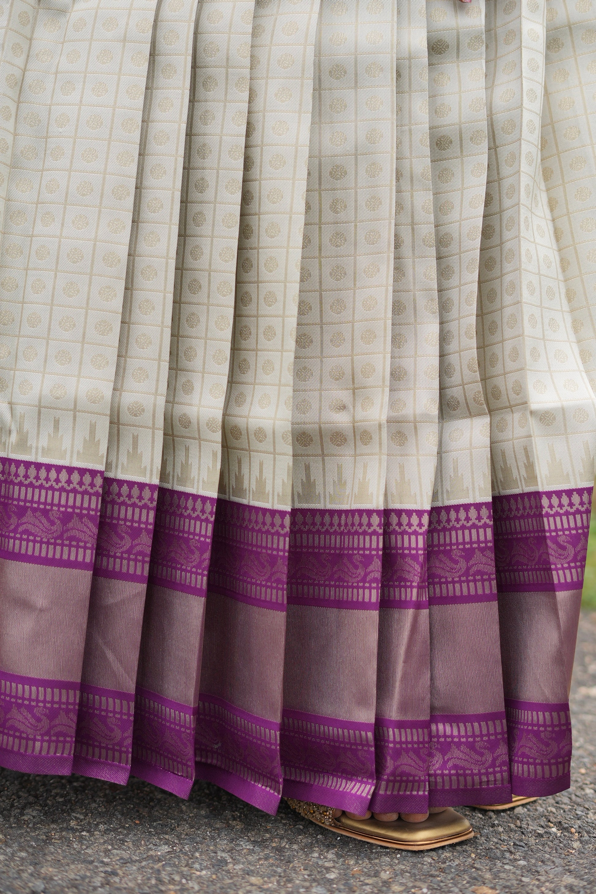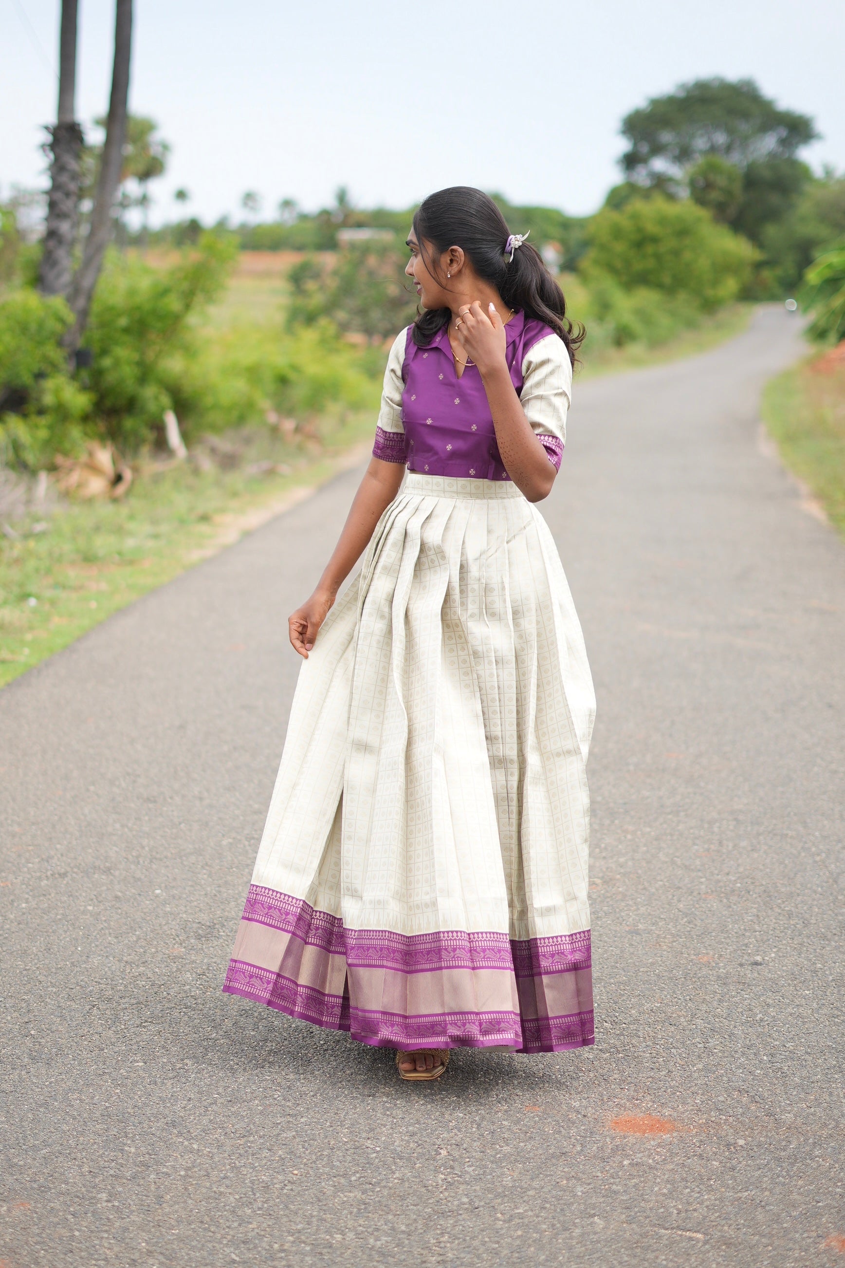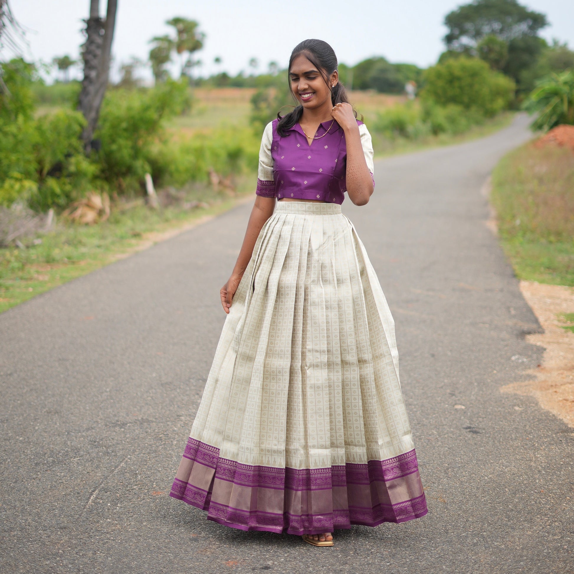 Channel soft elegance with the Lavender Moon Set, a rich silk skirt and top in a creamery beige hue with lavender borders. The structured purple blouse adds definition, while the cotton lining ensures comfort. Choose between skirt-top or stitched dress style for a customized experience without alterations.