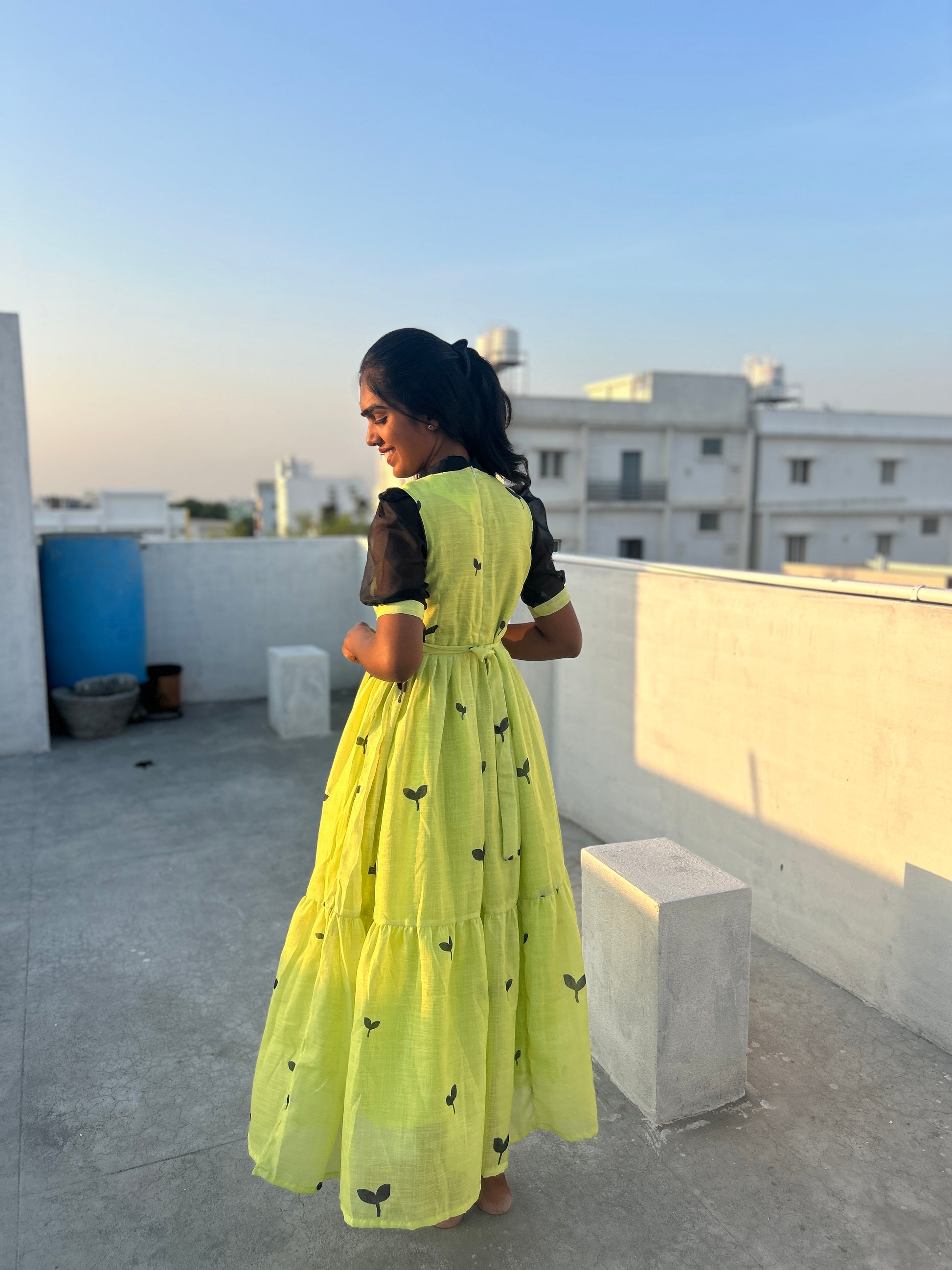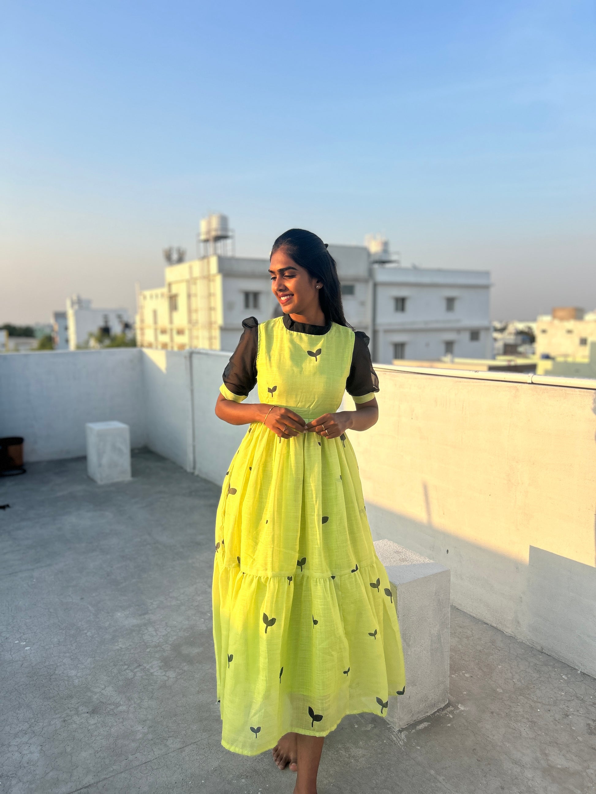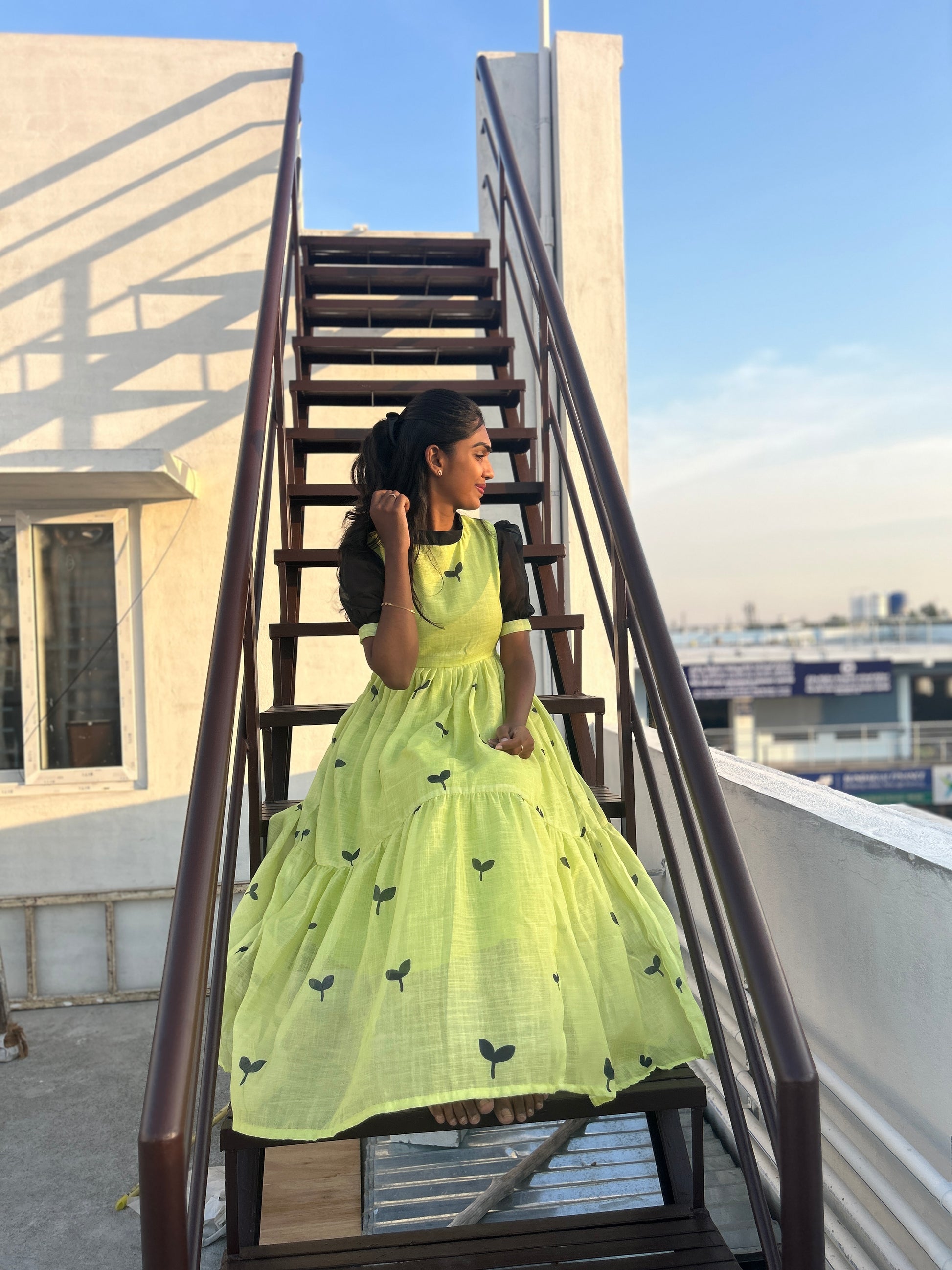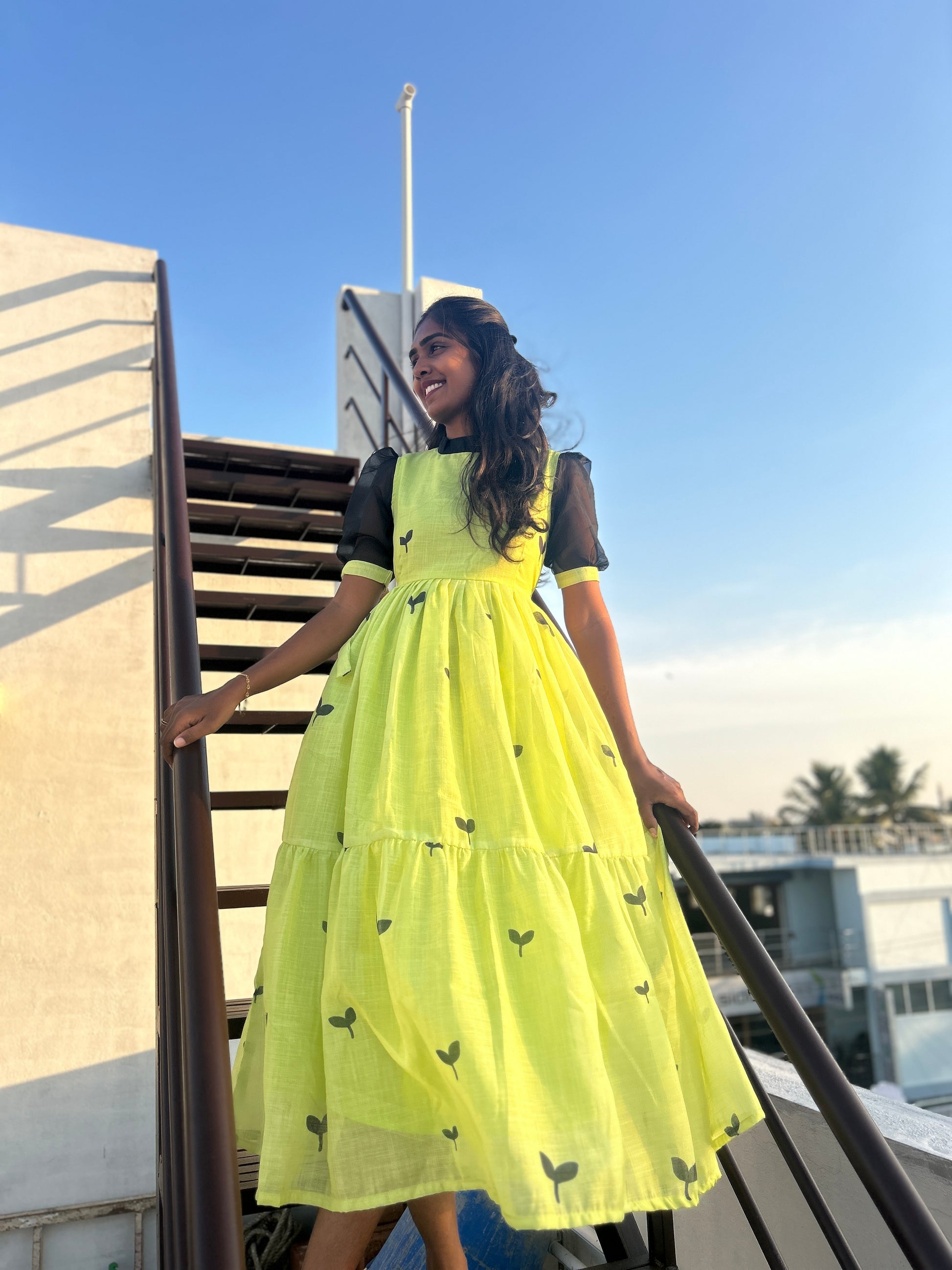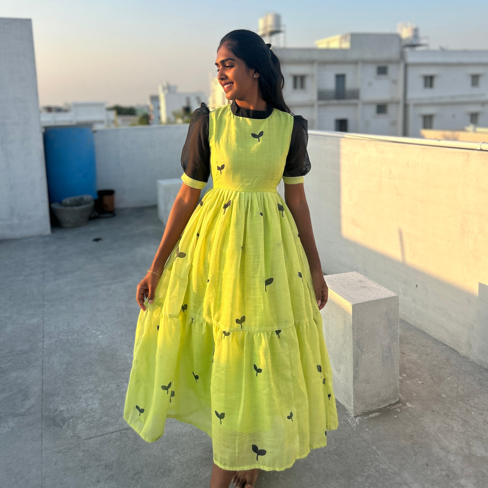 Step out in style with our Leafy Lime dress! The contrasting color of lime green and black create a stunning and eye-catching look. Made from high-quality materials, this dress is not only pretty but also comfortable to wear. Elevate your wardrobe with this must-have piece.