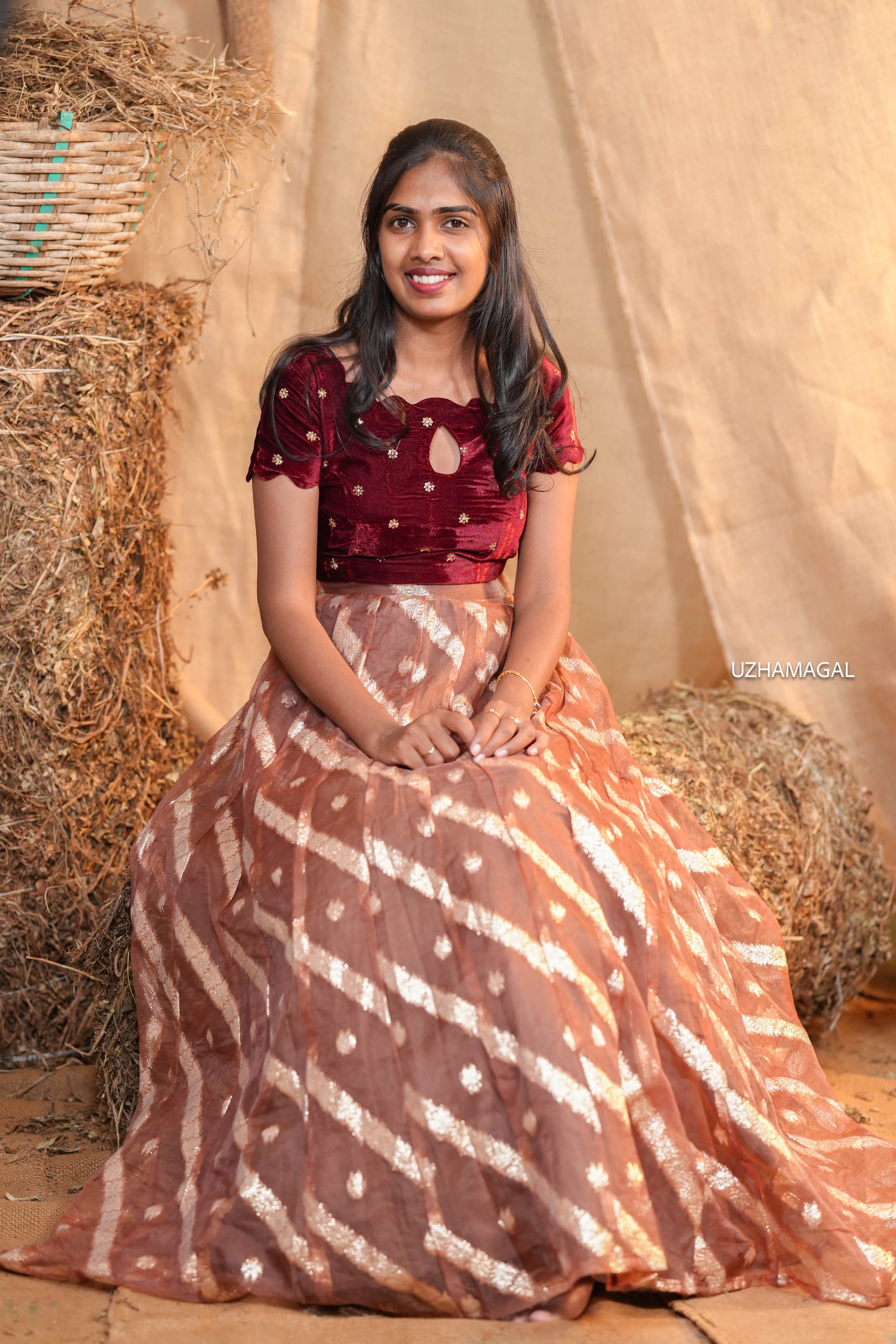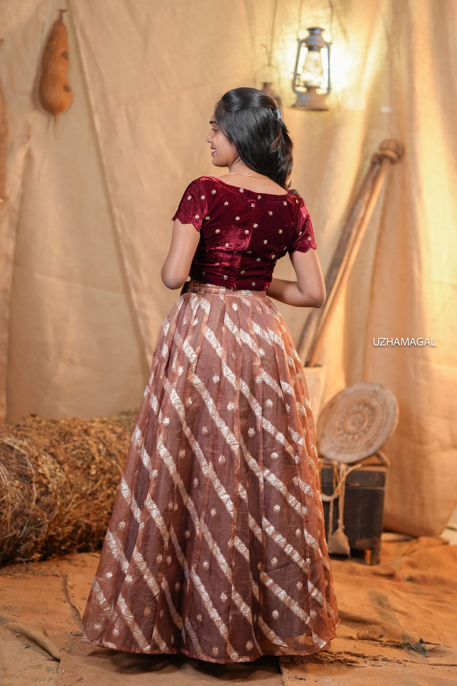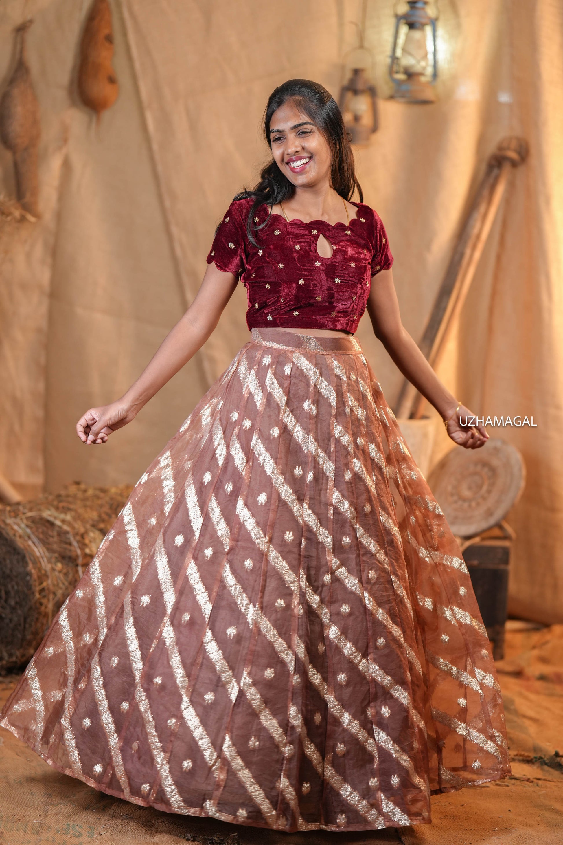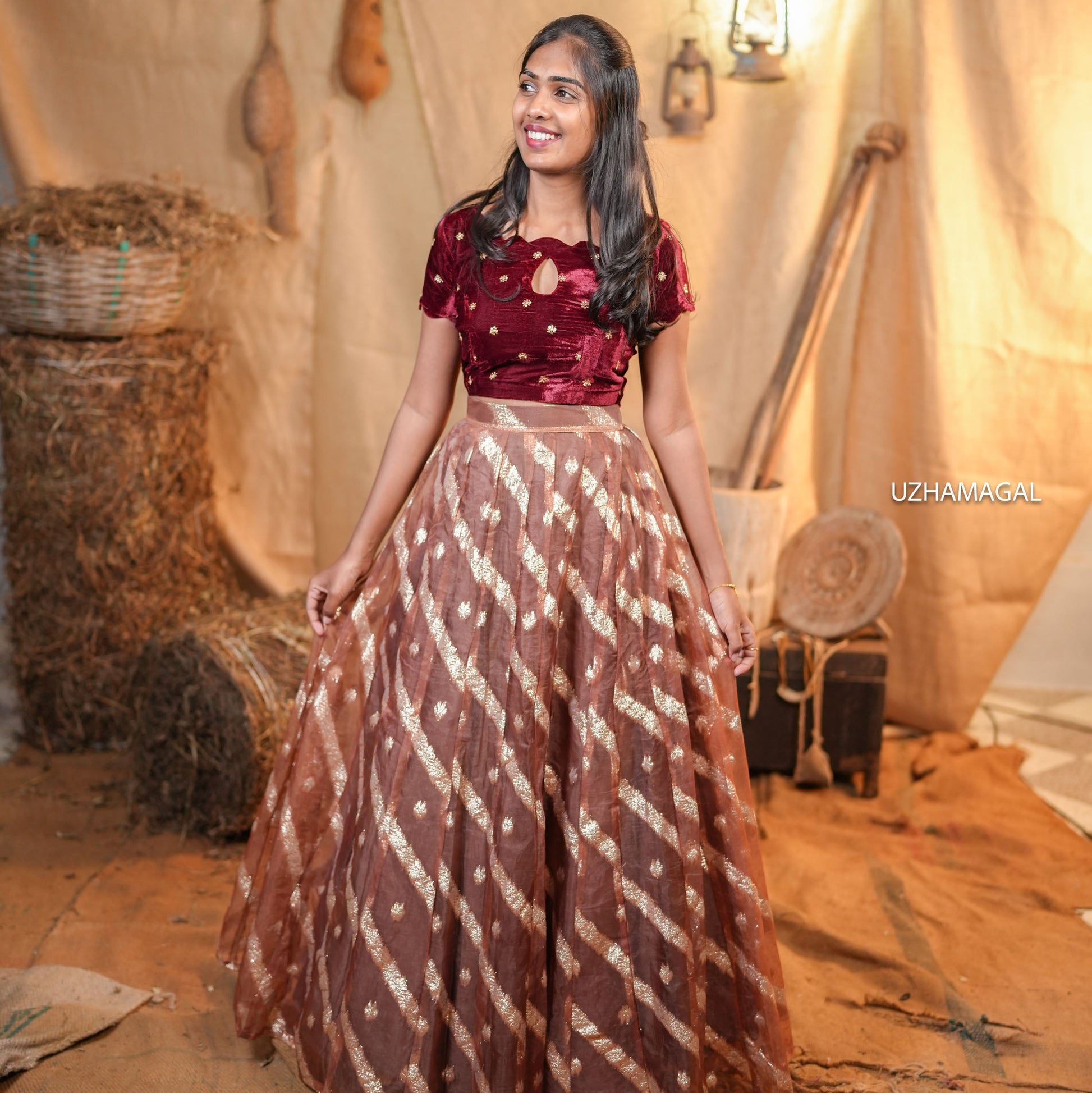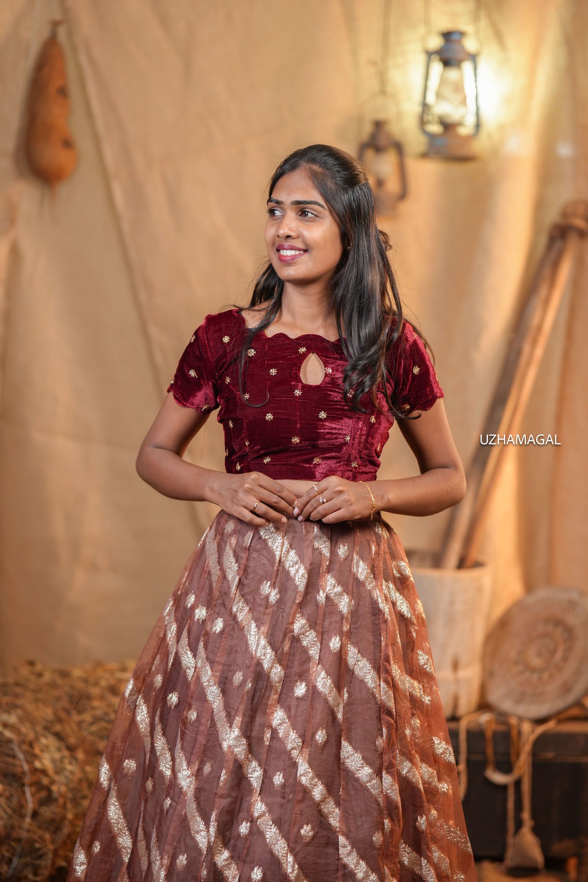Elevate your ethnic wardrobe with this stunning Mugil ensemble from our velvet collection. The rich maroon top pairs beautifully with a warm brownish skirt, creating a sophisticated and eye-catching look perfect for celebrations and special occasions. Crafted from luxurious velvet fabric, this two-piece set offers both comfort and elegance.!