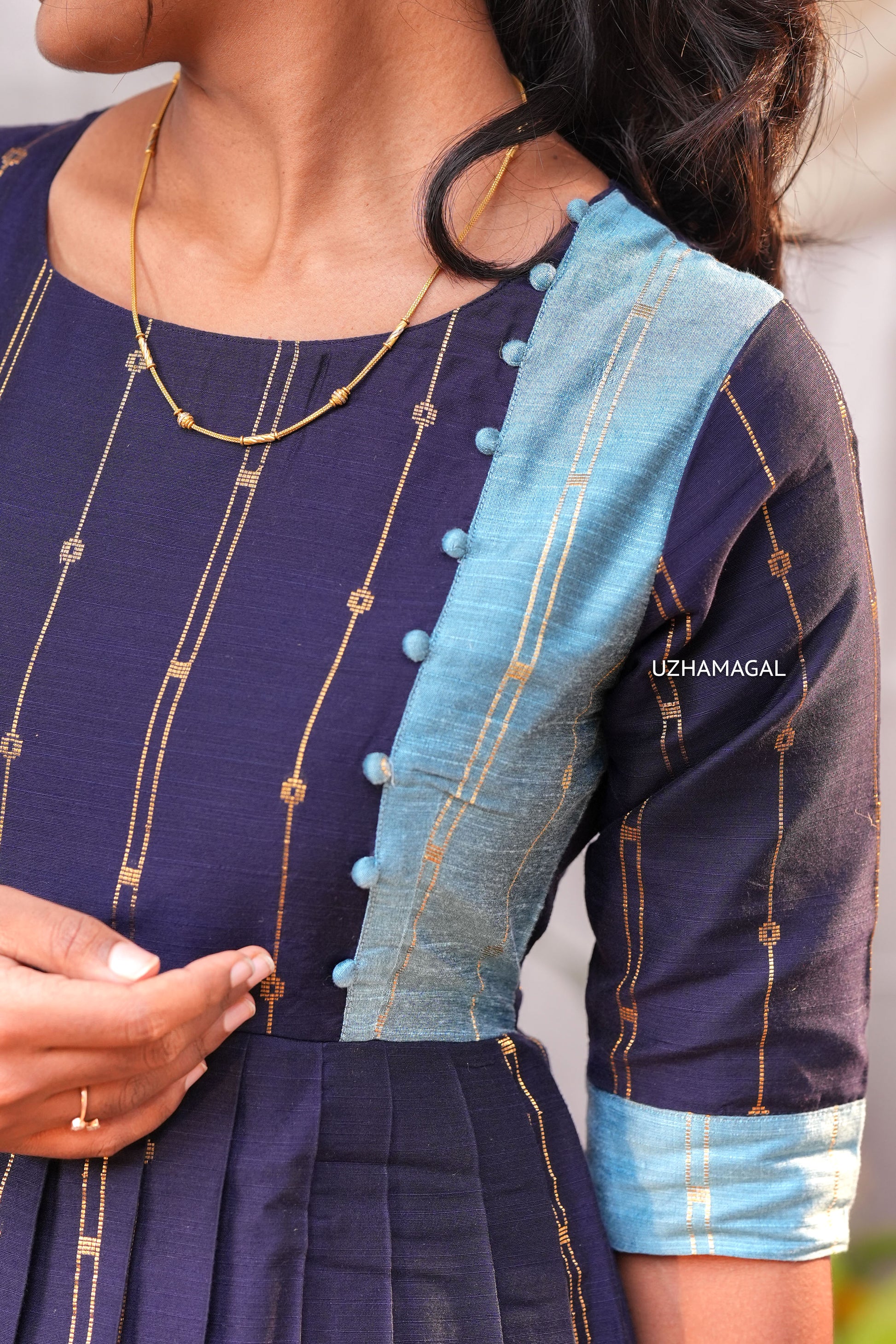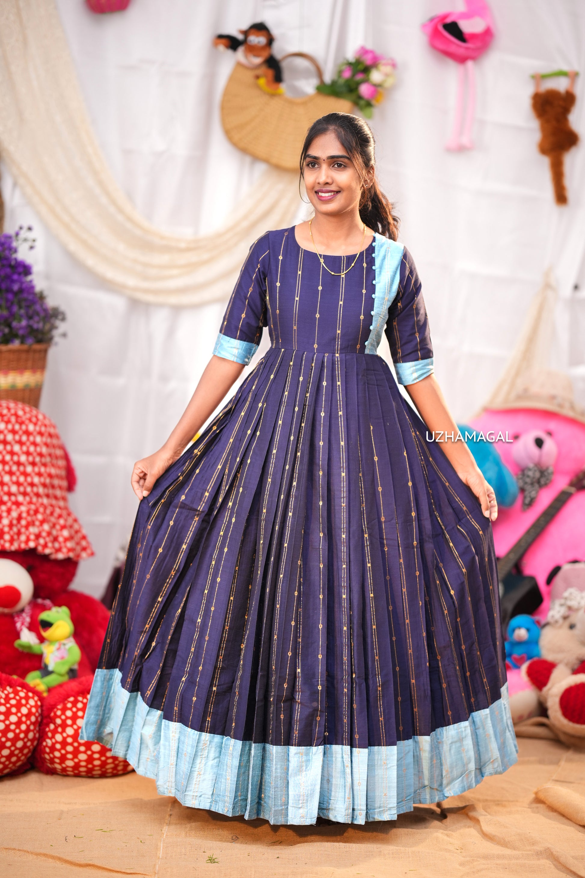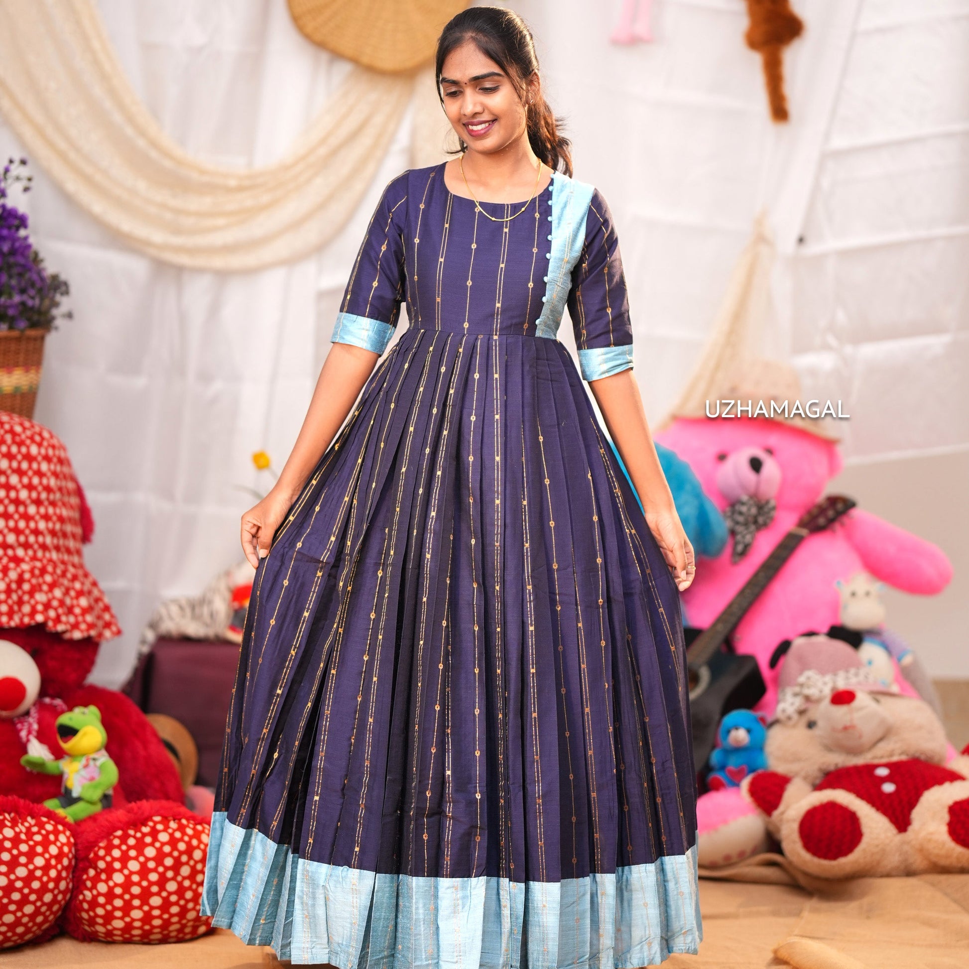 Make a graceful statement with the Neelaratham dress, thoughtfully designed in navy with sky blue highlights. This elegant piece brings together complementary shades that create a refined, balanced aesthetic perfect for any special occasion!