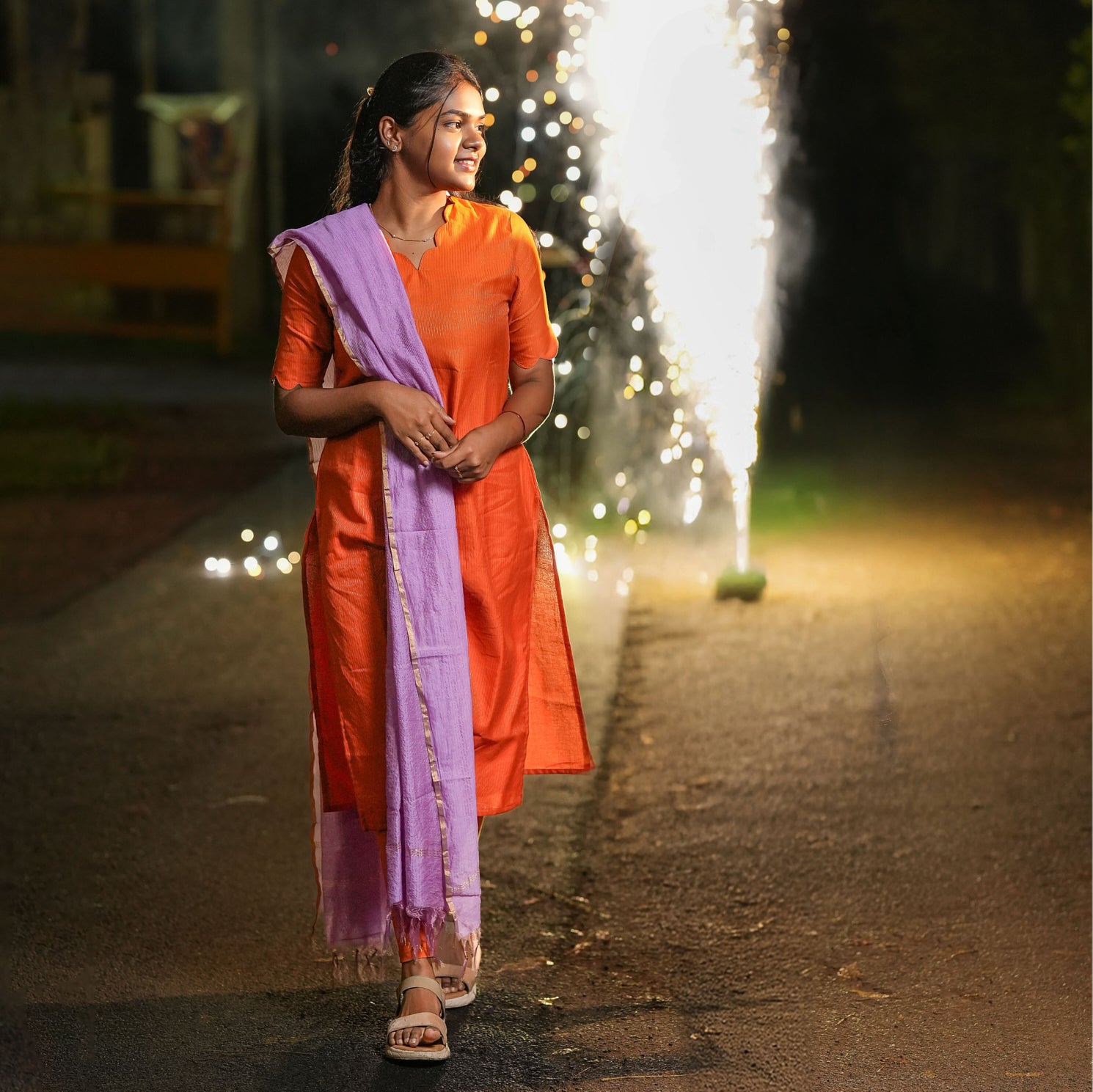 Celebrate every festive moment with this elegant orange kurti, beautifully adorned with golden zari weaving that adds a touch of traditional charm. Paired with a soft lavender dupatta, it offers a graceful contrast that enhances your look for special occasions. Comfortable yet striking, this ensemble ensures you feel confident and radiant throughout your celebrations.