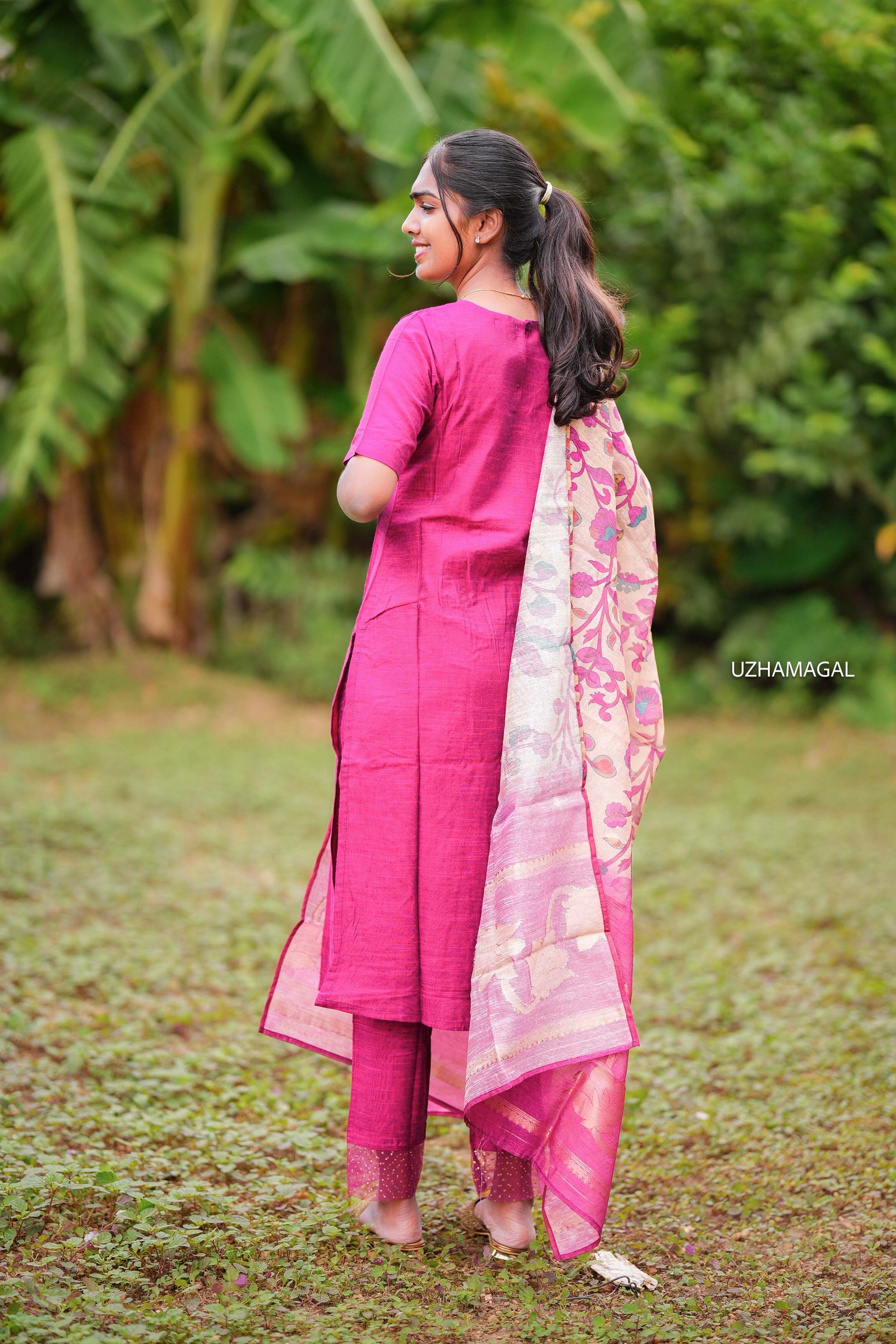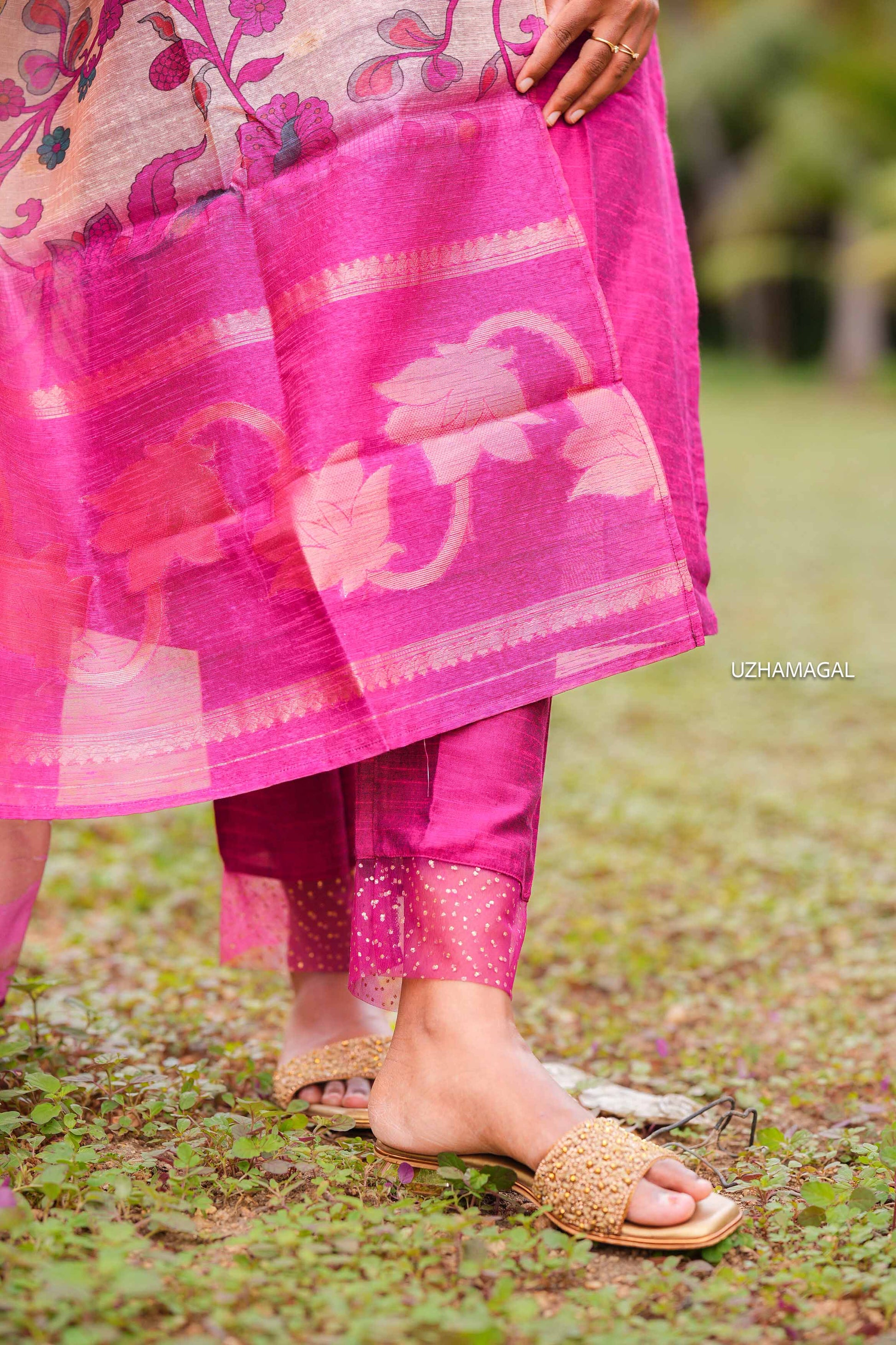 This Pallavi kurti set includes a beautifully designed Kalamkari dupatta with zari weaving and a soft, high-quality fabric for summer wear. The dupatta features a unique lotus weaving alongside a printed design, bordered with organza for added elegance. Elevate your summer wardrobe with this top-notch set.