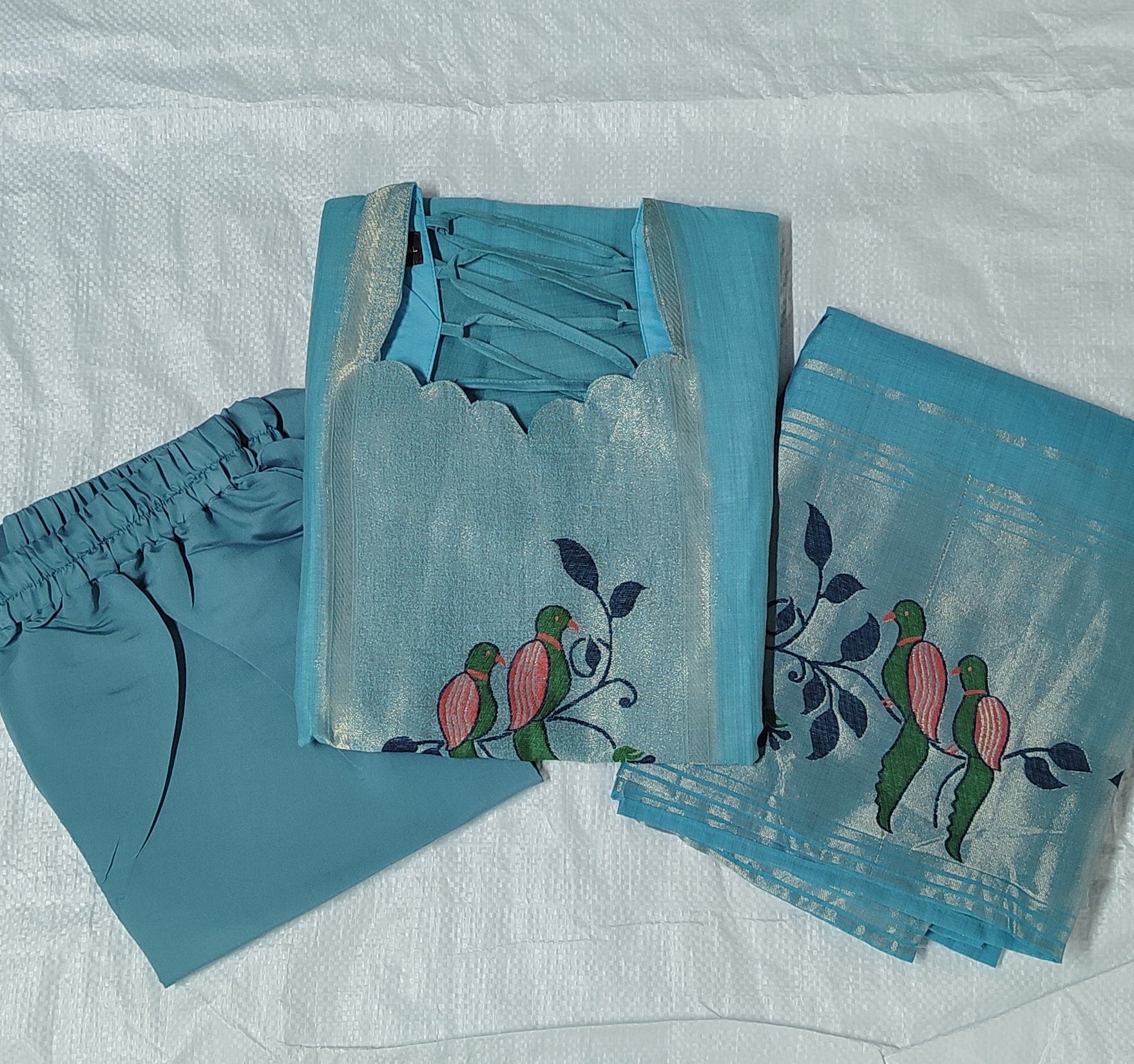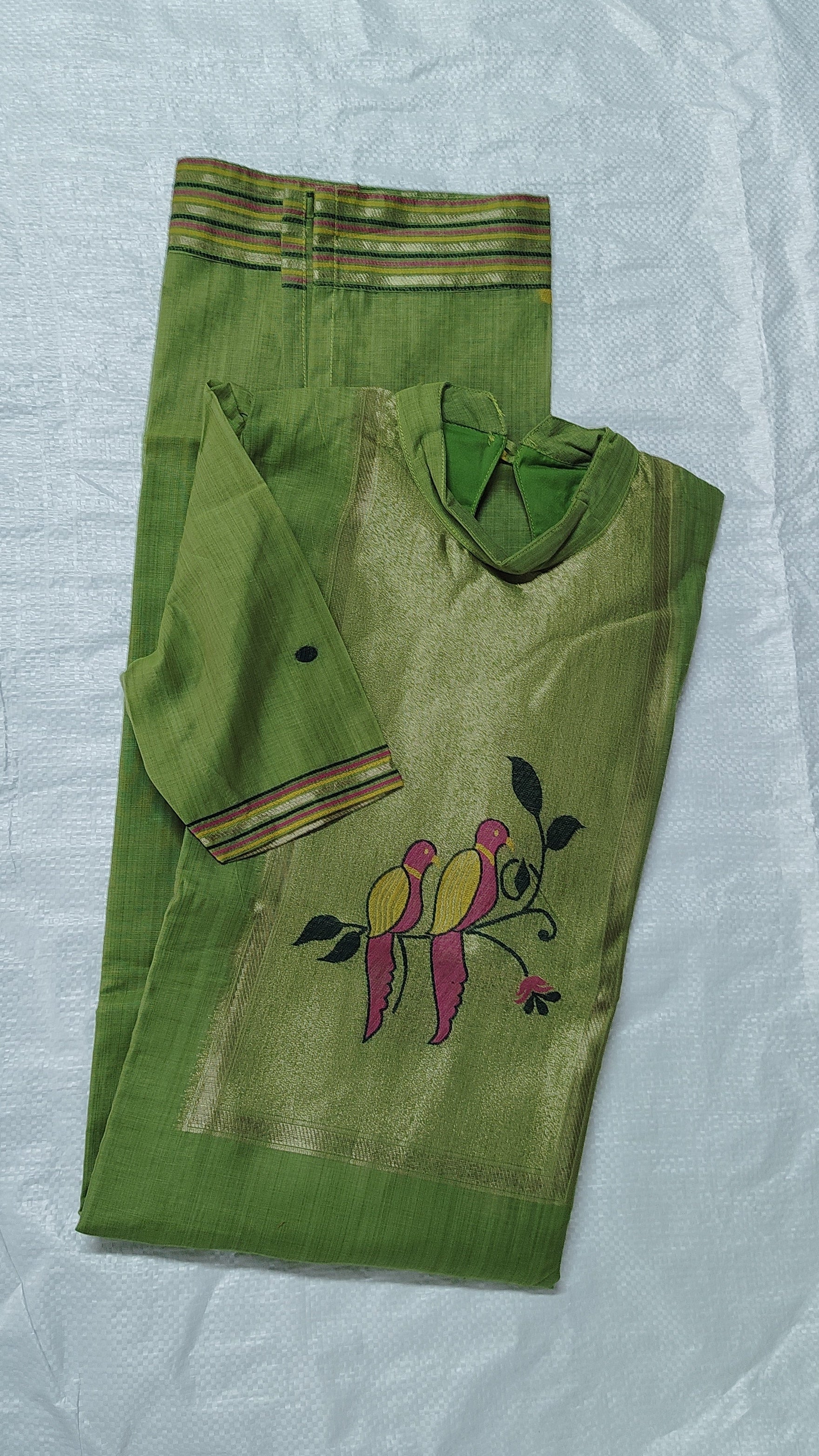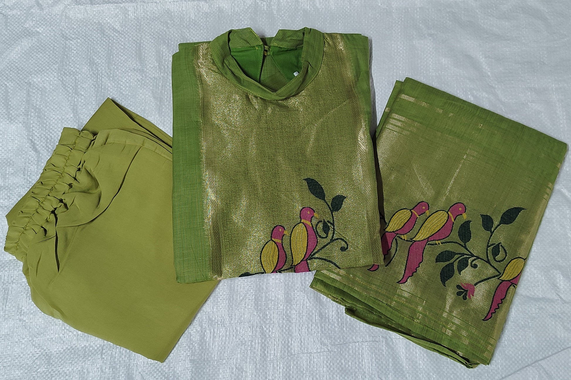 Radiant bright clolours parrot design kurti set designed for temple visits and traditional occasions. This ethnic ensemble features an elegant parrot motif that captures timeless cultural aesthetics. The vibrant yellow hue symbolizes auspiciousness and positivity, making it perfect for spiritual gatherings and festive celebrations. Crafted with attention to traditional tailoring, the set combines comfort with authentic ethnic charm. Ideal for women seeking graceful, modest wear that honors cultural heritage while maintaining contemporary style.