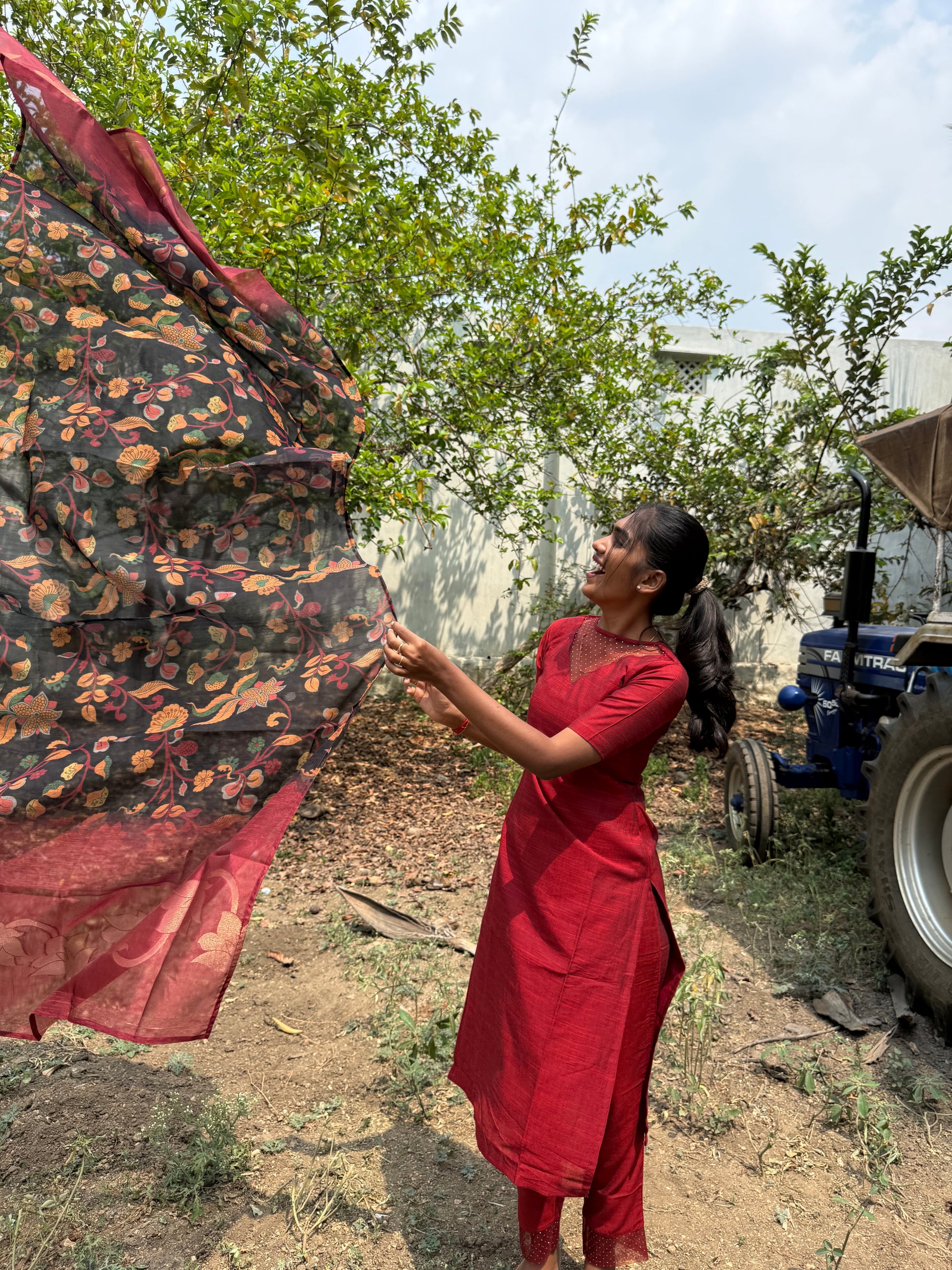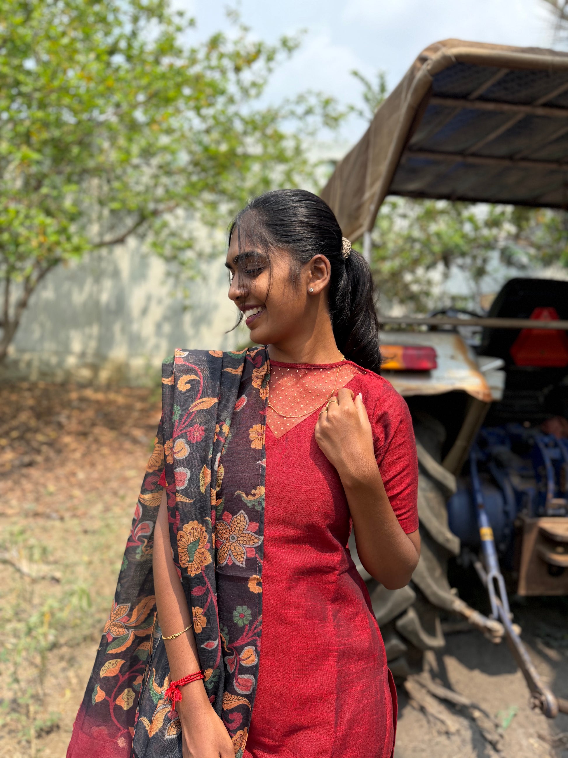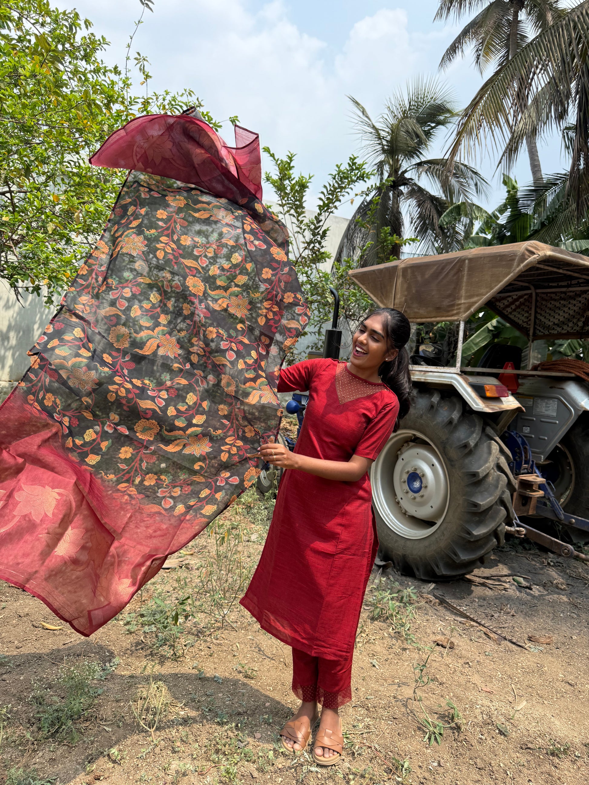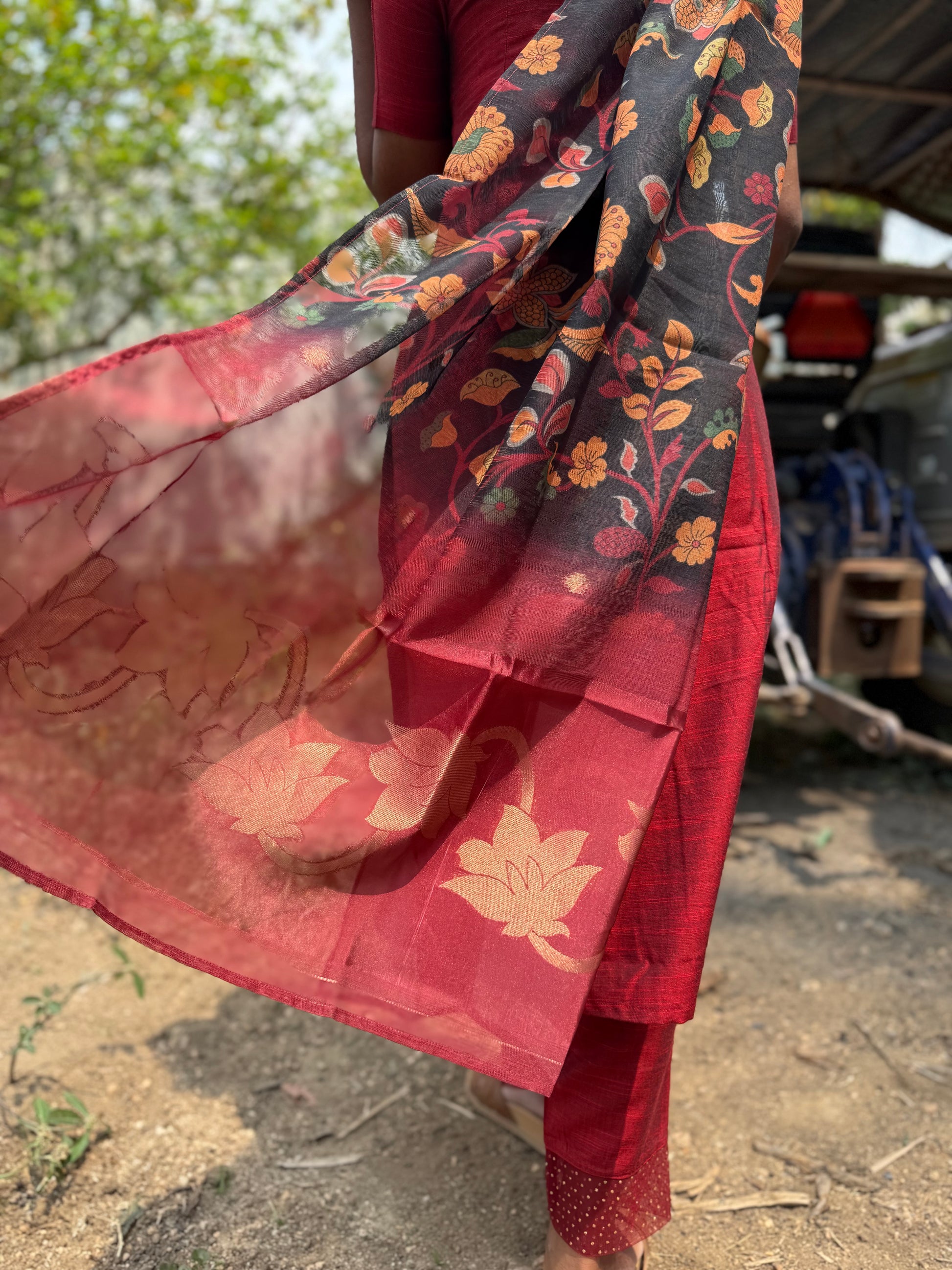 This pooranam kurti set includes a beautifully designed Kalamkari dupatta with zari weaving and a soft, high-quality fabric for summer wear. The dupatta features a unique lotus weaving alongside a printed design, bordered with organza for added elegance. Elevate your summer wardrobe with this top-notch set.