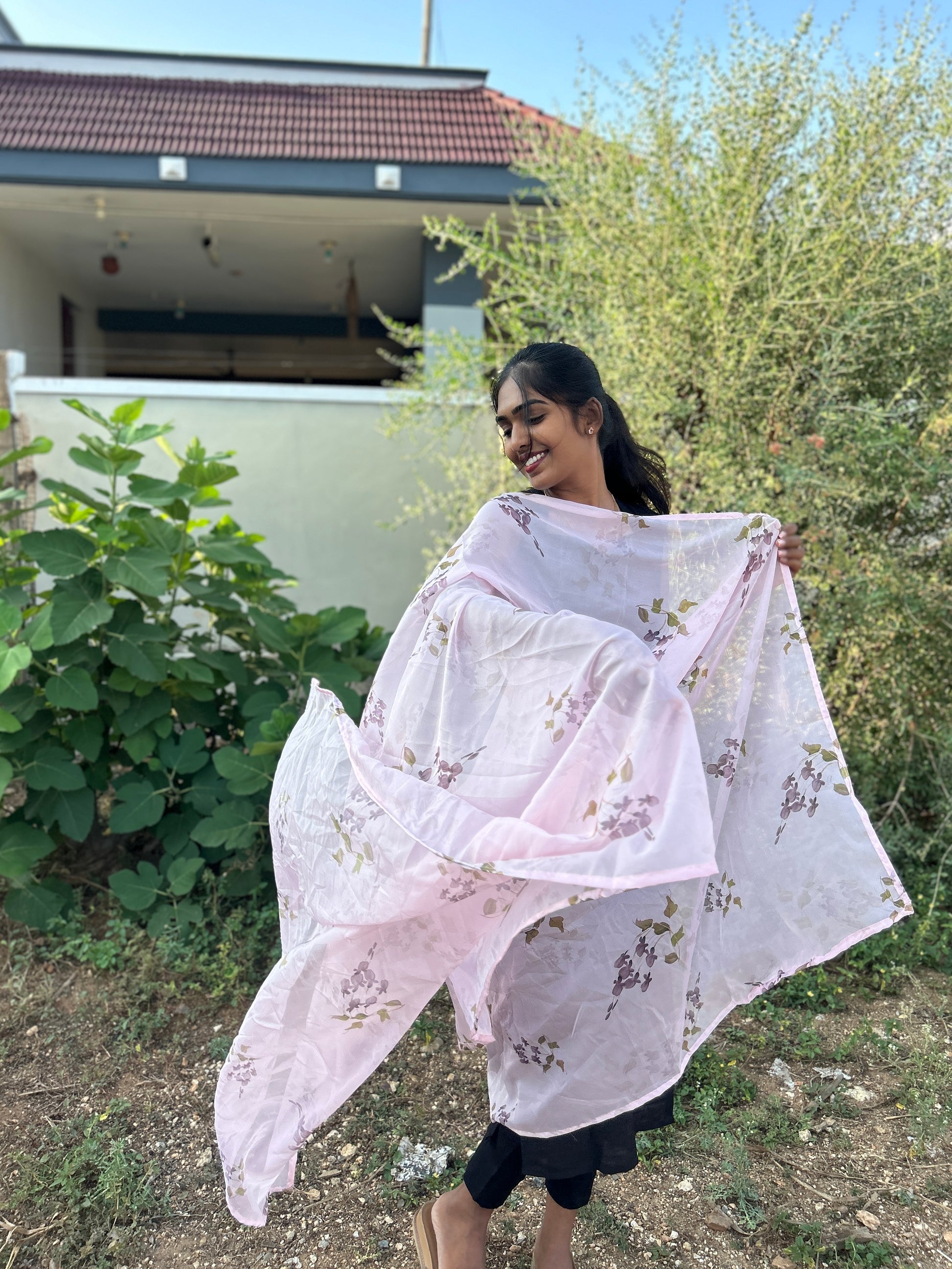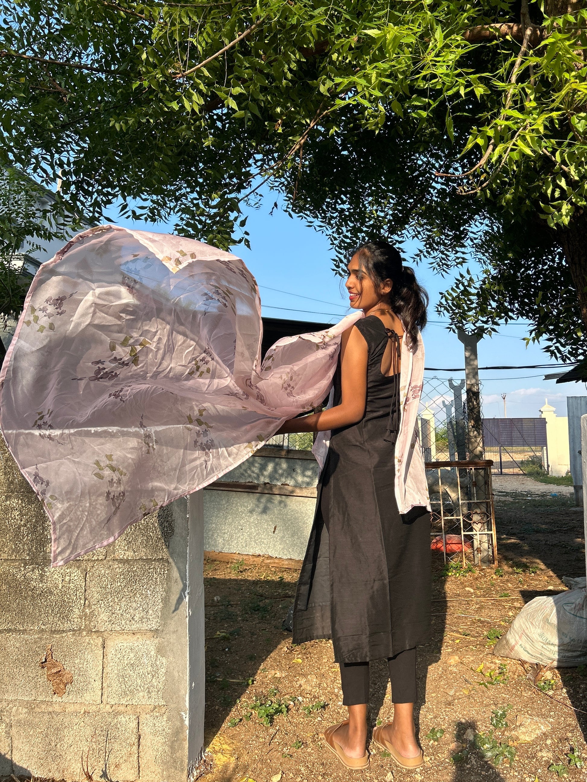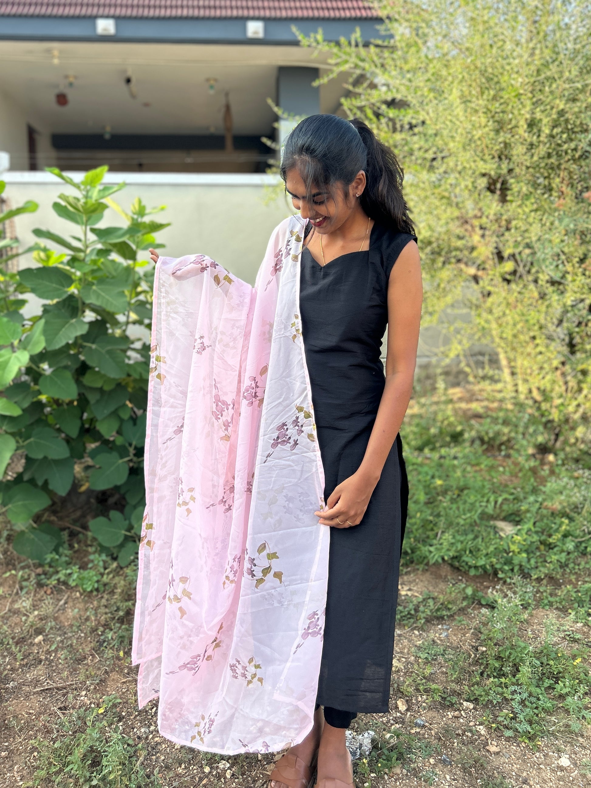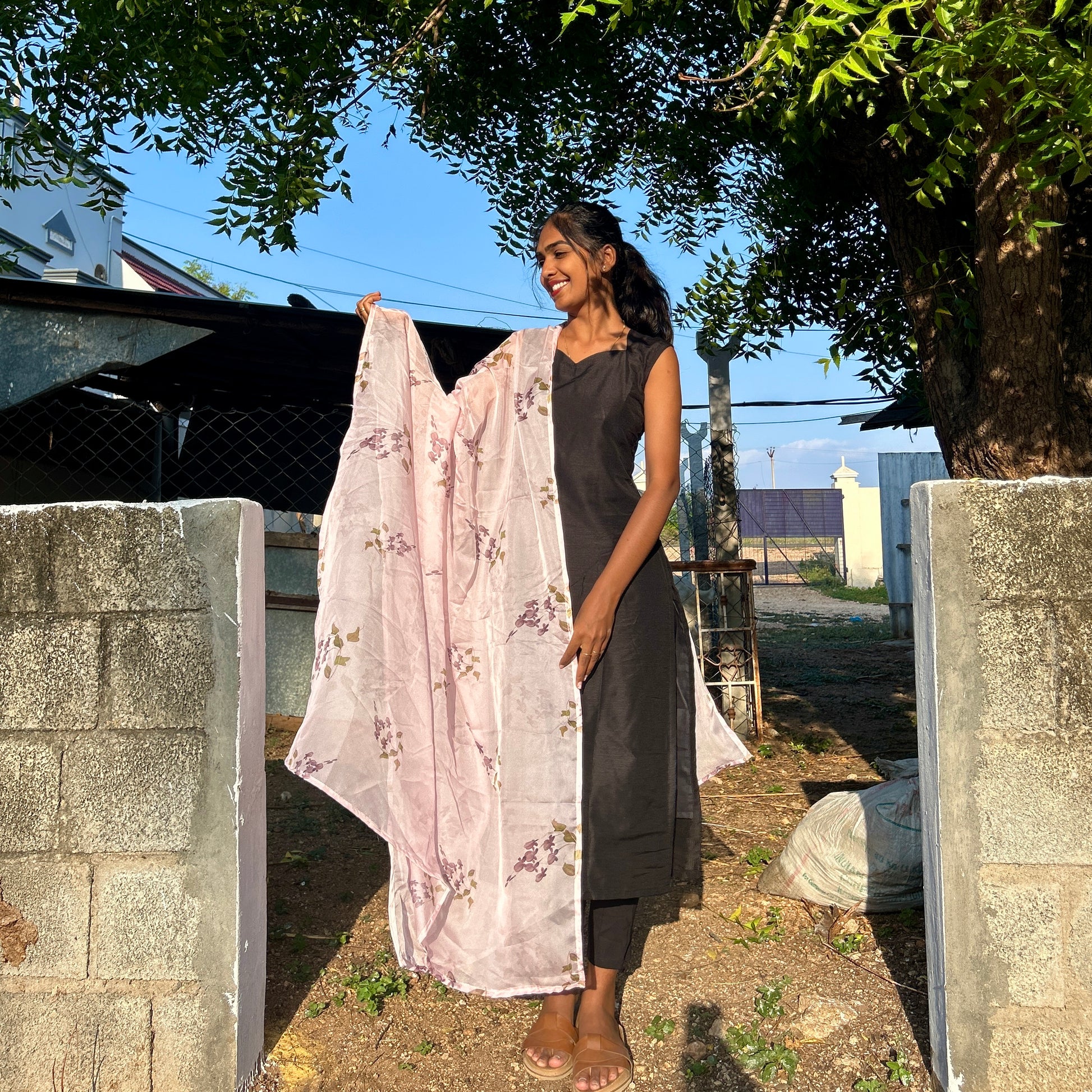 Featuring a classic black kurti that speaks bold confidence, paired with a dreamy pink organza dupatta that adds a touch of delicate charm — this ensemble is made for the woman who carries both strength and softness in her stride.