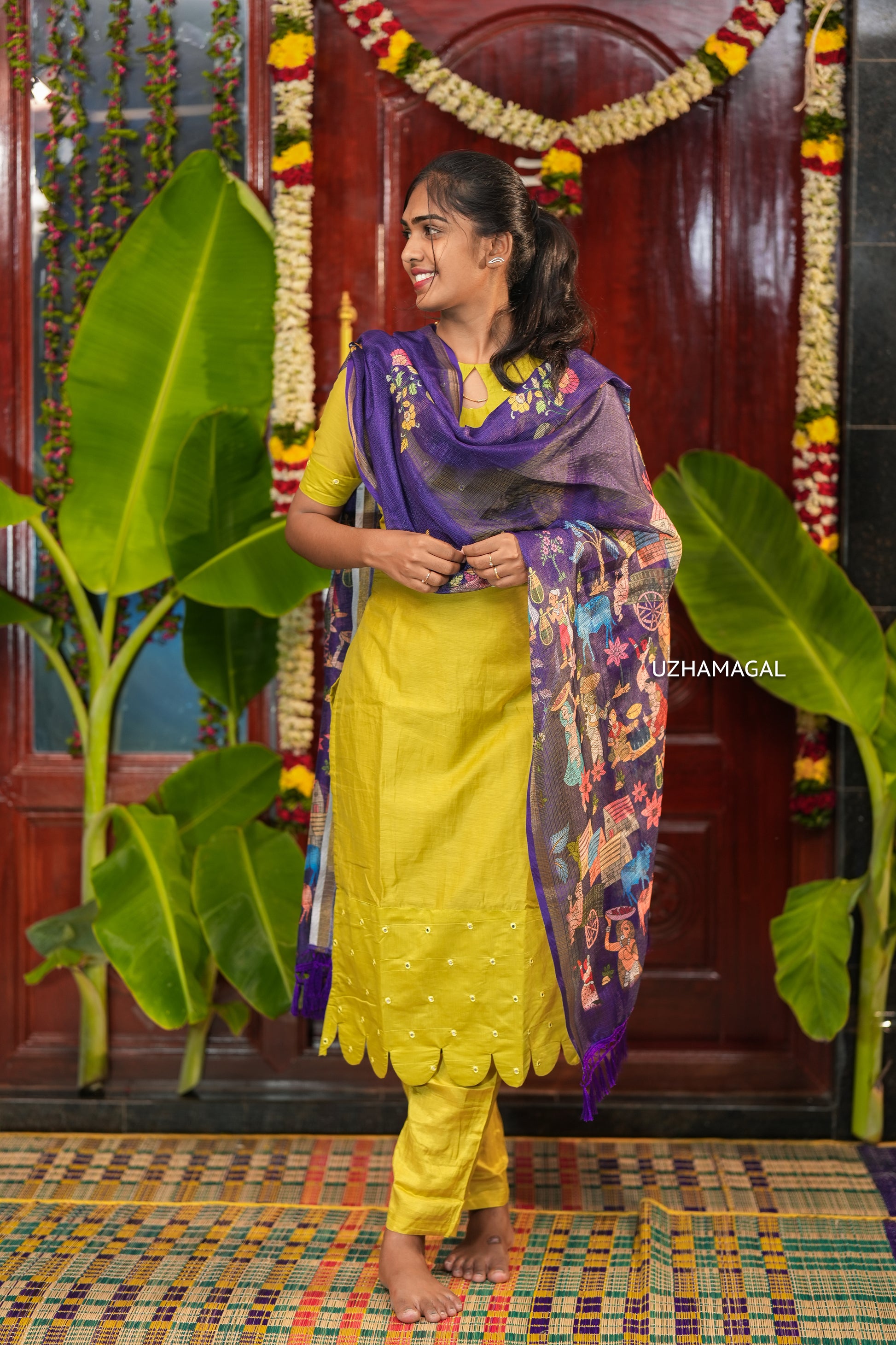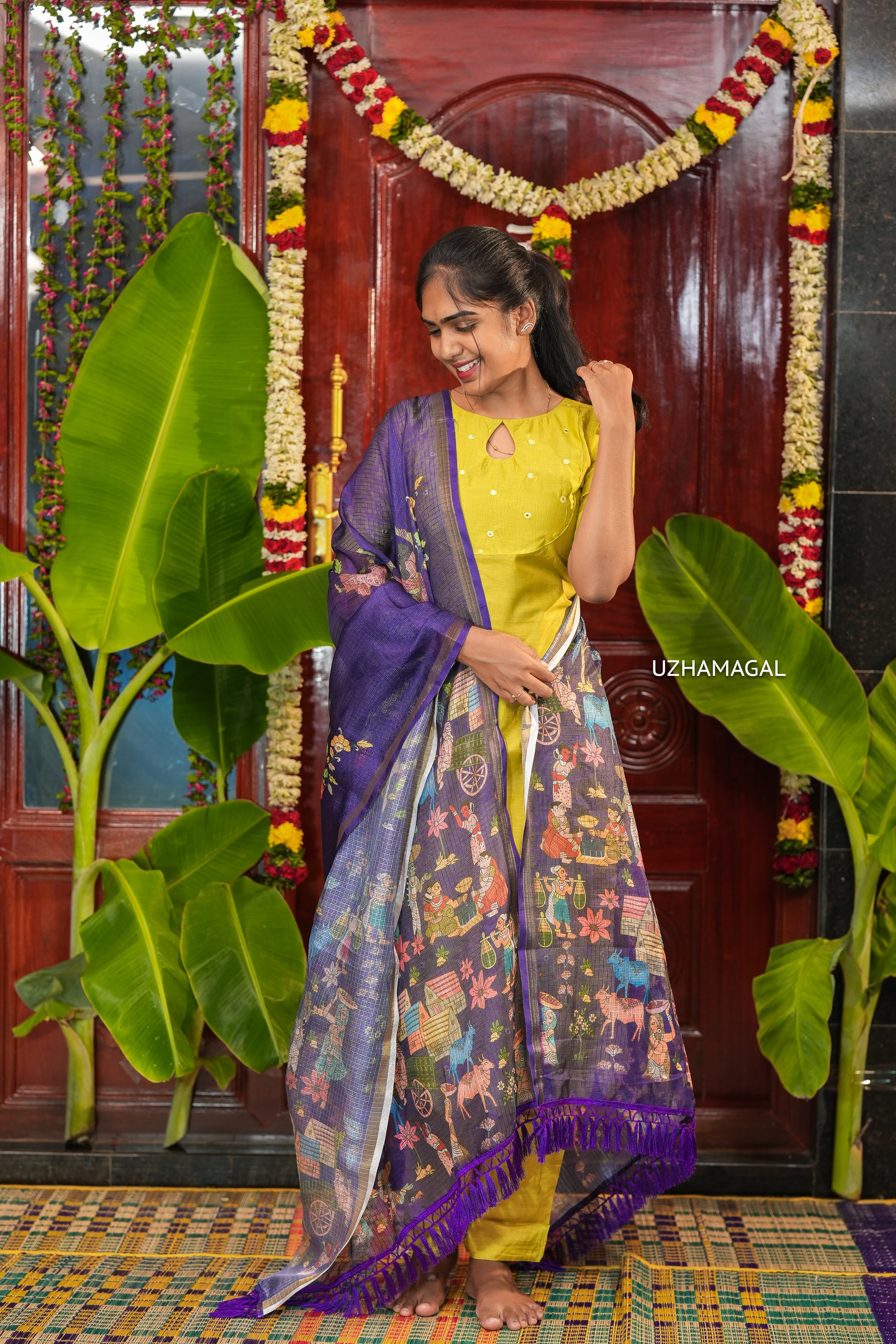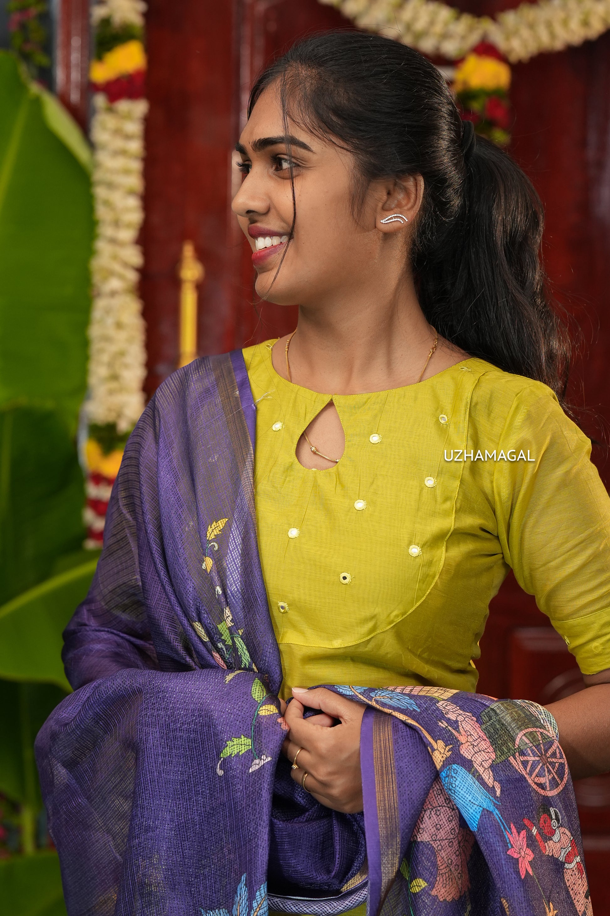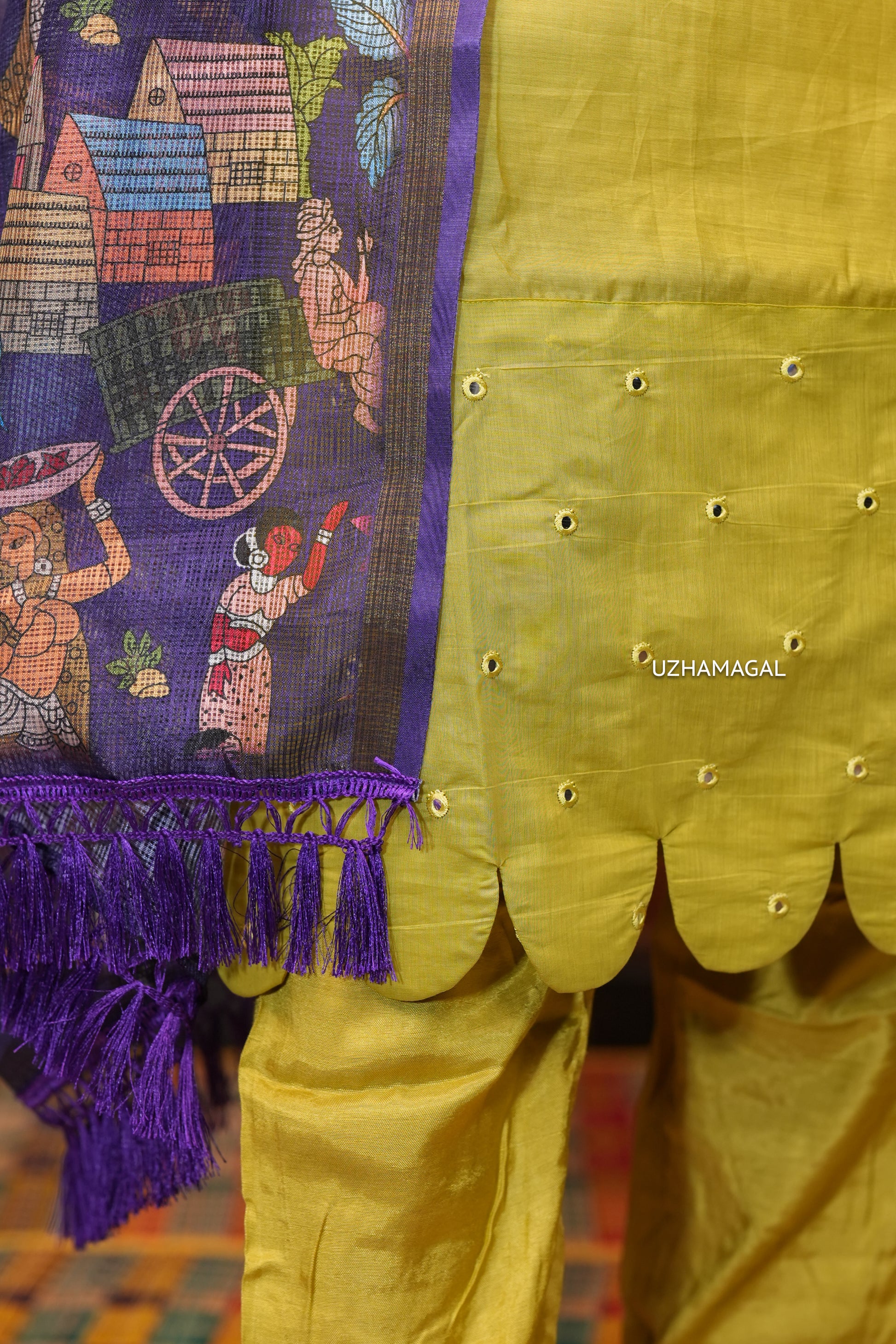 Elevate your ethnic wardrobe with this stunning traditional top featuring a vibrant bright mustard yellow base adorned with royal purple accents. The multi-colour traditional prints create an eye-catching design, while intricate mirror work adds a touch of sparkle and sophistication. Perfect for festive occasions, celebrations, or making a bold statement at any gathering.