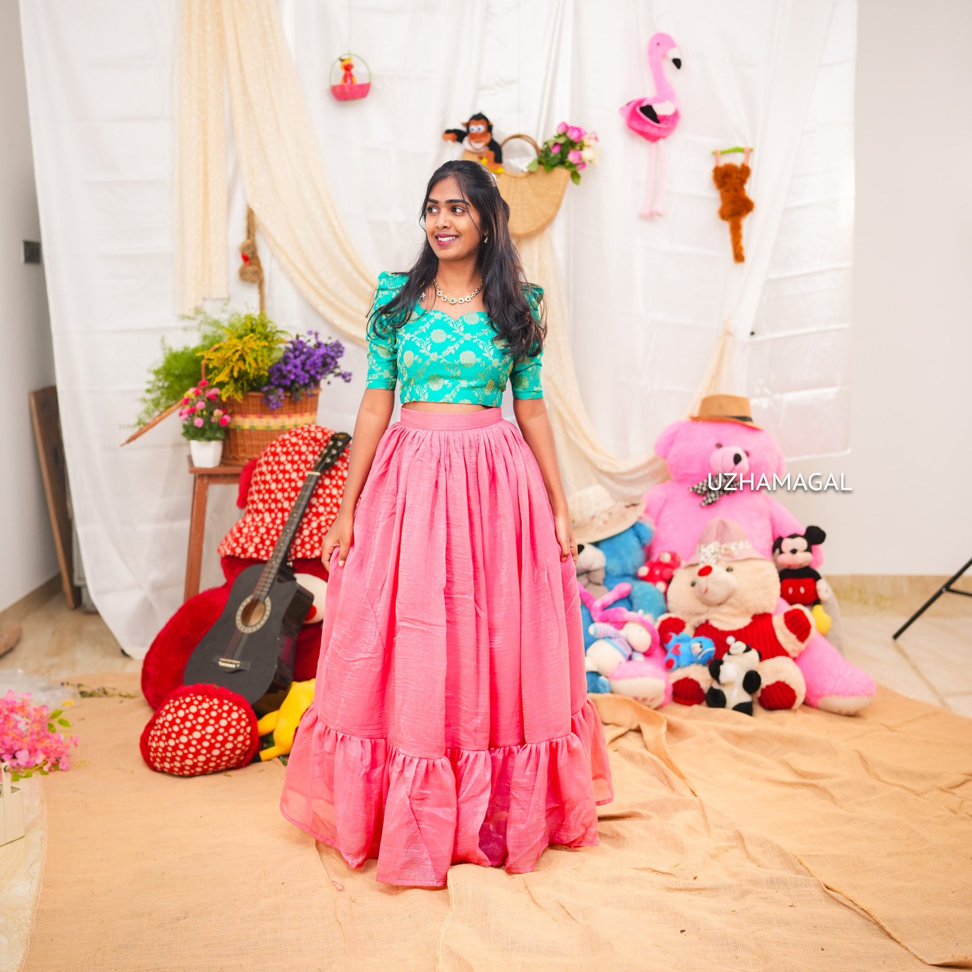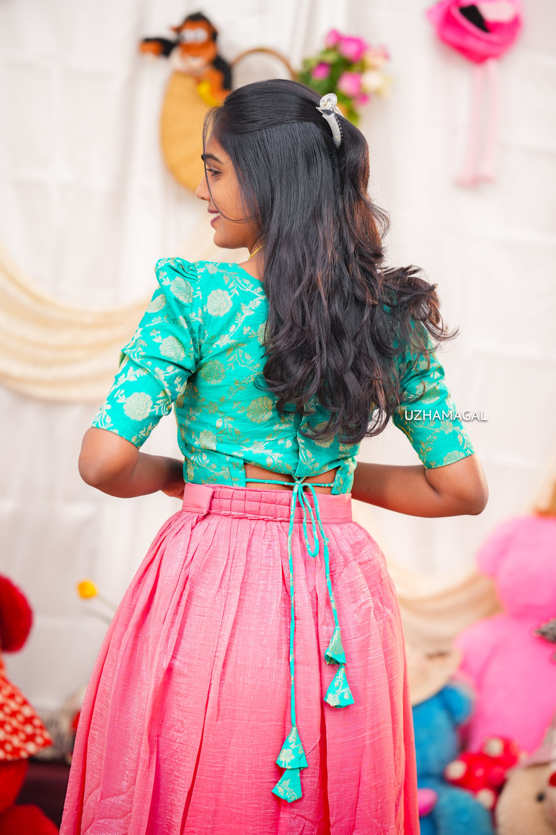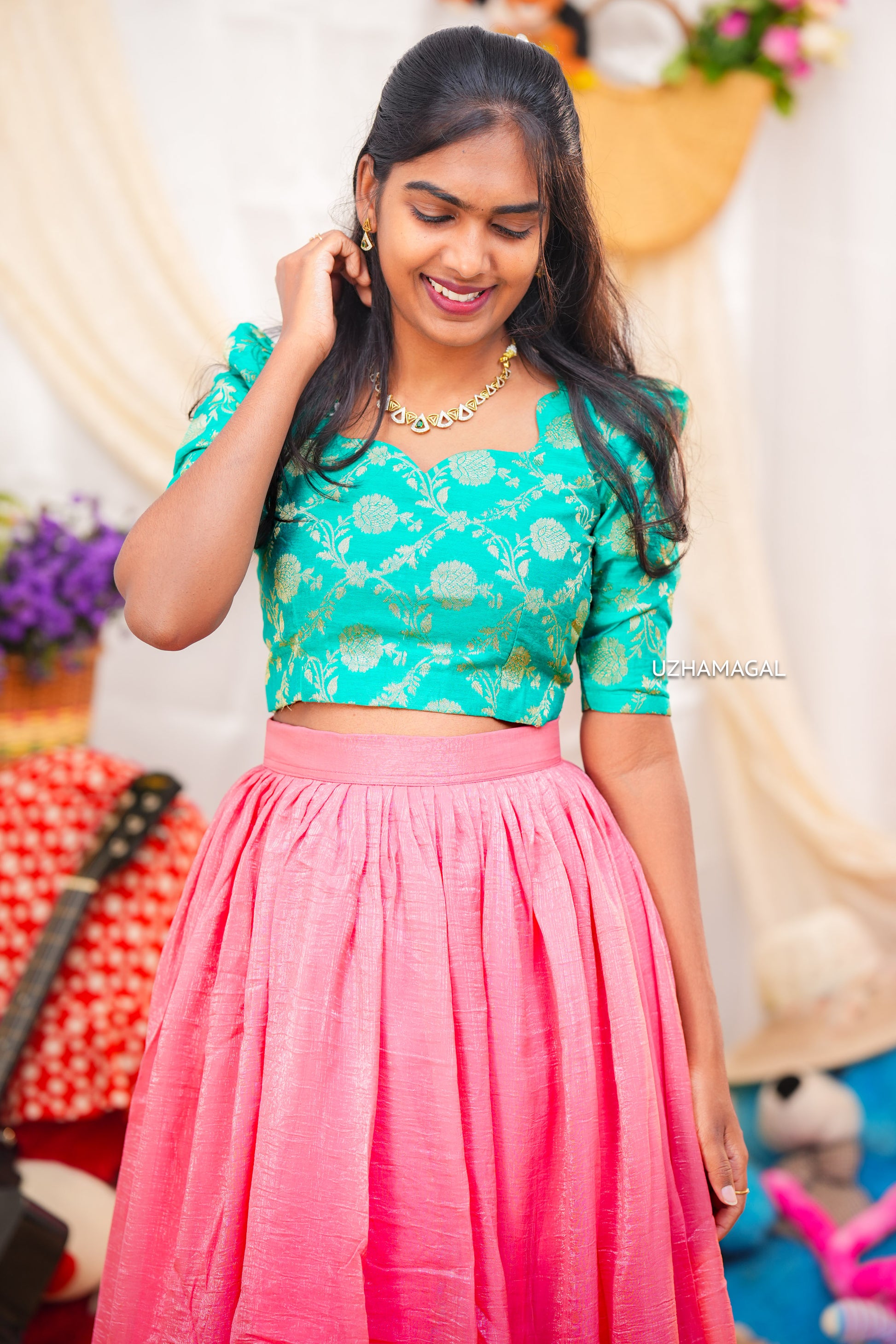 Radhi celebrates your special moments with understated sophistication. This ethnic ensemble pairs a graceful top with a coordinating skirt, both crafted from sumptuous jacquard fabric enriched with delicate zari embroidery. The soft, muted tones create a refined look that honors tradition while feeling contemporary and wearable. Perfect for festivals, celebrations, and occasions .
