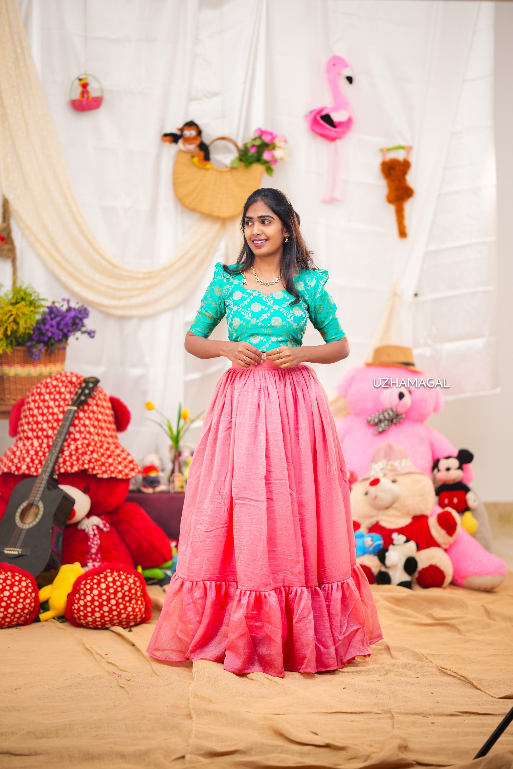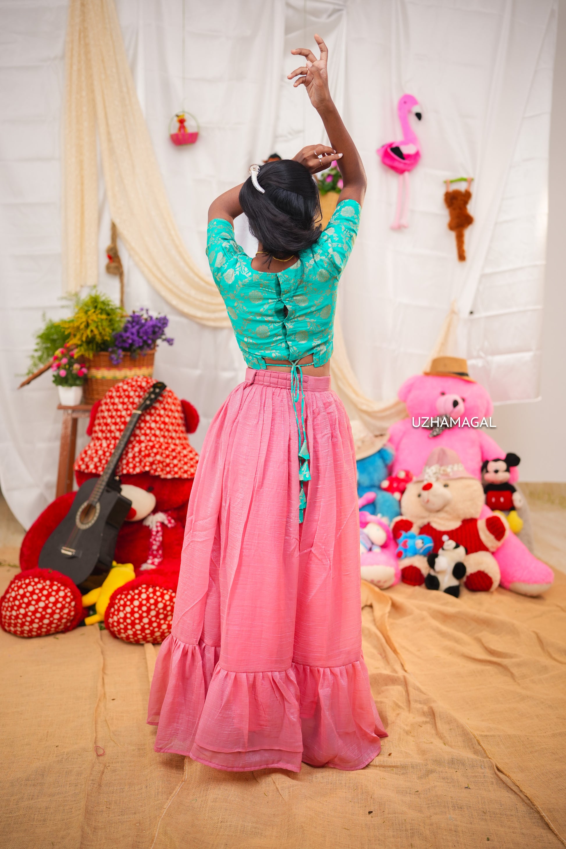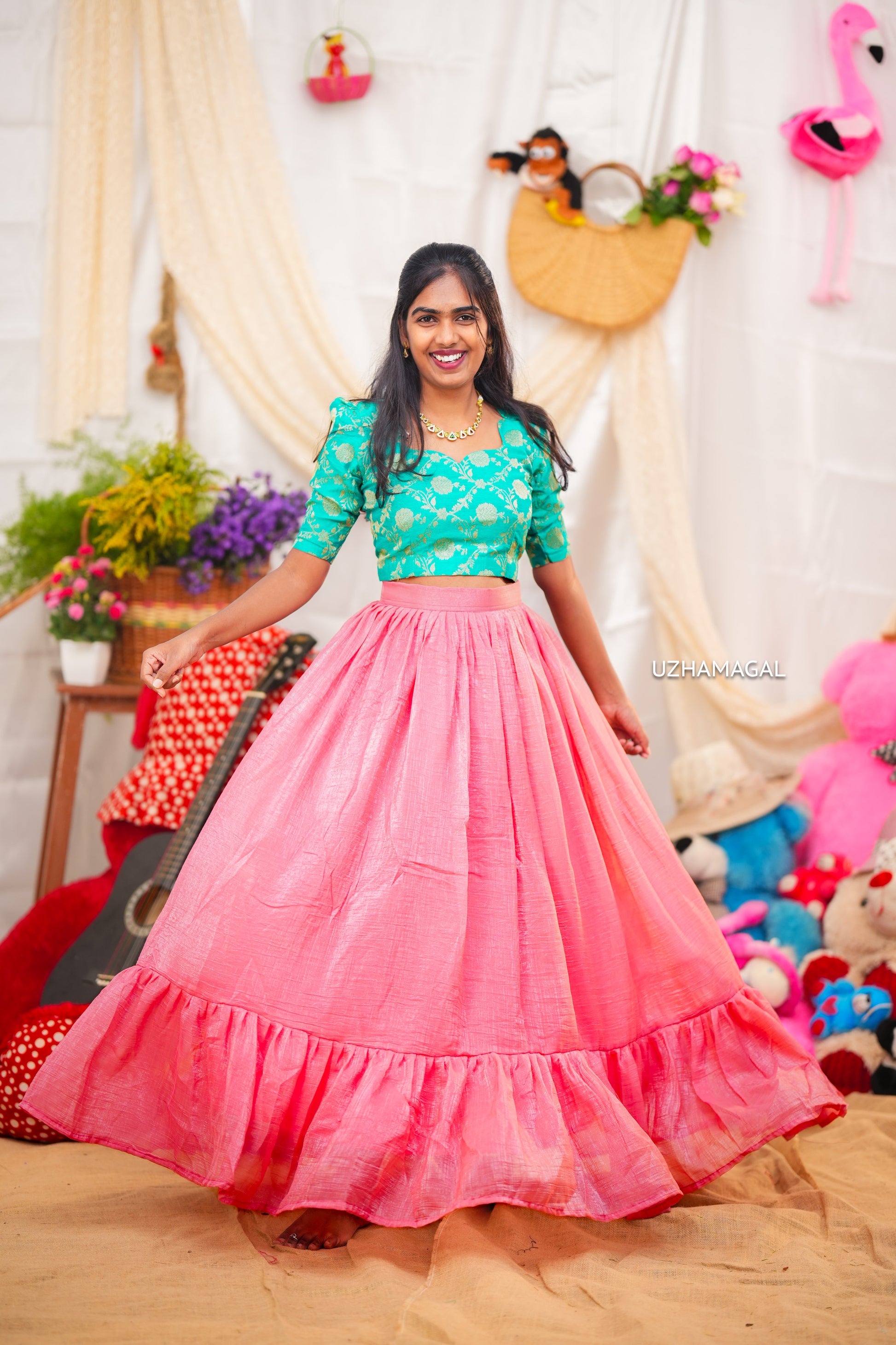 Radhi celebrates your special moments with understated sophistication. This ethnic ensemble pairs a graceful top with a coordinating skirt, both crafted from sumptuous jacquard fabric enriched with delicate zari embroidery. The soft, muted tones create a refined look that honors tradition while feeling contemporary and wearable. Perfect for festivals, celebrations, and occasions .
