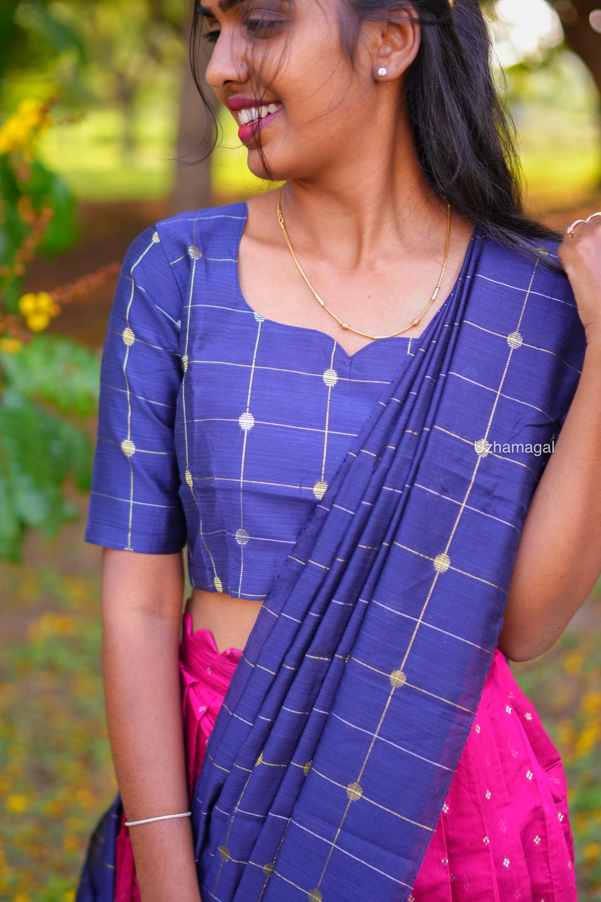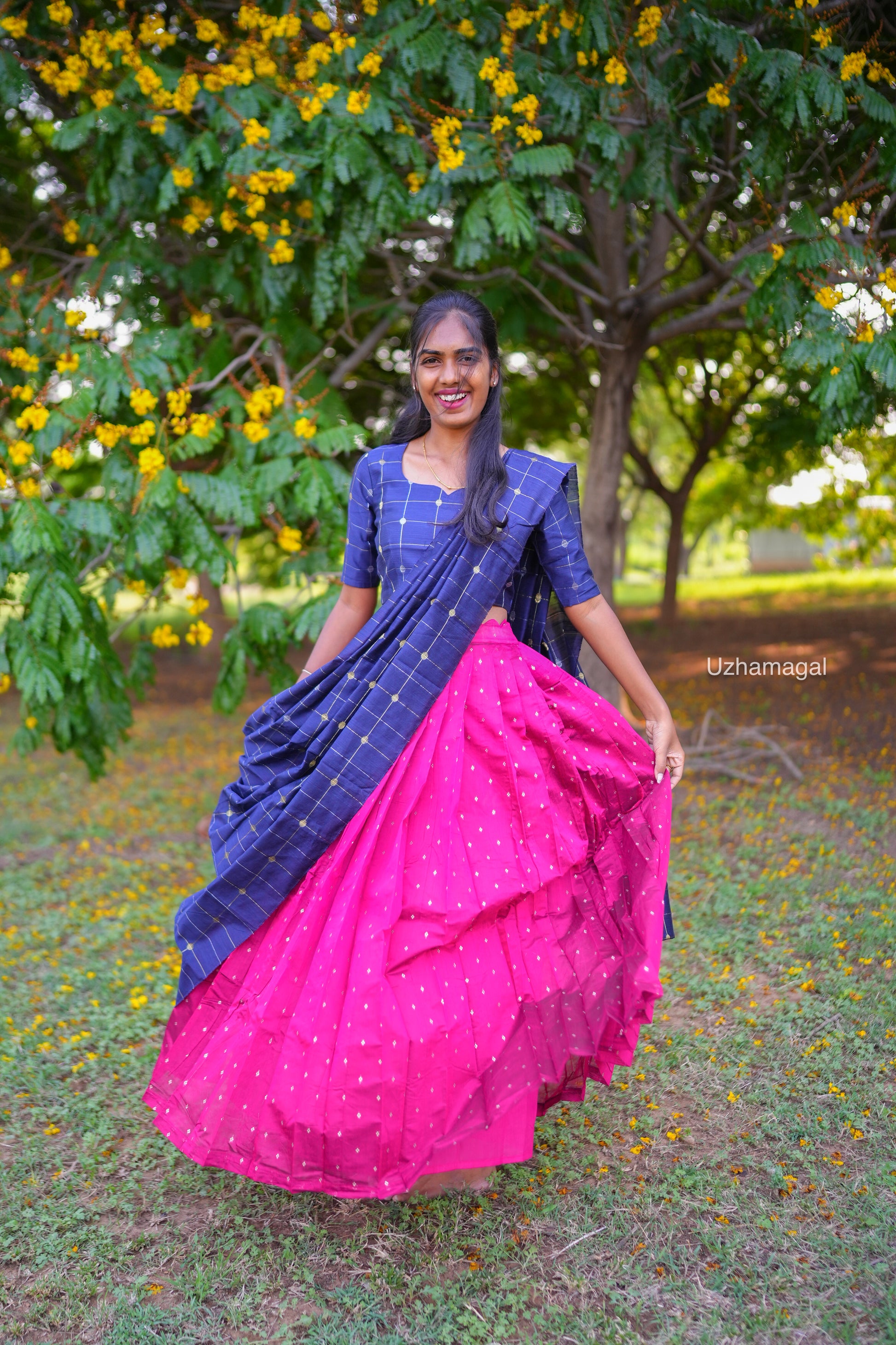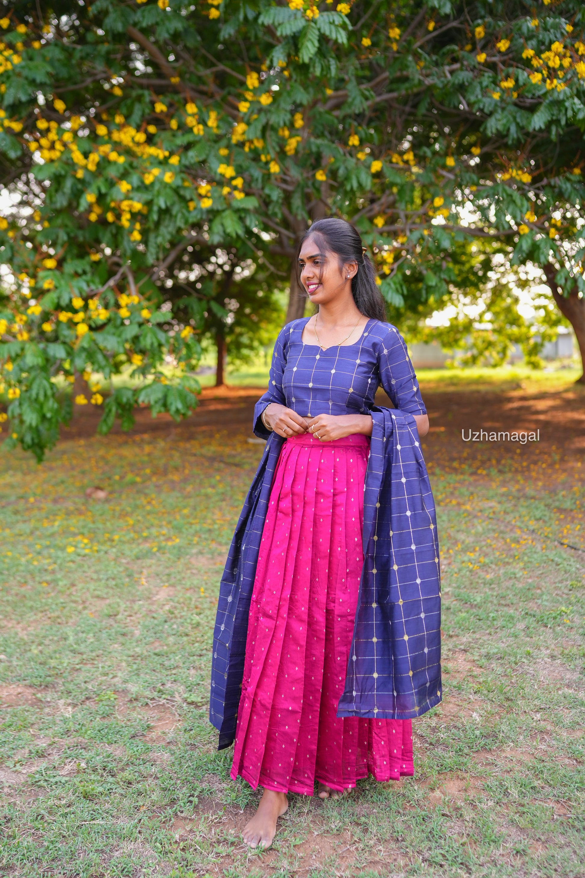 Introducing the Riya skirt set! This stylish and pretty skirt set, in a beautiful dark pink with blue accents, is perfect for adding a touch of feminine charm to any outfit. Get ready to turn heads and make a statement with the unique and fashionable Riya skirt set.