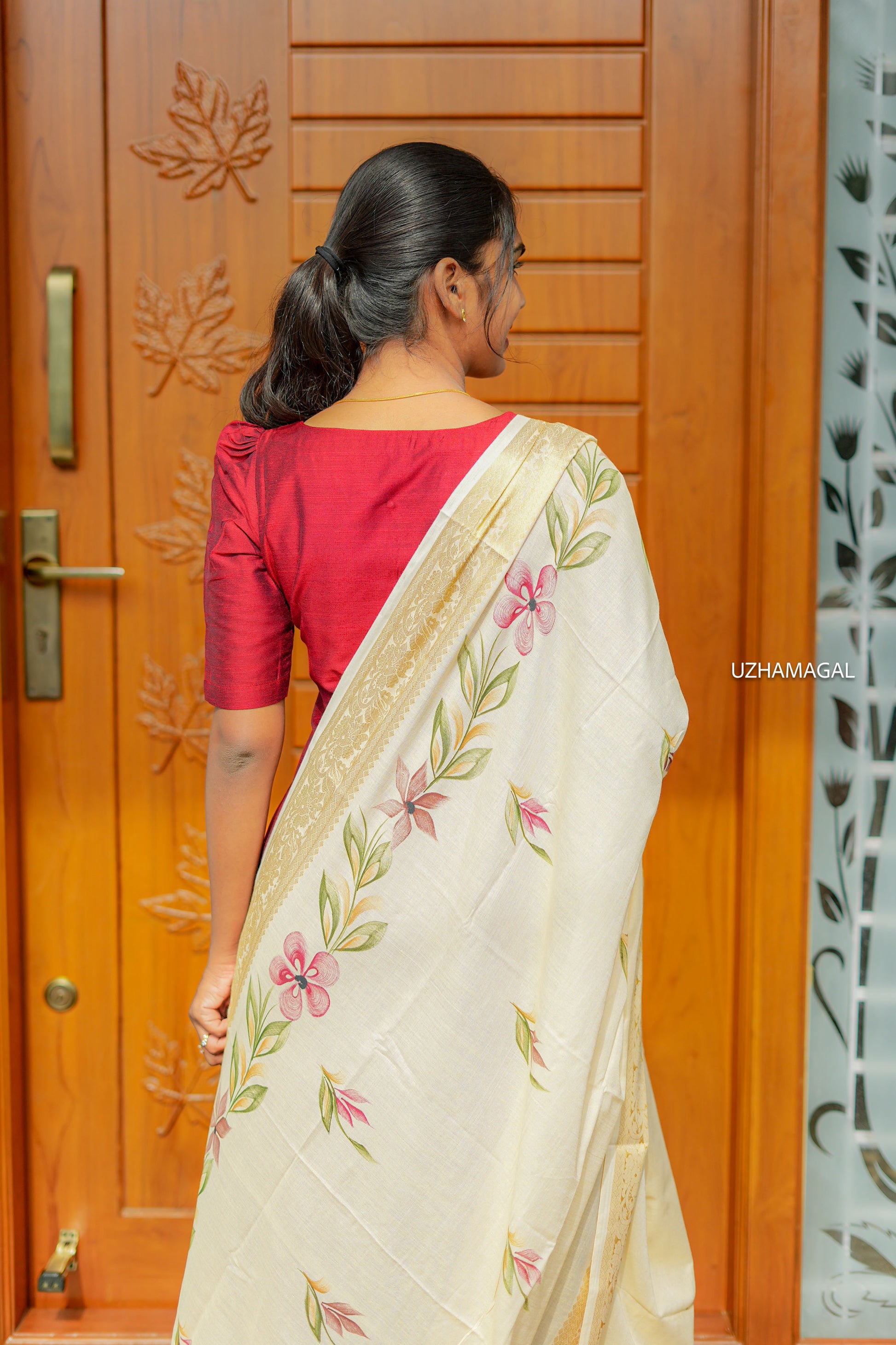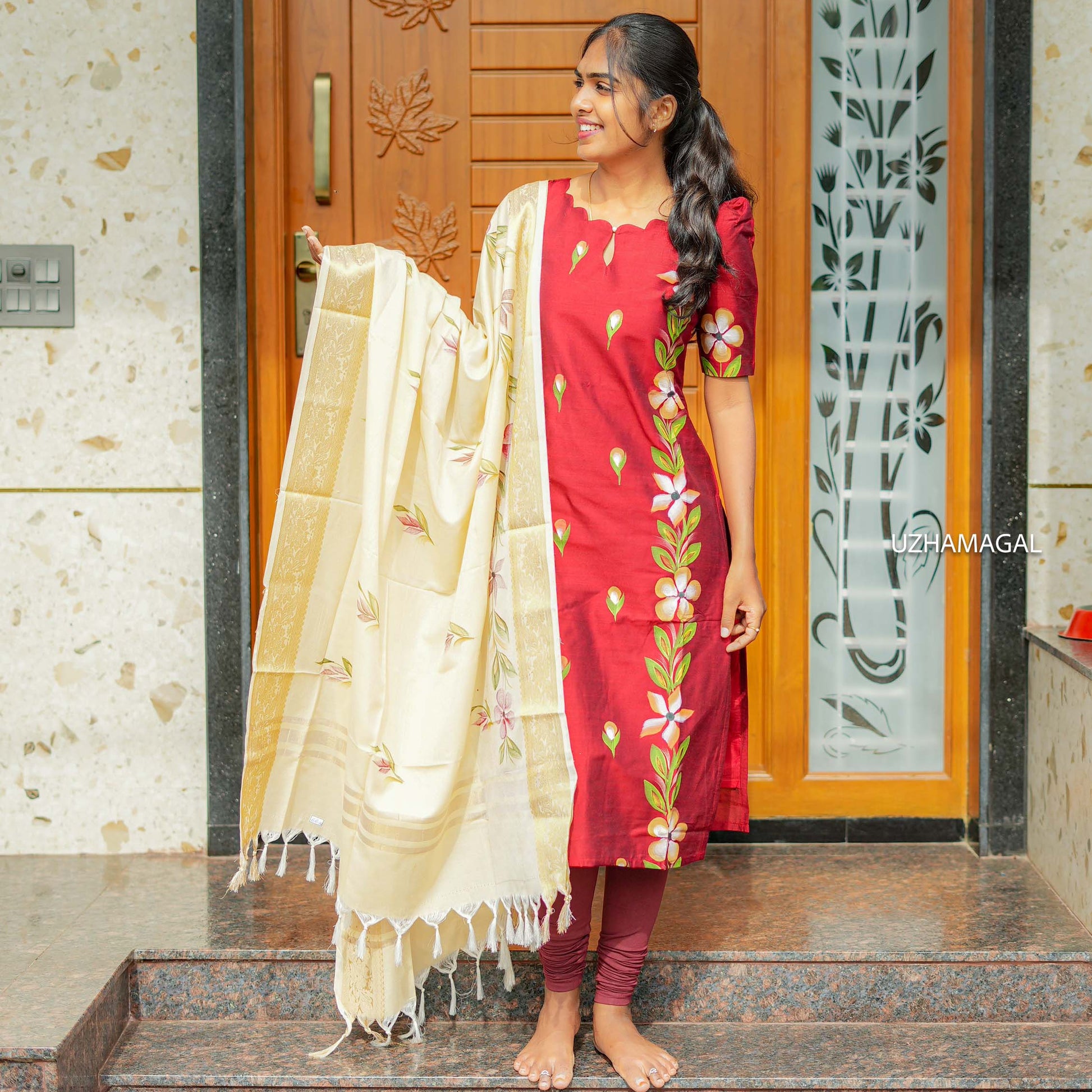 Brighten your day with the Sindhoora Vizhi kurti, a red hand-printed classic that radiates tradition with a fun twist. Paired with a half-white dupatta, this duo is perfect for temple visits or a charming date, blending comfort and style effortlessly. Step out playful and poised in this timeless ensemble!