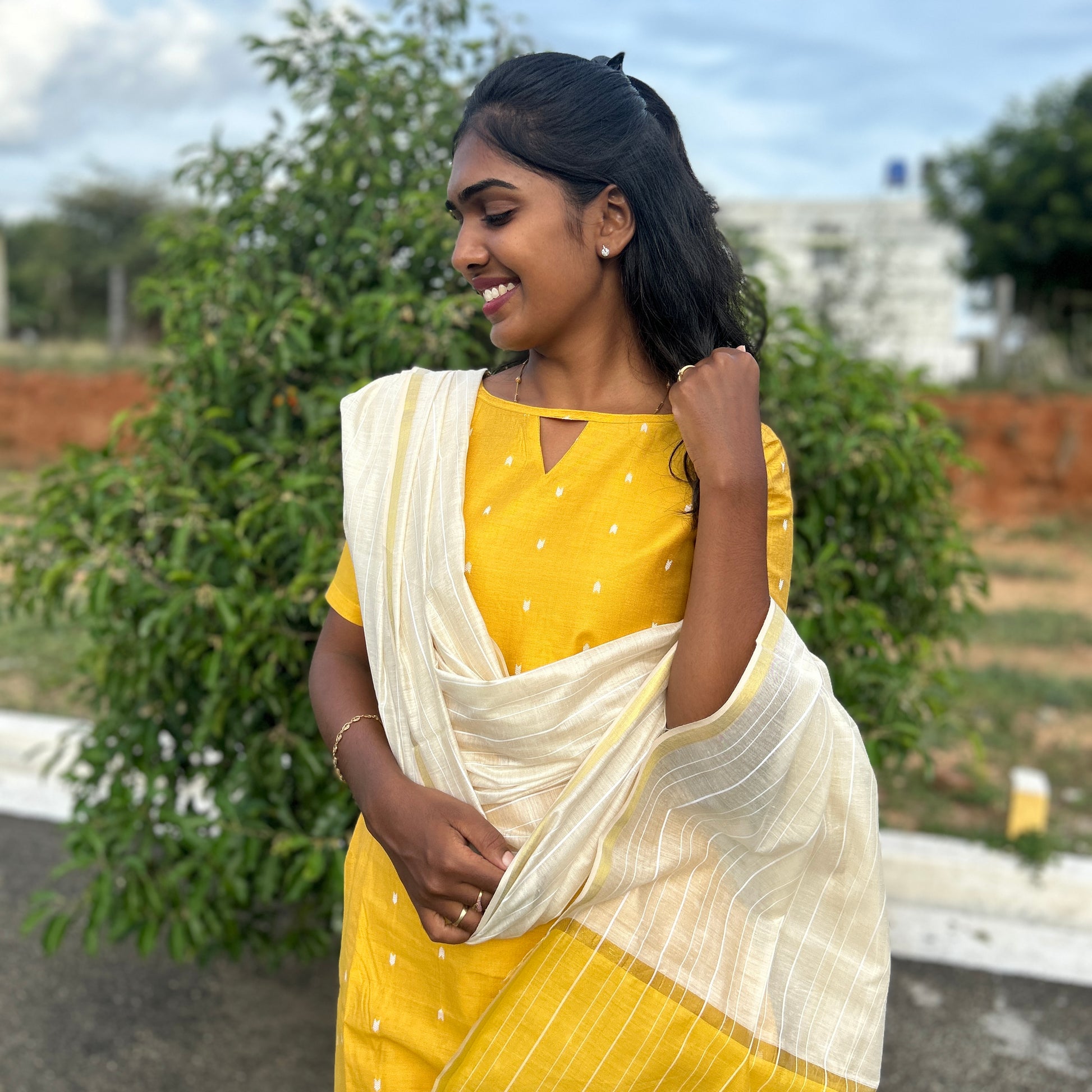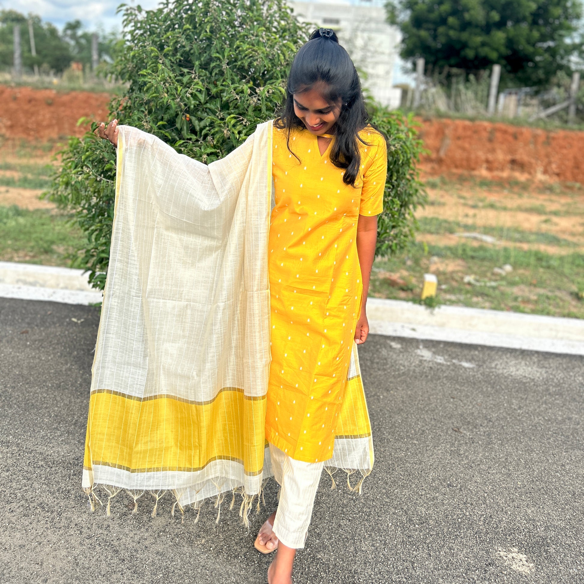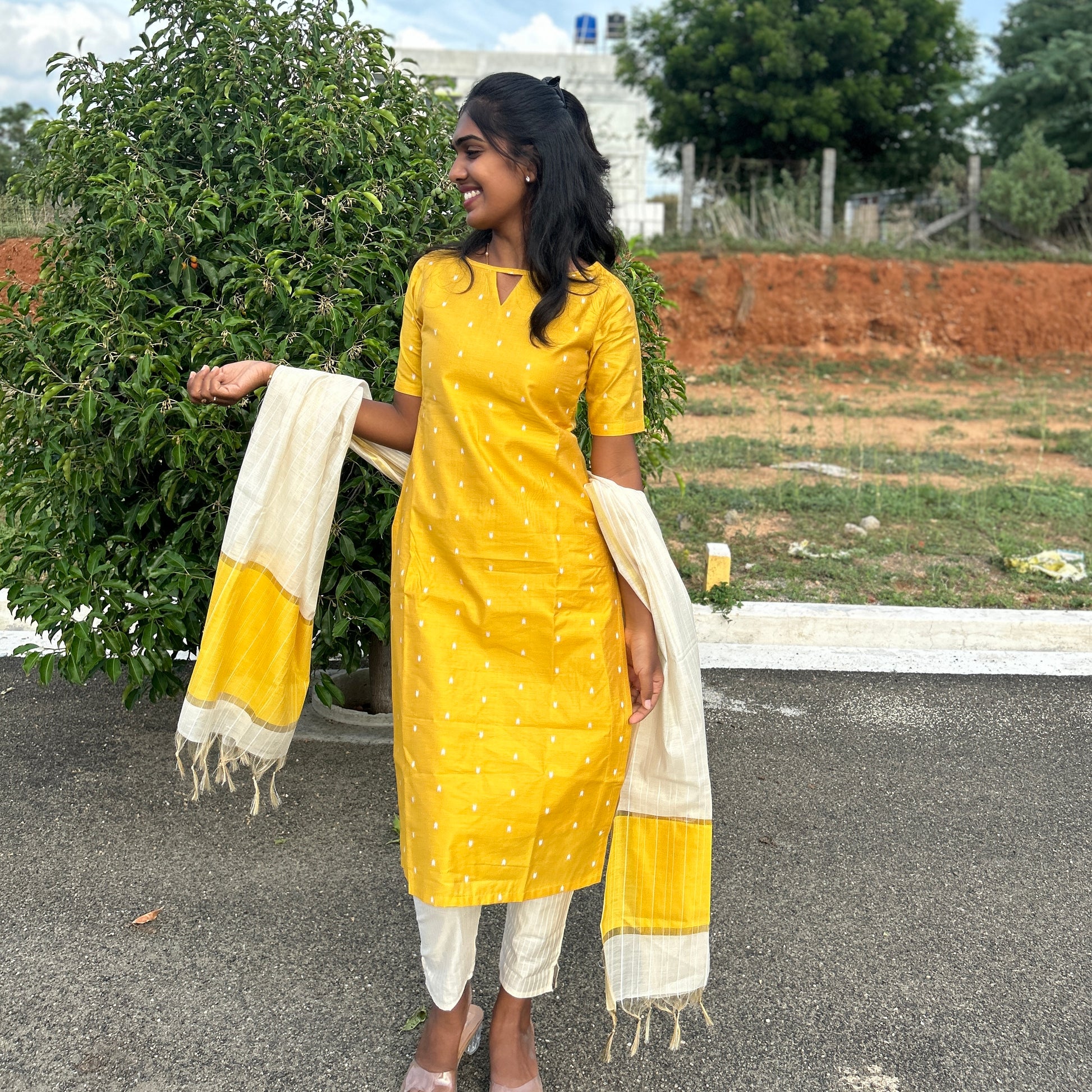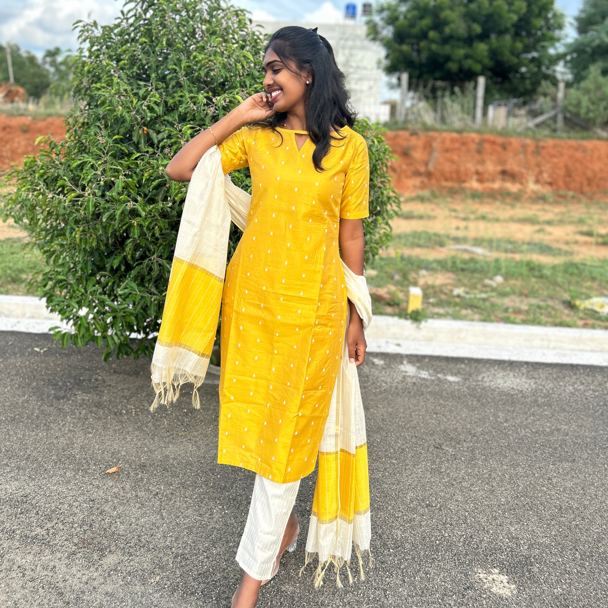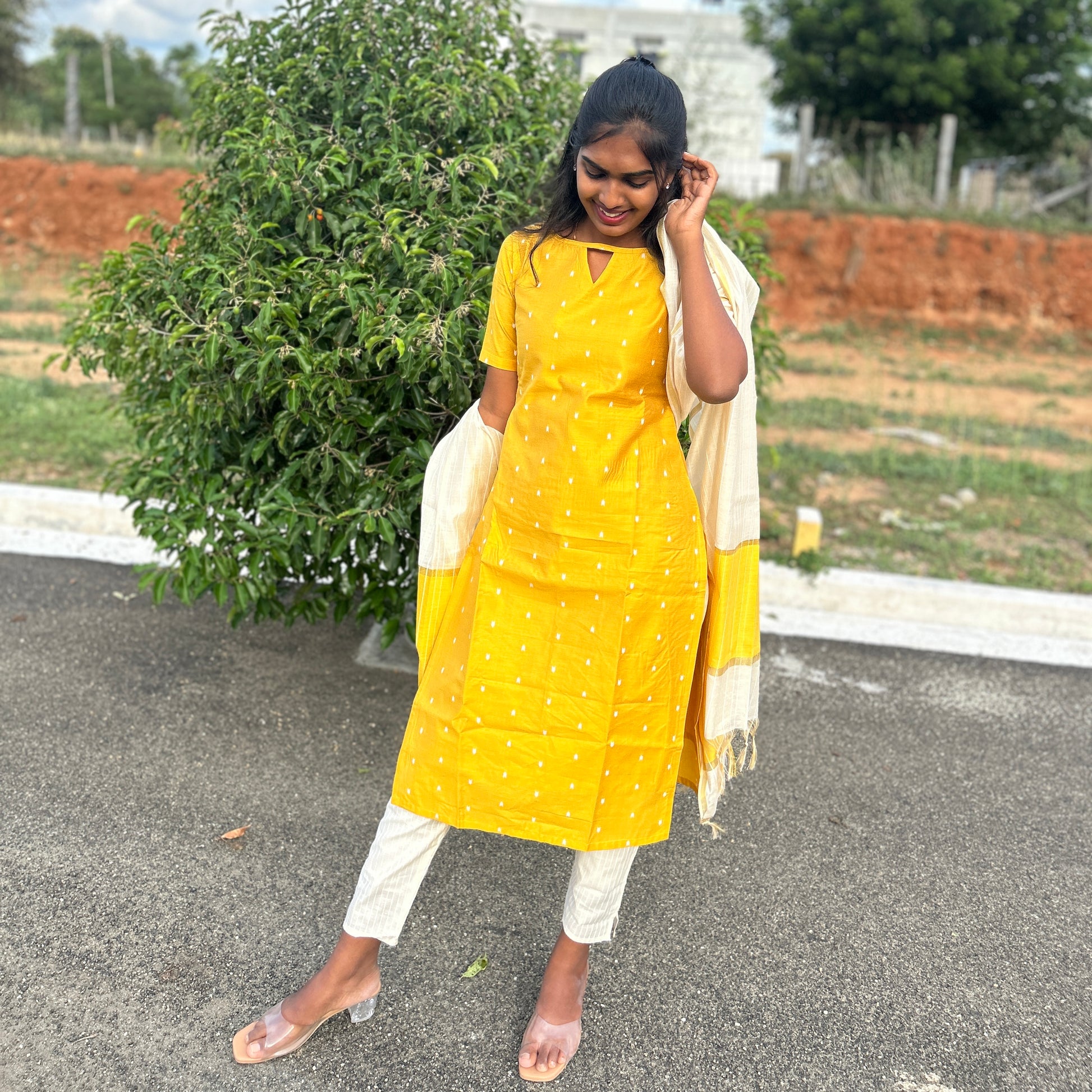Step into the festive season with "The Festival Flame Set," a perfect blend of tradition and elegance. This semi-tussar kurti set captures the warmth and spirit of Diwali, radiating with the glow of heritage and the charm of modern design. Perfect for celebrating in style, this outfit embodies grace, comfort, and a timeless festive look.