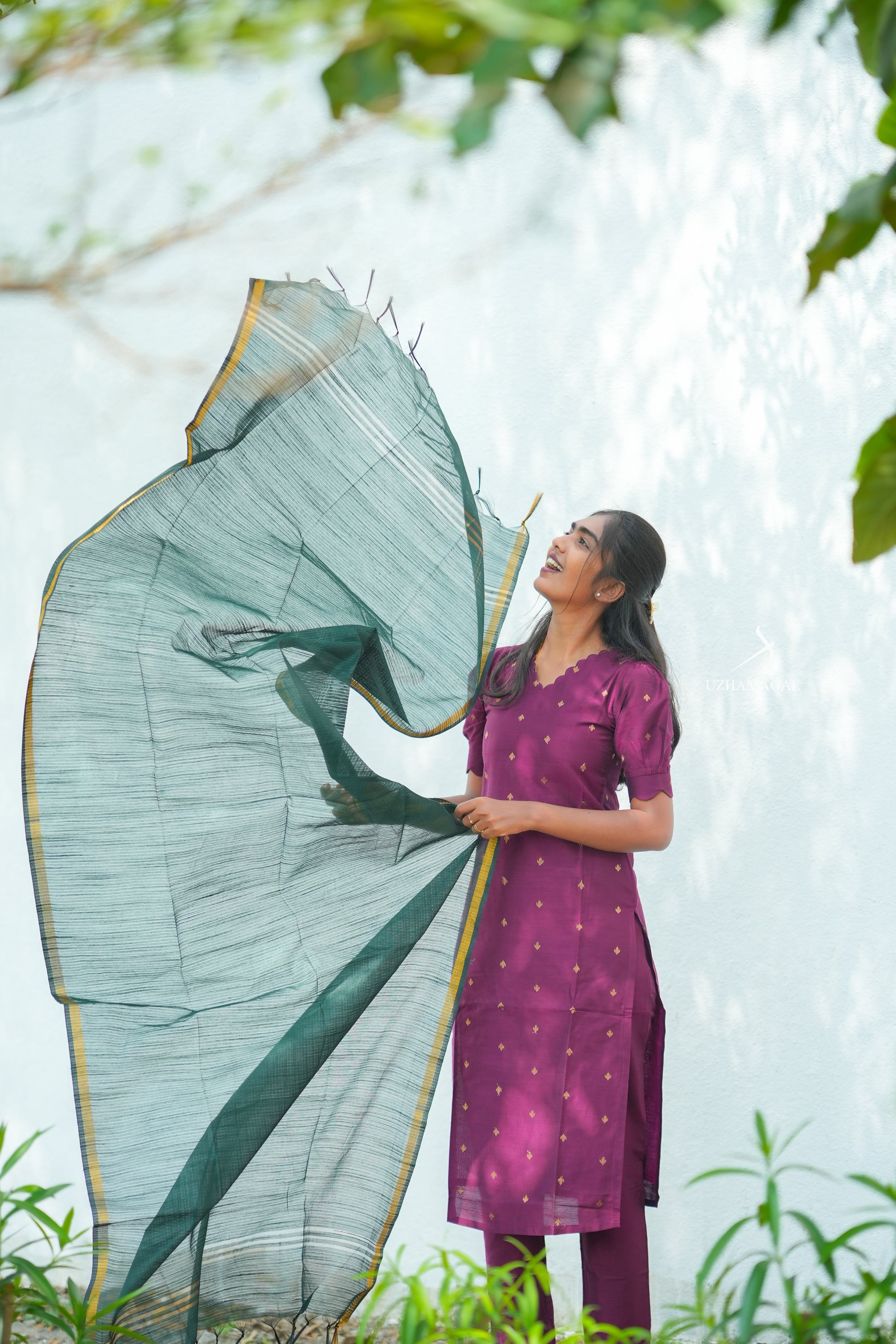 Introducing Thenmozhi, the perfect silk kurti set for your wardrobe. Featuring delicate scallop detailing at the neck and puff sleeves, this set is both elegant and comfortable. Complete the look with the included pants for a stylish and effortless outfit!
