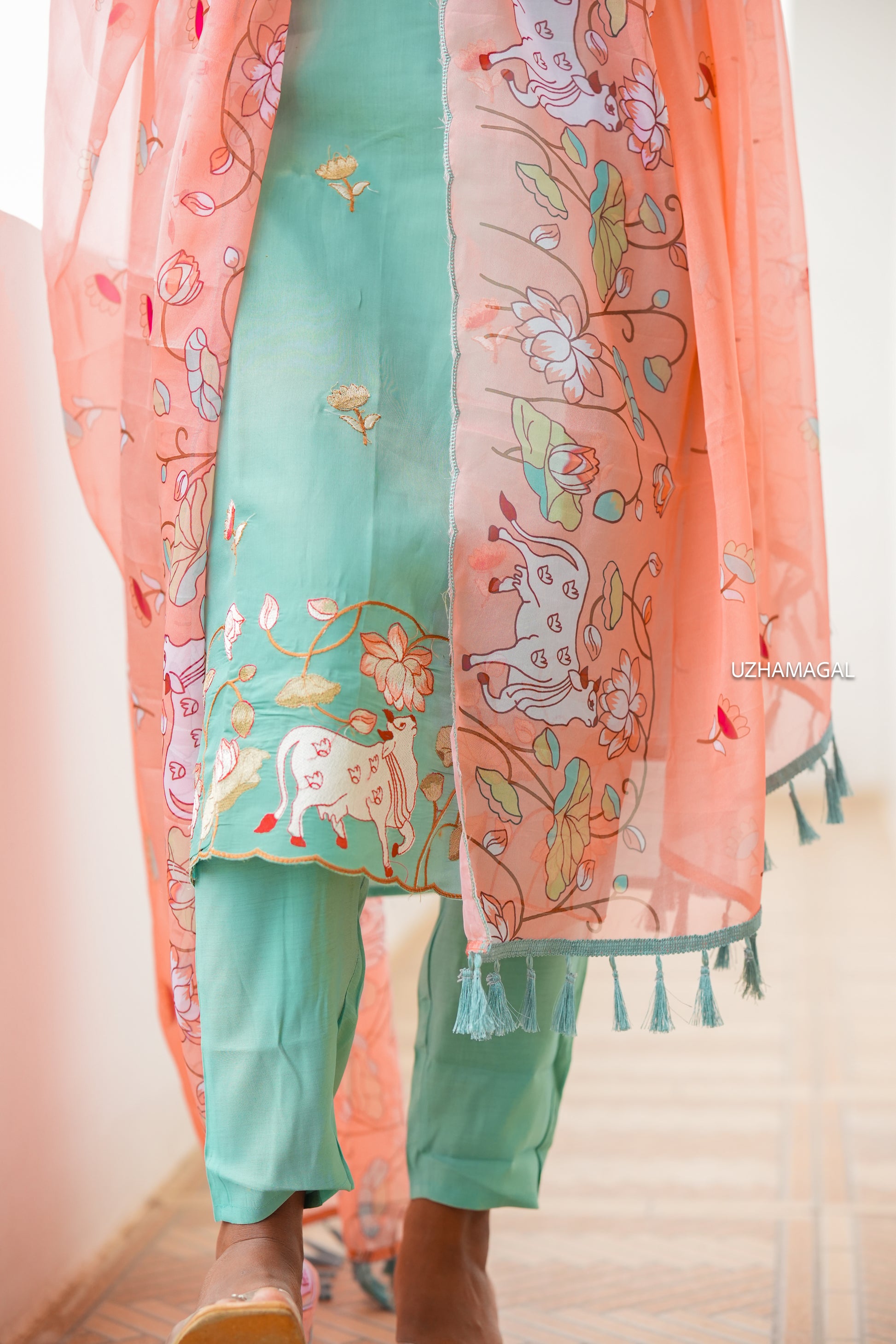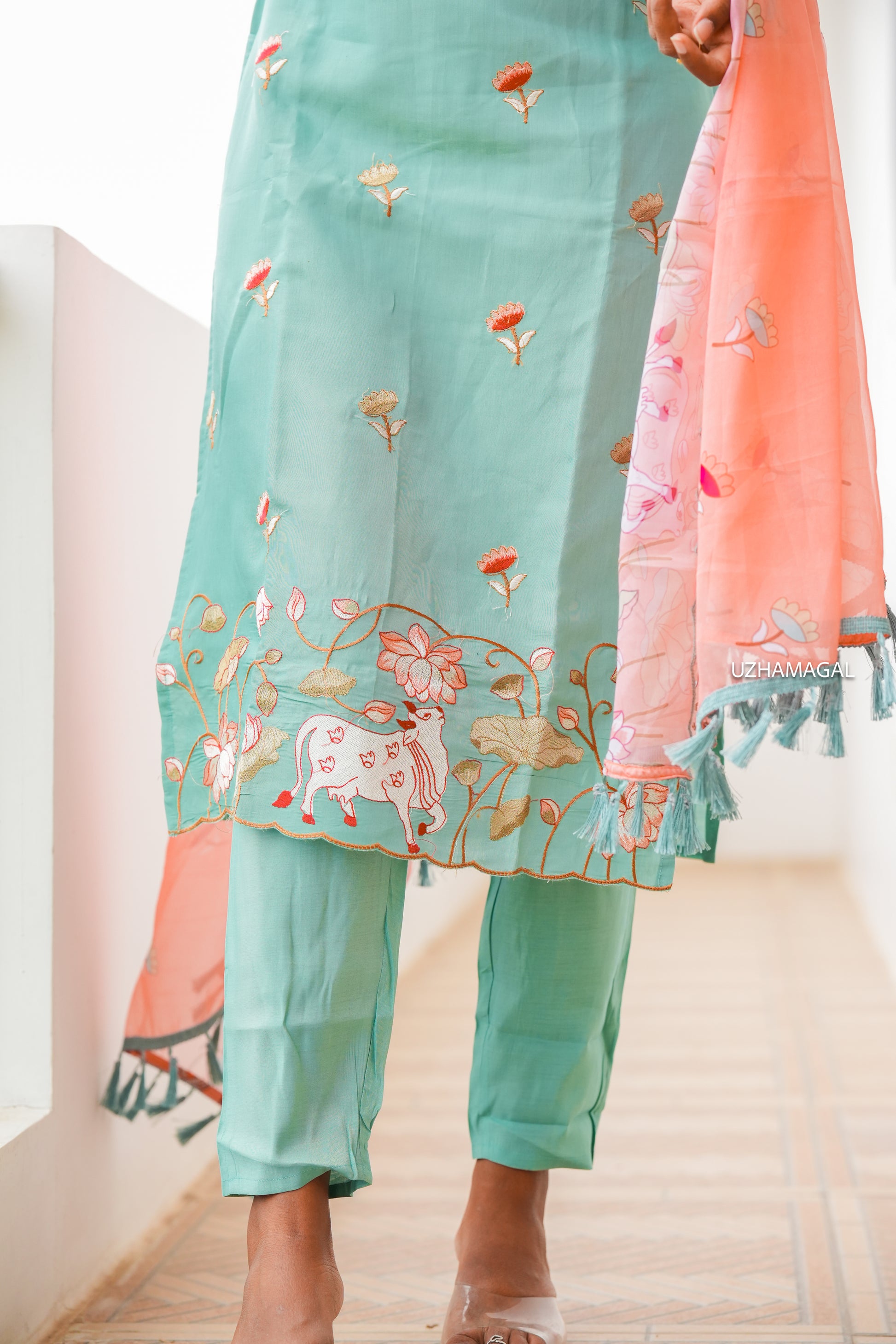 Introducing the vamika —a stunning 3-piece kurti set that celebrates timeless ethnic elegance. Crafted in soft pastel shades, this ensemble features an exquisite Nandhi embroidery design that adds a touch of traditional artistry to your wardrobe. Perfect for festive occasions, family gatherings.