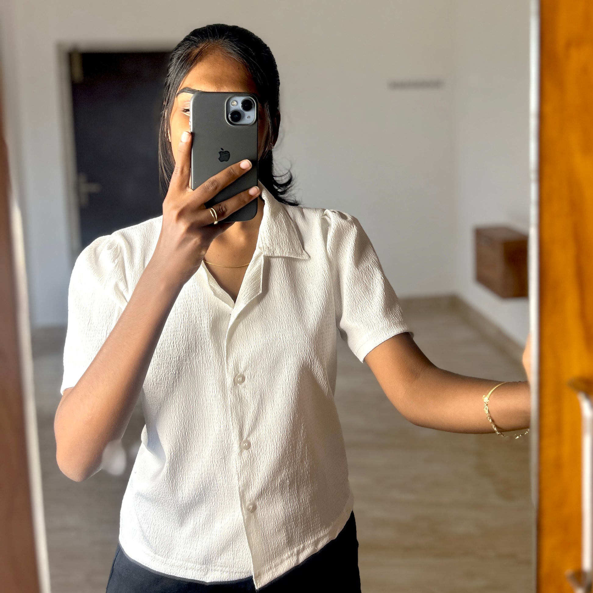 Introducing the white forest Crop Shirt - the perfect addition to your wardrobe for a classy and sophisticated look. Made with a frosty flare design, this shirt exudes elegance and style. Elevate your fashion game with this must-have piece.